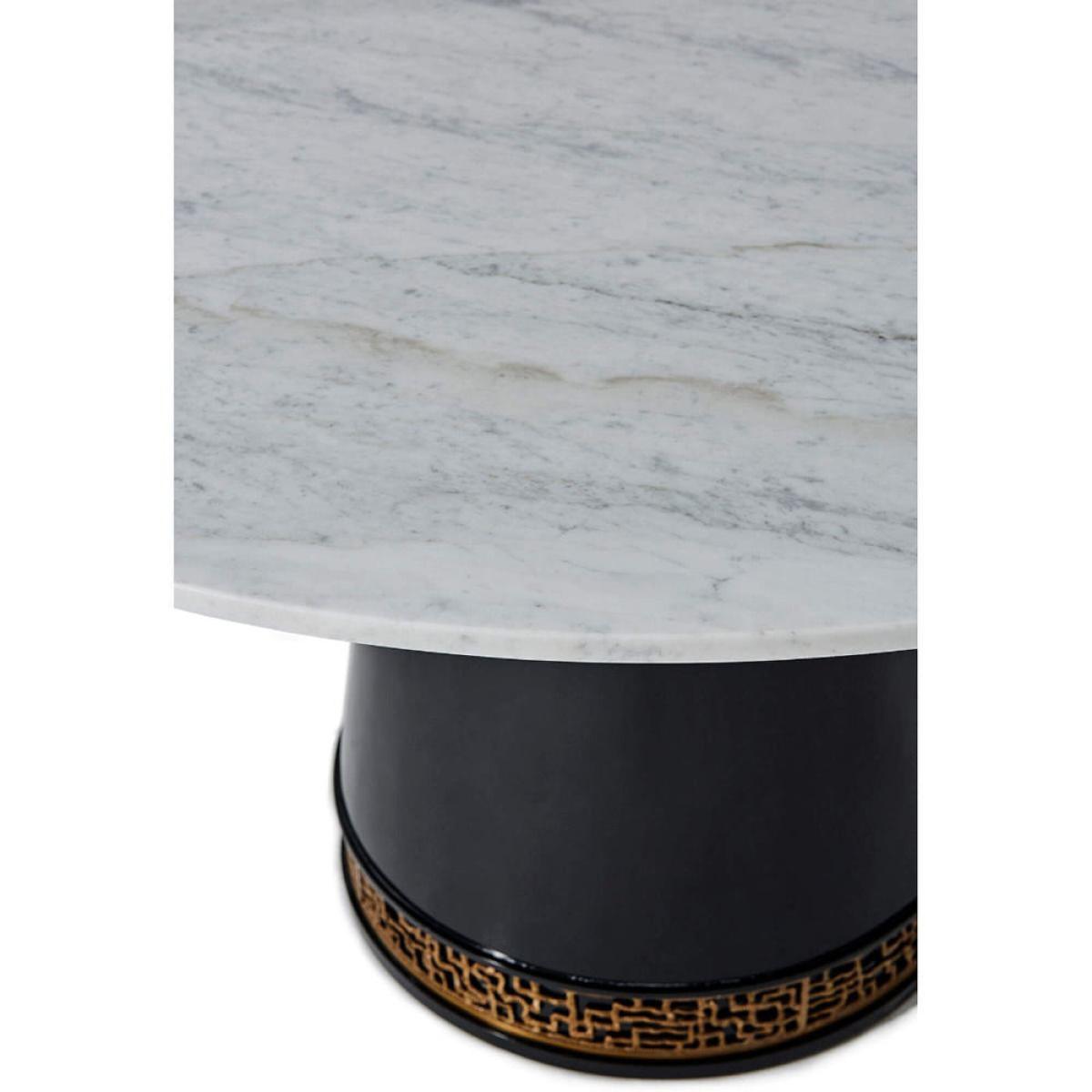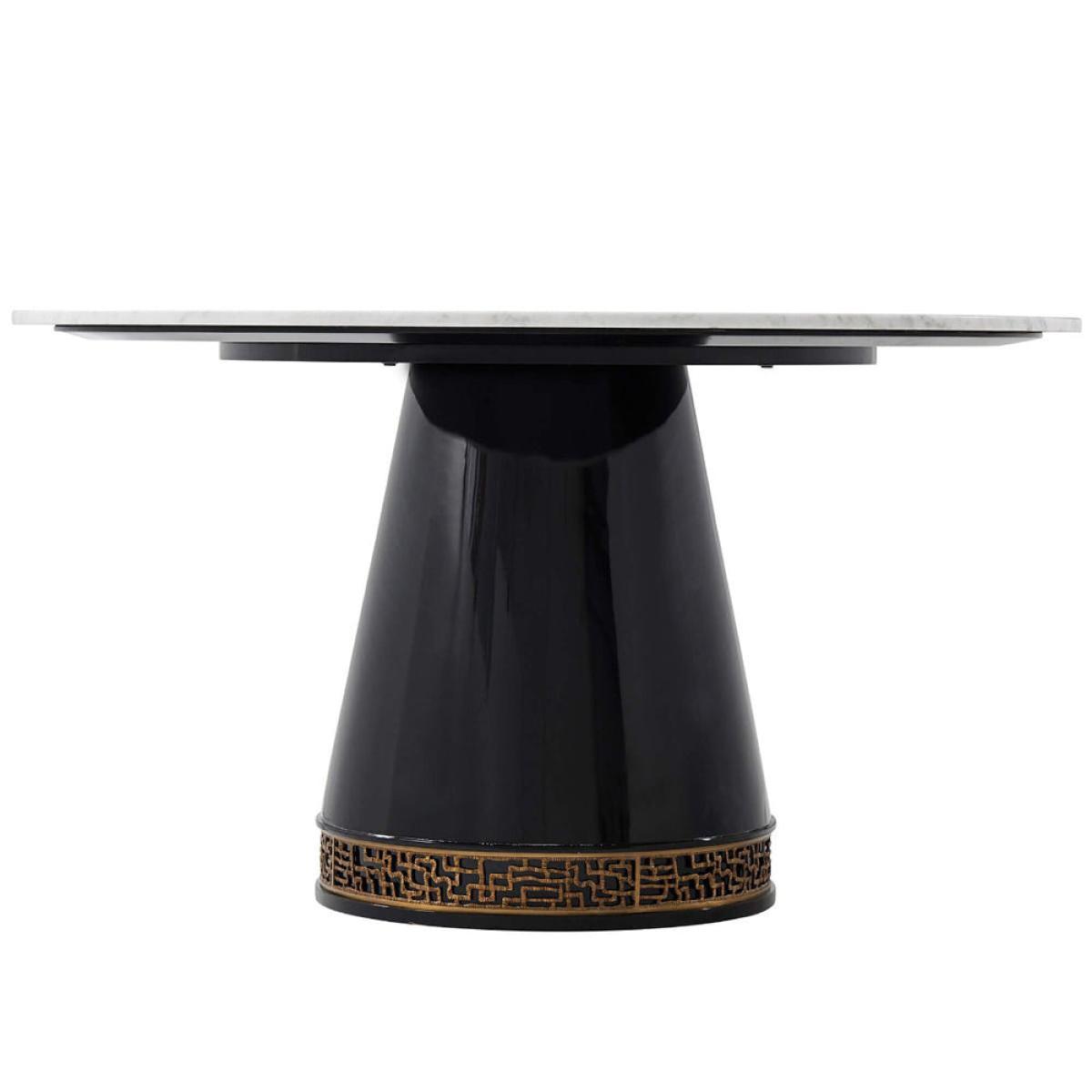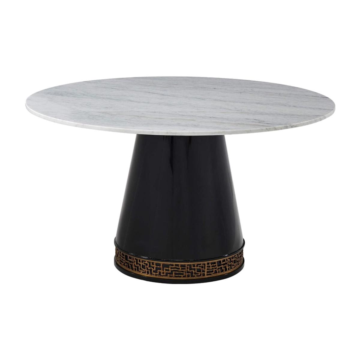Add distinctive glamour to your dining experience with the TA Studio by Theodore Alexander Bianco Dining Table Bianco Marble. This superb table features a round top of decadent Carrera marble, which will enhance any setting. A generous diameter of 137. 2cm means plenty of space for entertaining. The table top is supported by an elegant ebonised base in black that is a cone shape. The support has a moulded and recessed base that has gorgeous inlay fretwork in golden textured bronze. The black base and the subtle patterns of the marble complement each other to create a beautiful piece of furniture that will add great style to your décor. *Moot Trading Ltd is not a lender and acts only as an introducer. The credit product is provided by Klarna Bank AB (publ). Credit is only available to permanent UK residents aged 18 and over, subject to status. Terms and conditions apply. Please note that the following products are not regulated by the FCA: Pay in 30 days and Pay in 3 instalments. Read More.