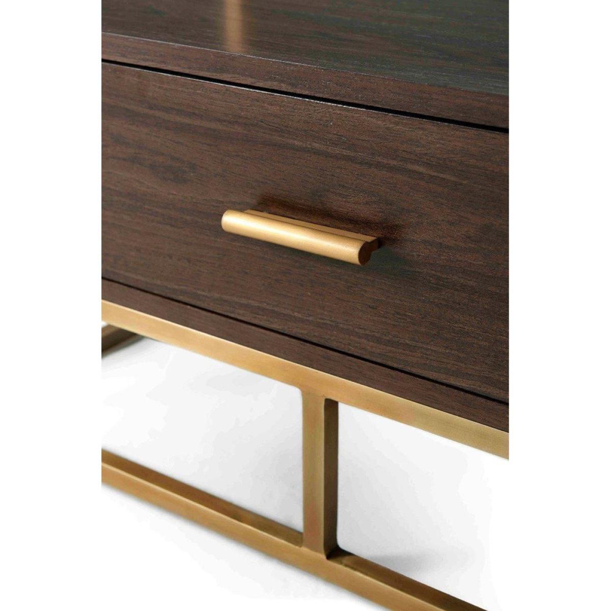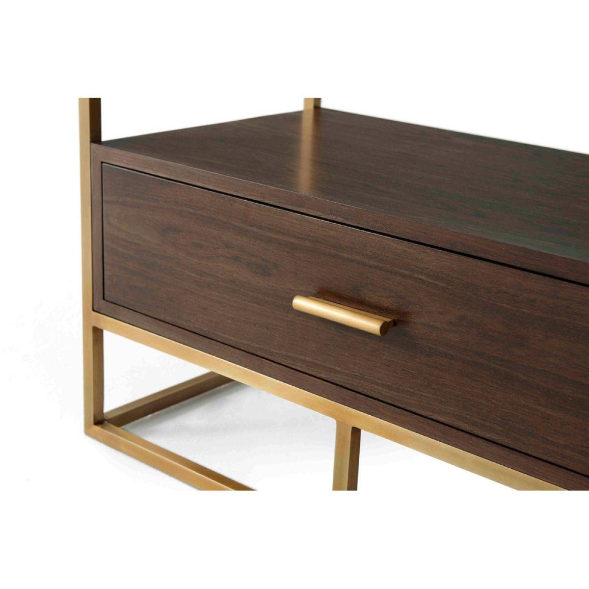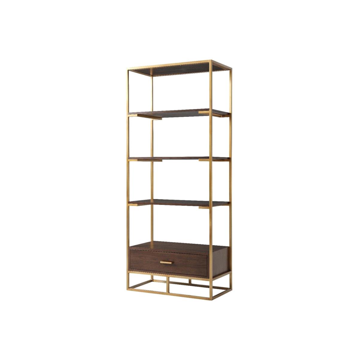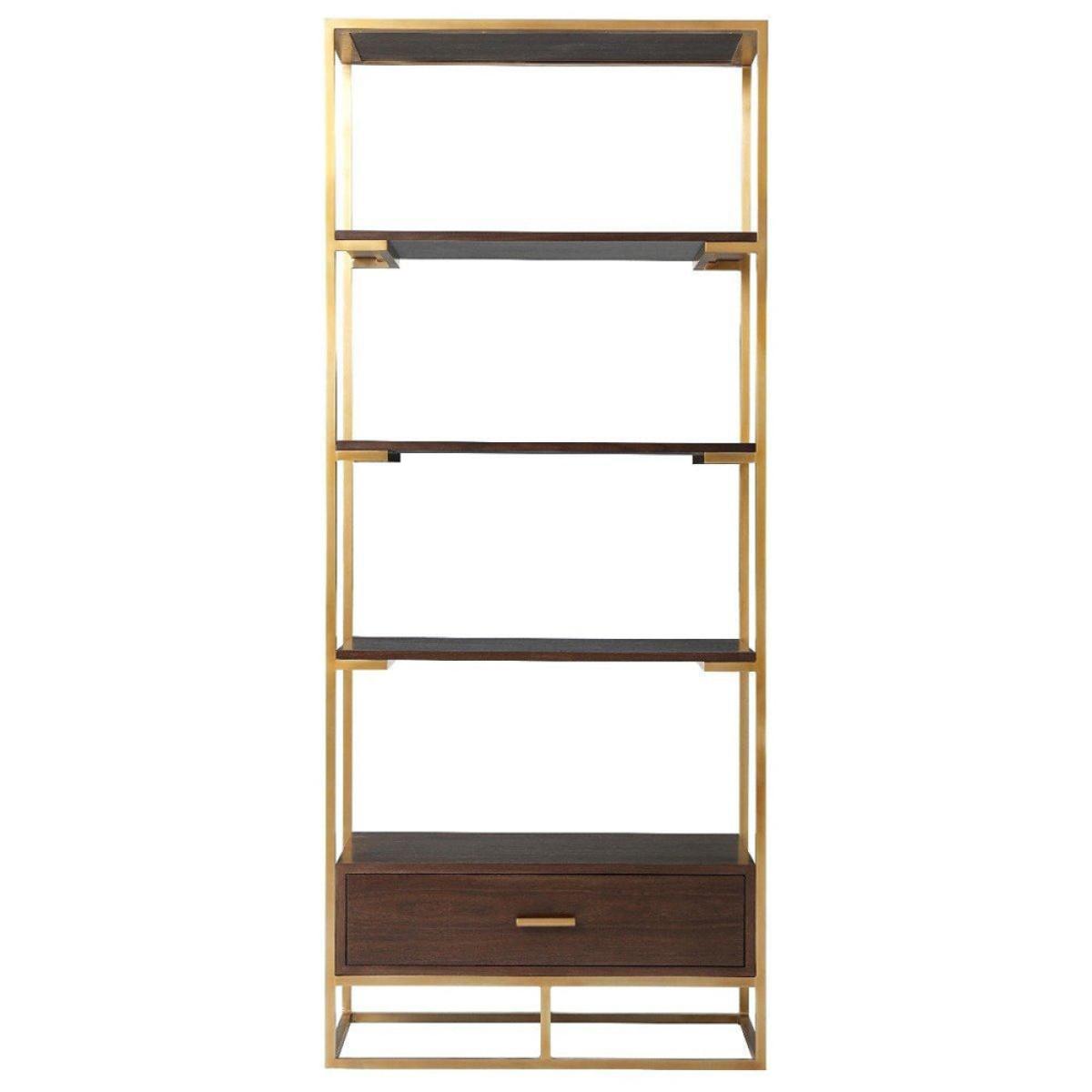 The Fisher shelving unit from TA Studio by Theodore Alexander offers a very airy and stylish way to embellish a room. The unit features open dark wooden shelves within a slim brass finished frame a. View More. The Fisher shelving unit from TA Studio by Theodore Alexander offers a very airy and stylish way to embellish a room. The unit features open dark wooden shelves within a slim brass finished frame and has a very useful matching storage drawer in the base for storing smaller items. This design will be perfect for a variety of rooms; for storing books and games in a recreation room, files and equipment in the office, linen in a bedroom, photographs and ornaments in your sitting room or plants in the conservatory. The unit measures 205. 7cms high, 86. 4cms wide and 45. 7cms deep so there's plenty of space for everything.