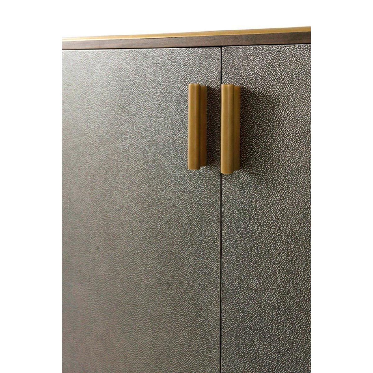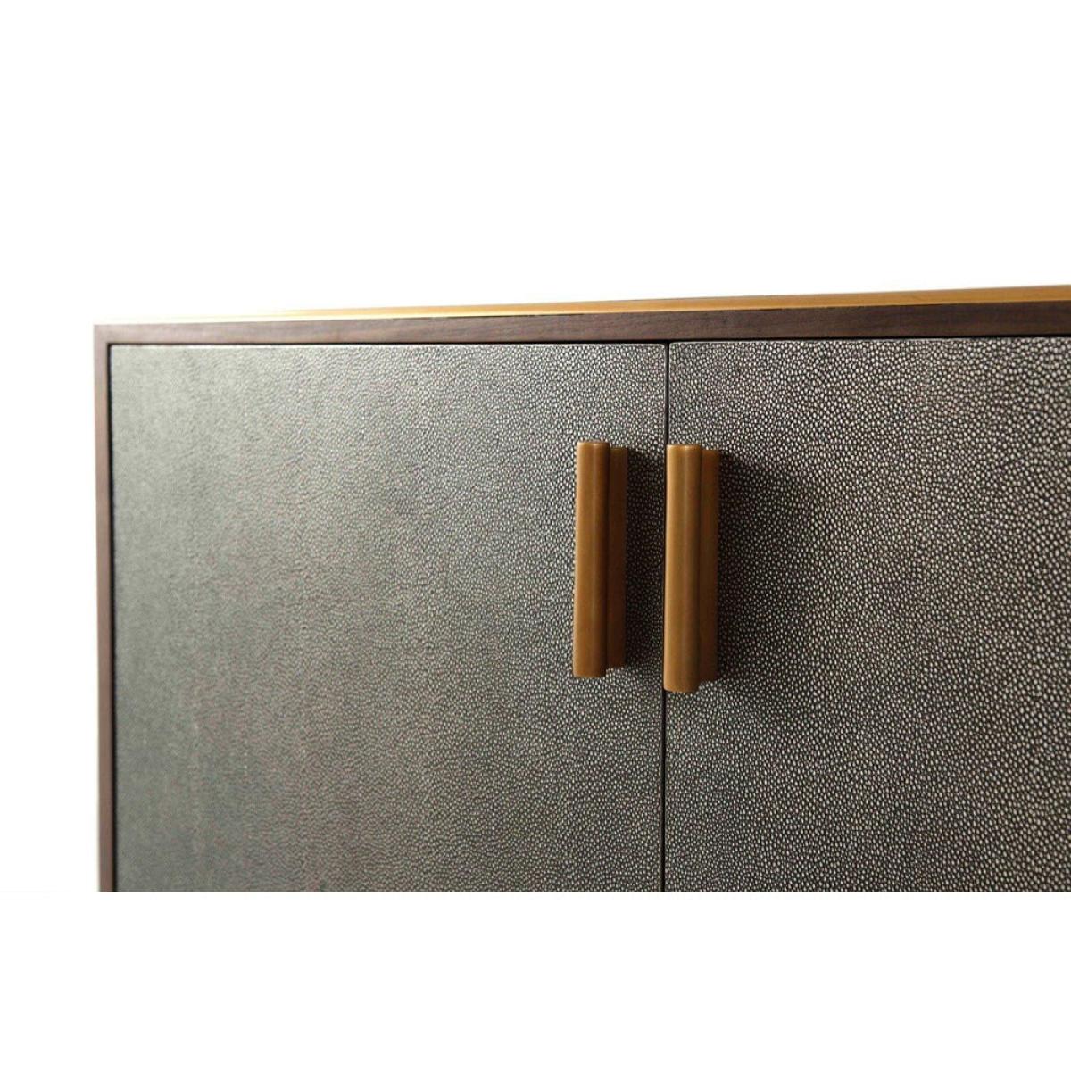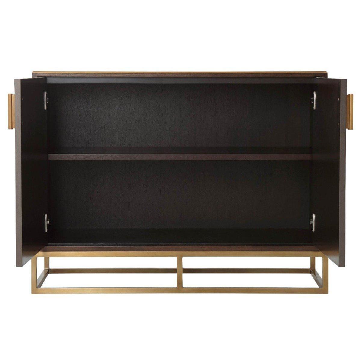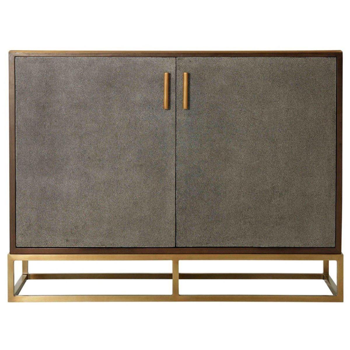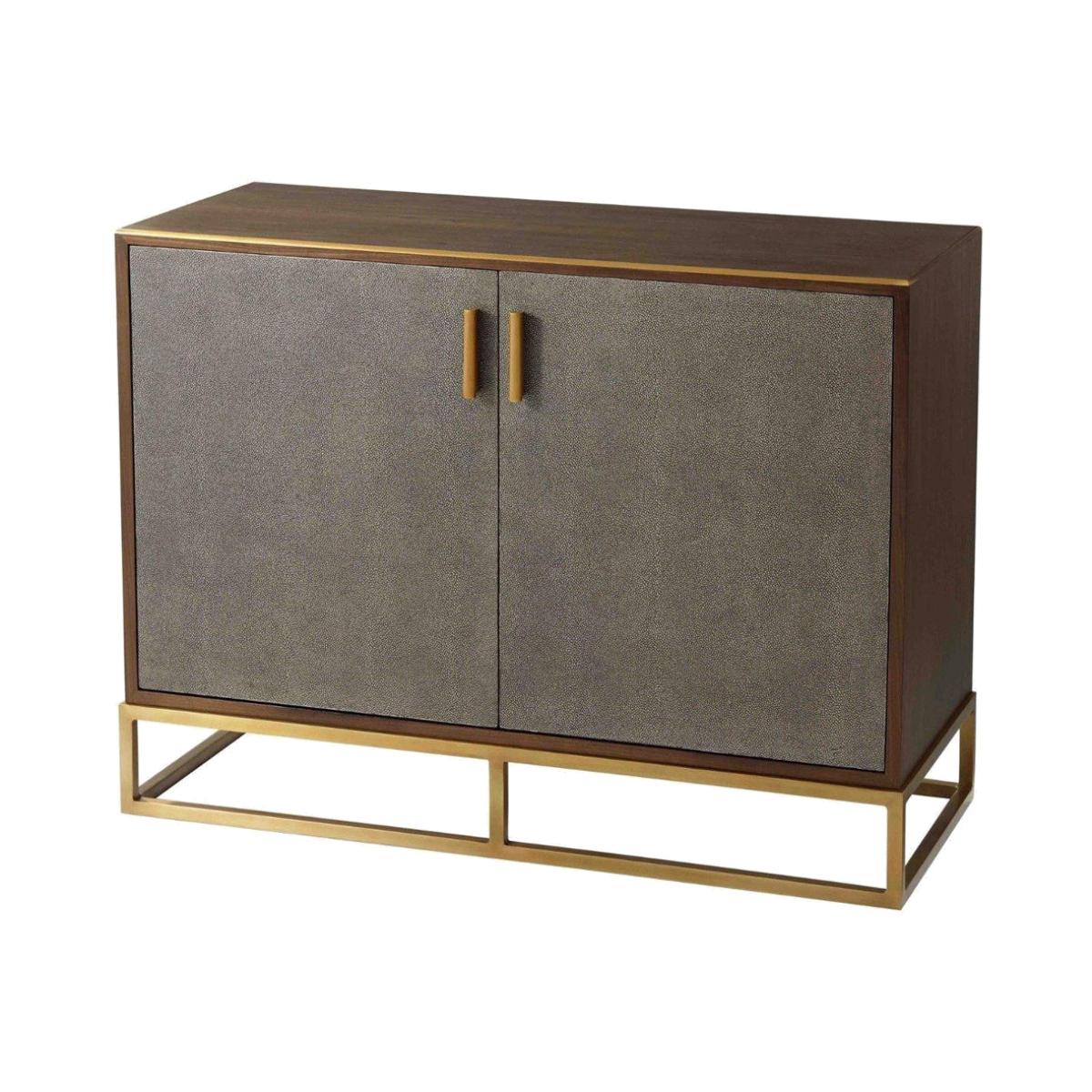 The TA Studio by Theodore Alexander Collection Huett cabinet is small, contemporary and perfectly shaped. The polished metallic trim on the base, handles and moulding teams wonderfully with the inl. View More. The TA Studio by Theodore Alexander Collection Huett cabinet is small, contemporary and perfectly shaped. The polished metallic trim on the base, handles and moulding teams wonderfully with the inlaid untanned leather doors with their luxurious shagreen leather textured surface; what's more, the polished brass handles and base provide the perfect frame. Inside, a shelf provides versatile storage space and the walnut-grained wood veneer case finished in warm macadamia is wonderfully complementary to items such as photo frames, flowers or a small sculpture. With dimensions of 80cm high, 107cm wide and 45cm deep, the stylish TA Studio Huett cabinet will create a beautiful focal point in your home.
