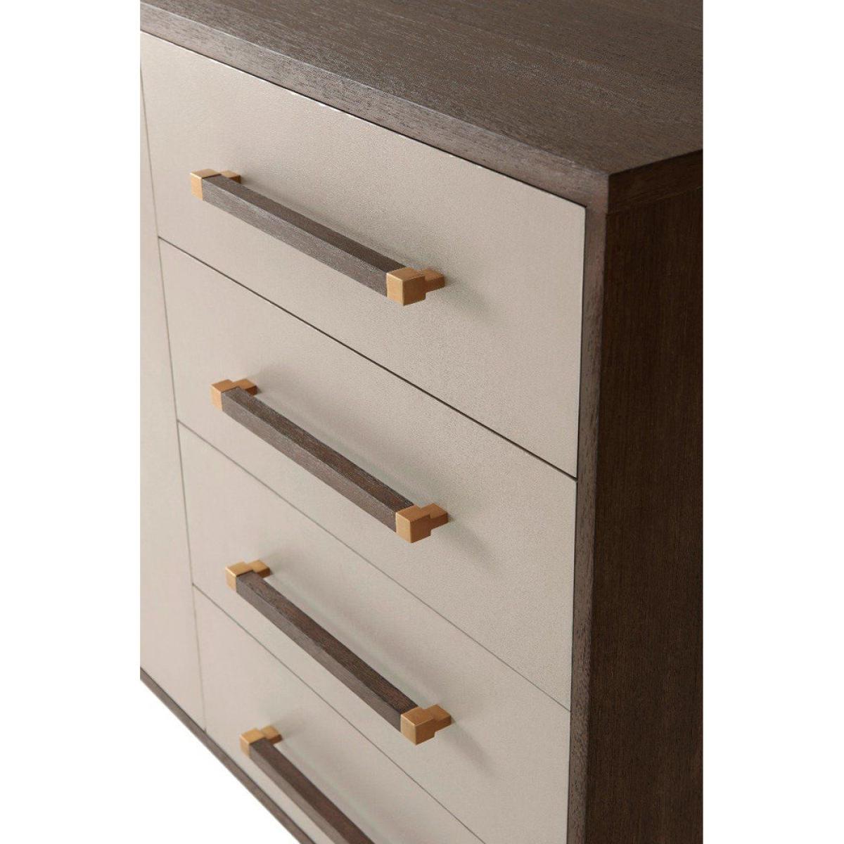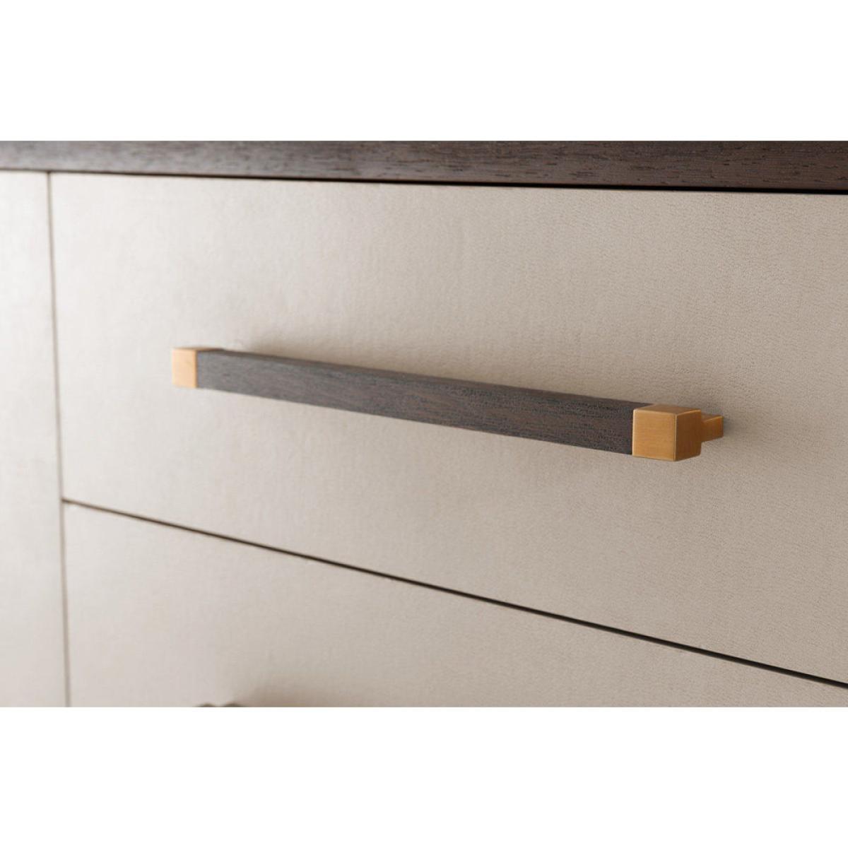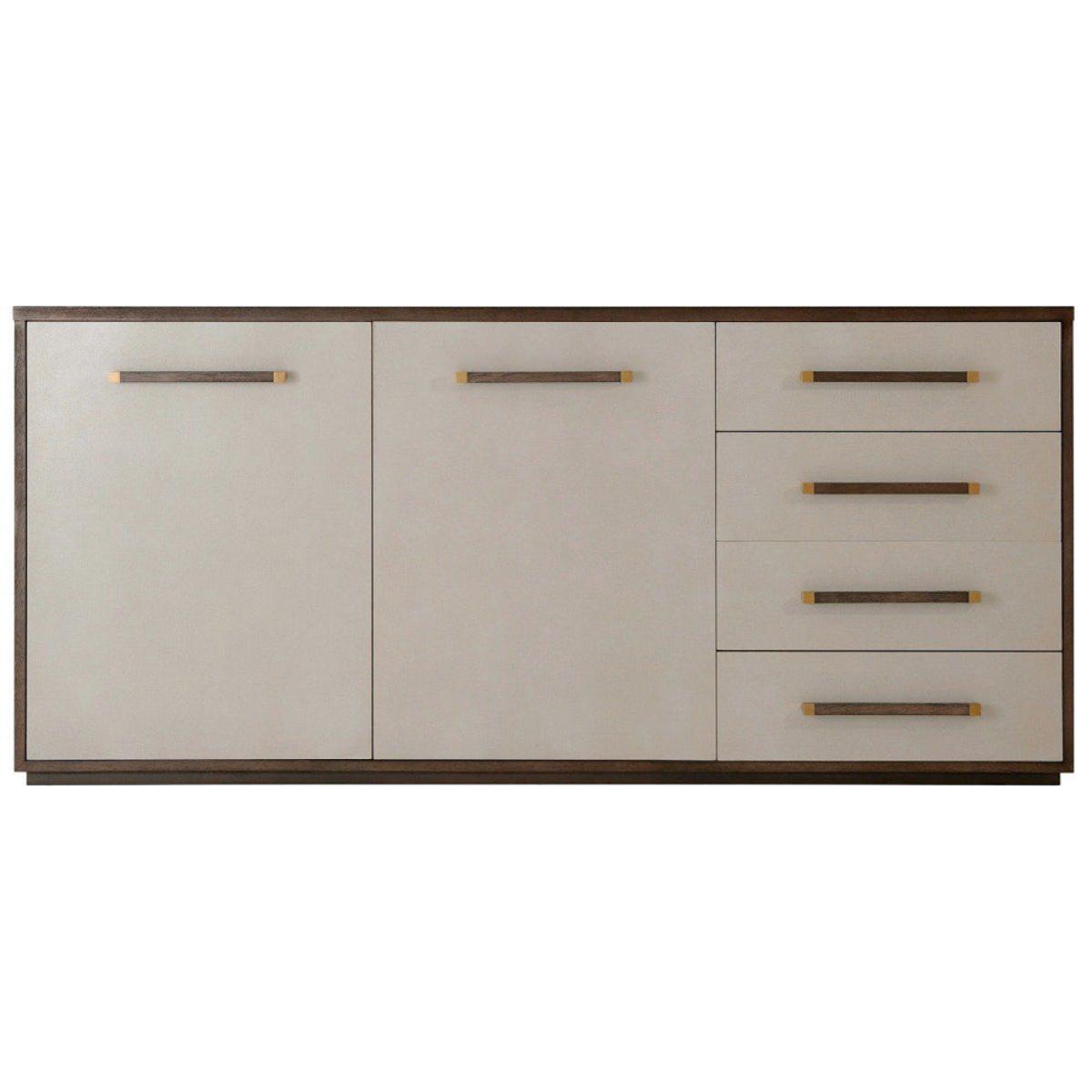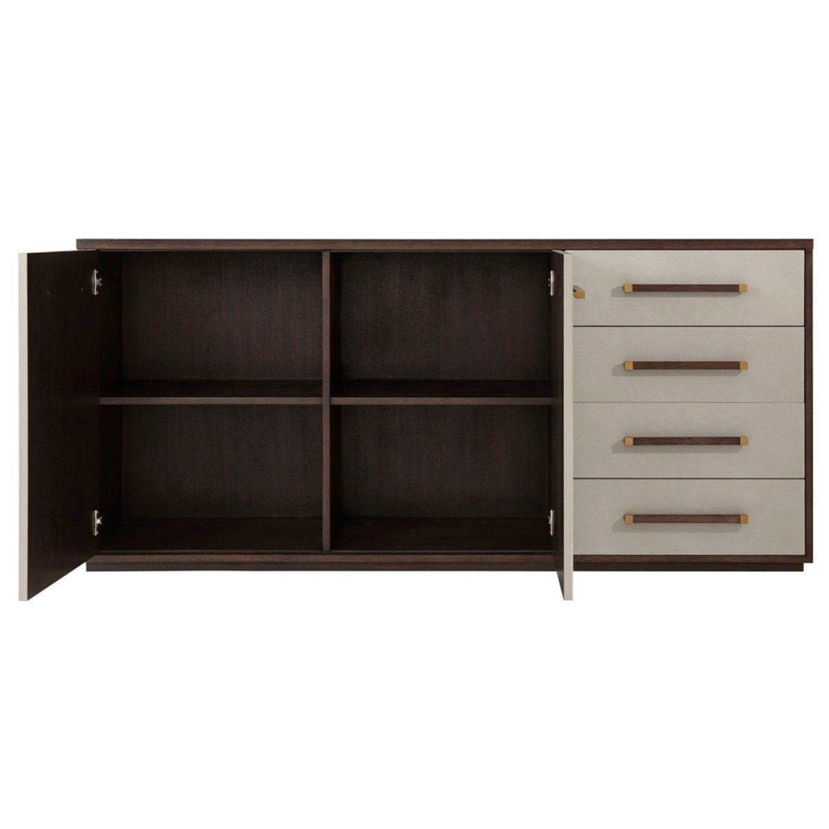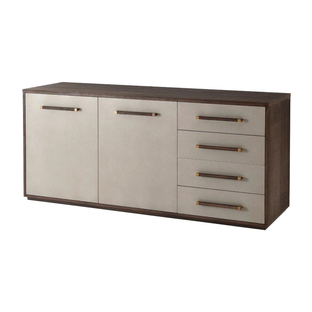 TA Studio by Theodore Alexander presents the wonderfully beautiful and endlessly useful Passal sideboard. The handcrafted frame is created from Lati veneer and finished in a rich cardamon stain, which serves to accentuate the grain of the wood. The large Passal sideboard boasts four drawers and a large cupboard section, the perfect item of furniture in which to tuck away all of your bits and pieces. Brushed brass detailing on the handles of the drawers and cabinet doors add a delicate contrast to the leather wrapped fronts. Measuring at : H: 85. 1 x W: 184. 8 x D: 55. 9 cm, it's the perfect storage solution for your home. *Moot Trading Ltd is not a lender and acts only as an introducer. The credit product is provided by Klarna Bank AB (publ). Credit is only available to permanent UK residents aged 18 and over, subject to status. Terms and conditions apply. Please note that the following products are not regulated by the FCA: Pay in 30 days and Pay in 3 instalments. Read More.
