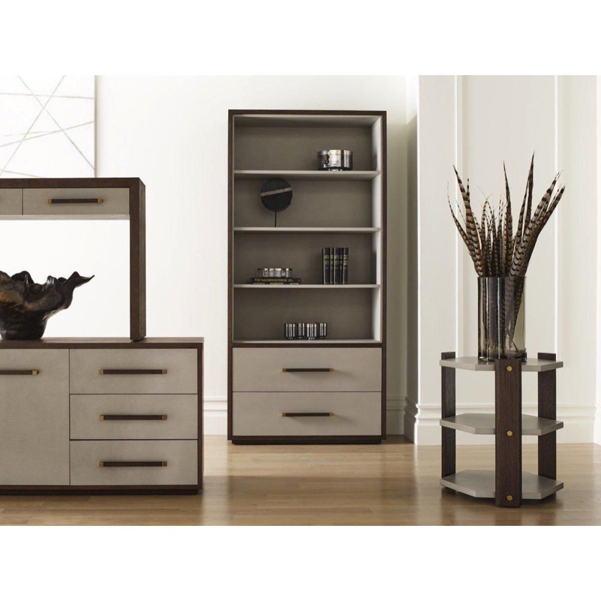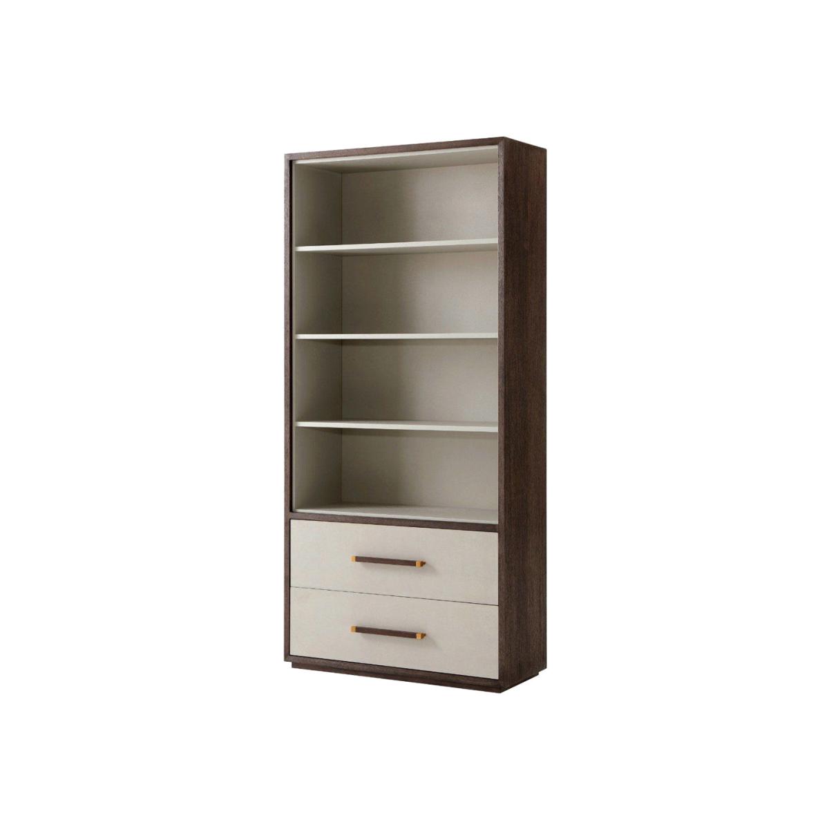 This stylish bookcase from TA Studio by Theodore Alexander combines modern simplicity with timeless versatility to create a piece that would enhance almost any domestic or commercial setting. The i. View More. This stylish bookcase from TA Studio by Theodore Alexander combines modern simplicity with timeless versatility to create a piece that would enhance almost any domestic or commercial setting. The inset shelving and drawers are wrapped in luxurious leather, creating a sophisticated contrast with the handcrafted frame. Clean lines create an elegant simplicity that would fit in anywhere from a contemporary apartment to a more traditional family home. Measuring 203. 2cm tall, 96. 5cm wide and 38. 1cm deep, it is perfectly proportioned for rooms of all sizes and would work as part of a pair in larger spaces. It has an artisan quality and would perfectly complement other pieces from the same range.
