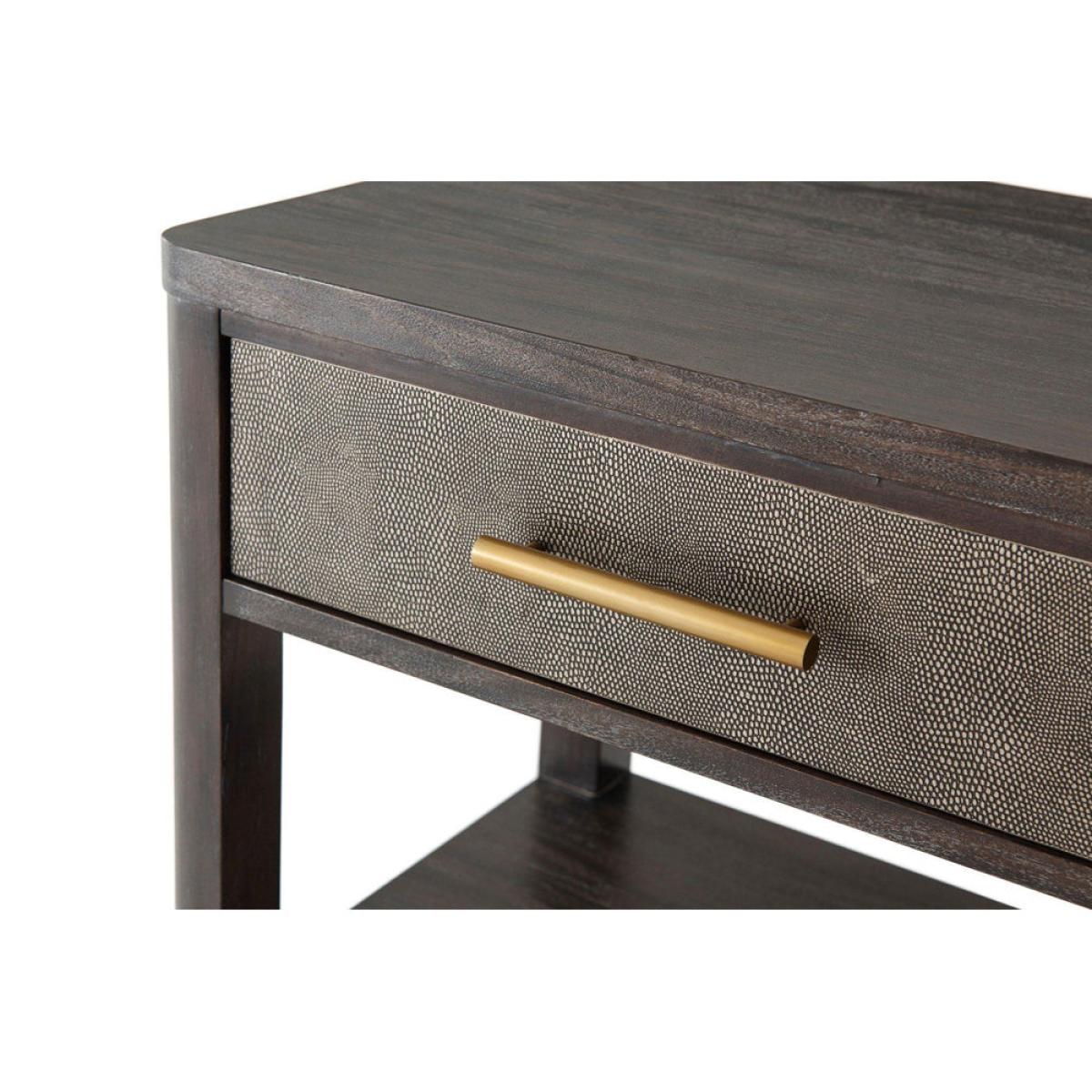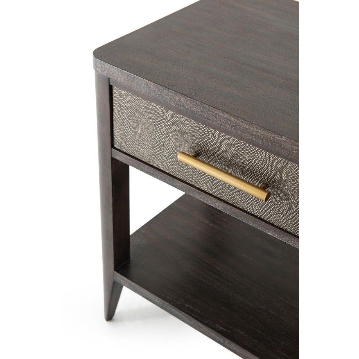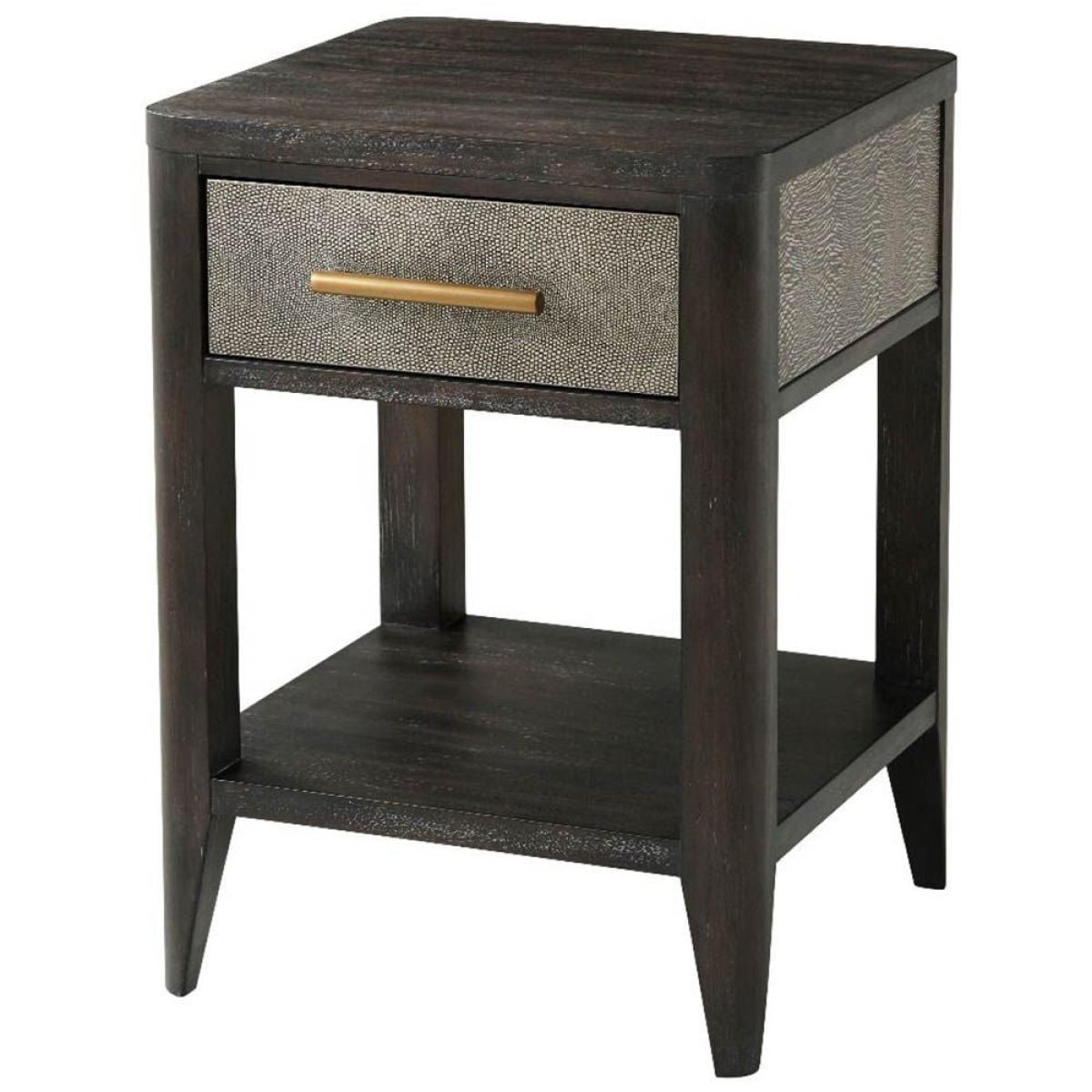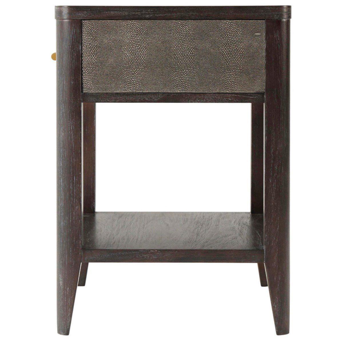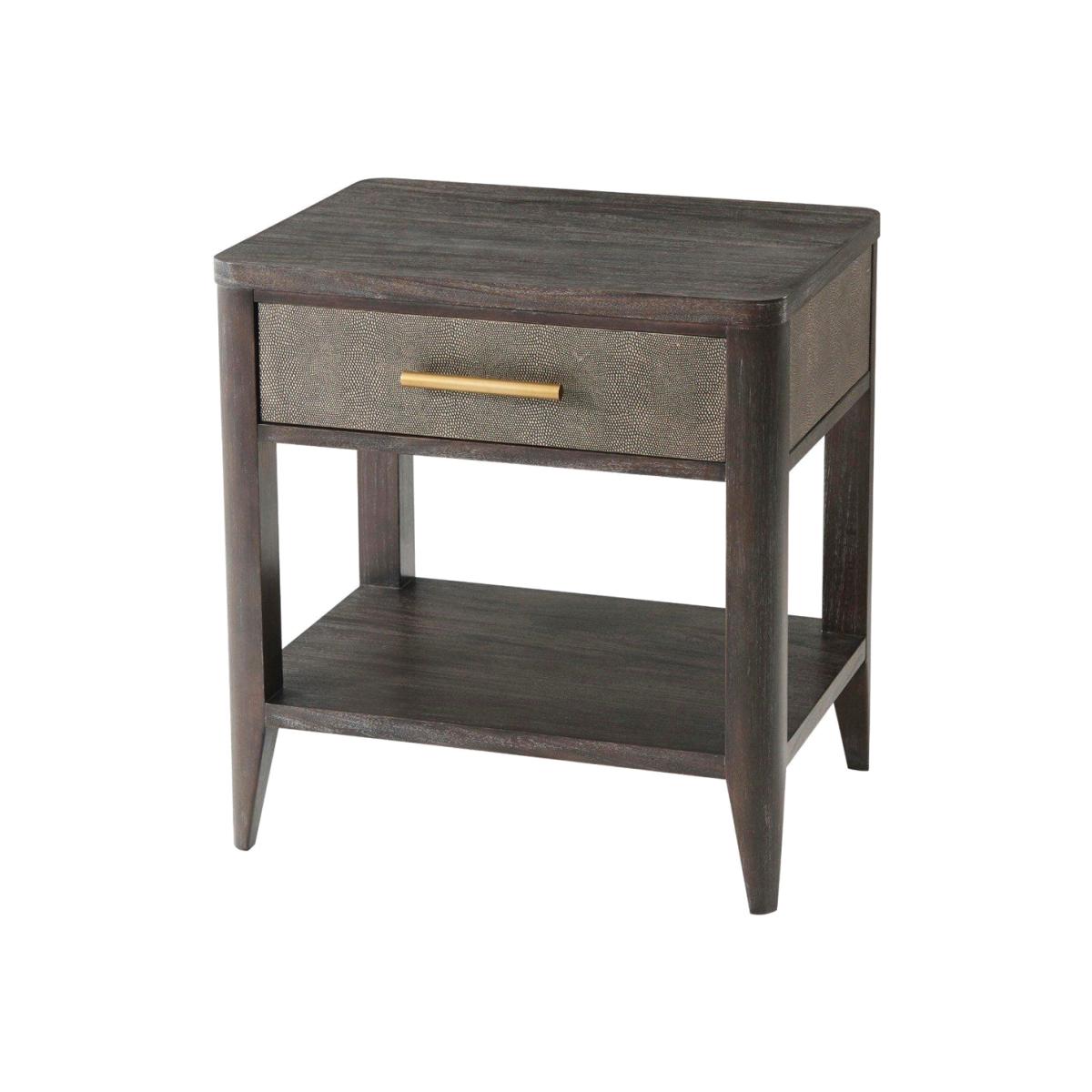 A subtle yet distinctive range of luxurious materials combined in the creation of the TA Studio by Theodore Alexander collection York bedside table. A stunning amalgam of quality finishes and text. View More. A subtle yet distinctive range of luxurious materials combined in the creation of the TA Studio by Theodore Alexander collection York bedside table. A stunning amalgam of quality finishes and textures, this superb bedside table is beautifully designed to capture the natural grain of mangrove wood. Featuring a top surface, drawer and lower surface, this table packs a range of practical storage features into its compact dimensions. The drawer is faced with textured leather in a contrasting shade of cream to provide a sumptuous focal point. Its handles are minimalist and elegant in silver, adding another contrasting element in what is a multifaceted but harmonious whole.