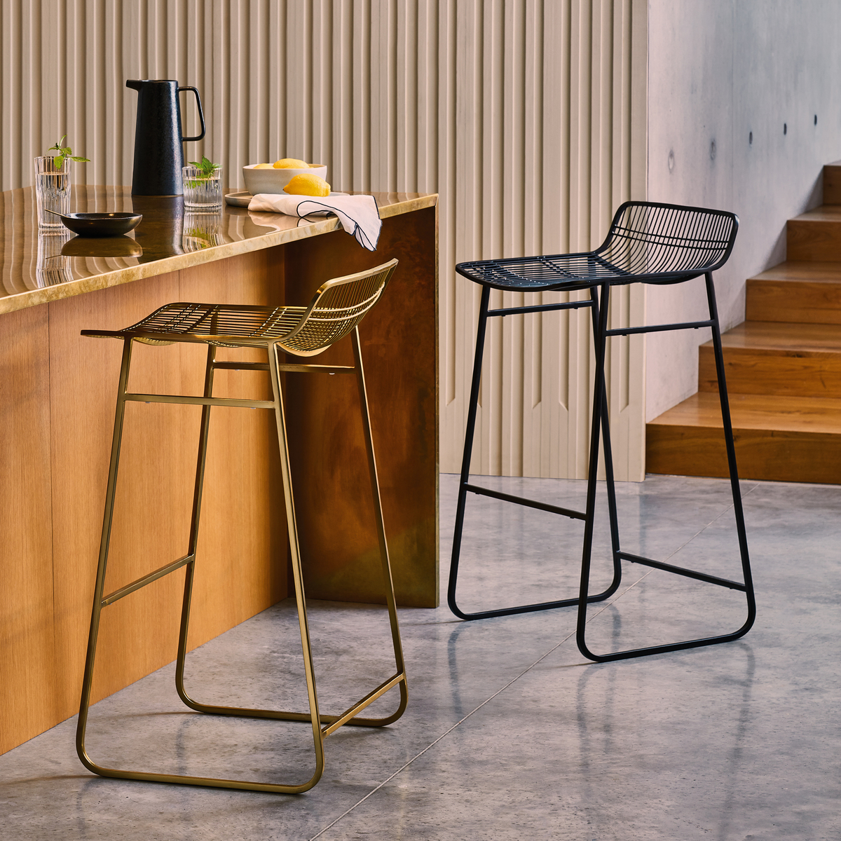 I love this black wire stool because of its sleek, minimalist design that works well in modern, industrial, and contemporary interiors. Its open-wire structure adds a touch of lightness, making it ideal for smaller spaces or for creating an airy feel around a breakfast bar or high table. Practical styling tips include pairing it with a cosy, patterned seat pad to add comfort and colour, or placing it next to natural materials like reclaimed wood or concrete to enhance an industrial vibe. It’s versatile enough to be used in kitchen islands, cafés, or even outdoor terraces, where its durable metal frame will stand up to the elements.