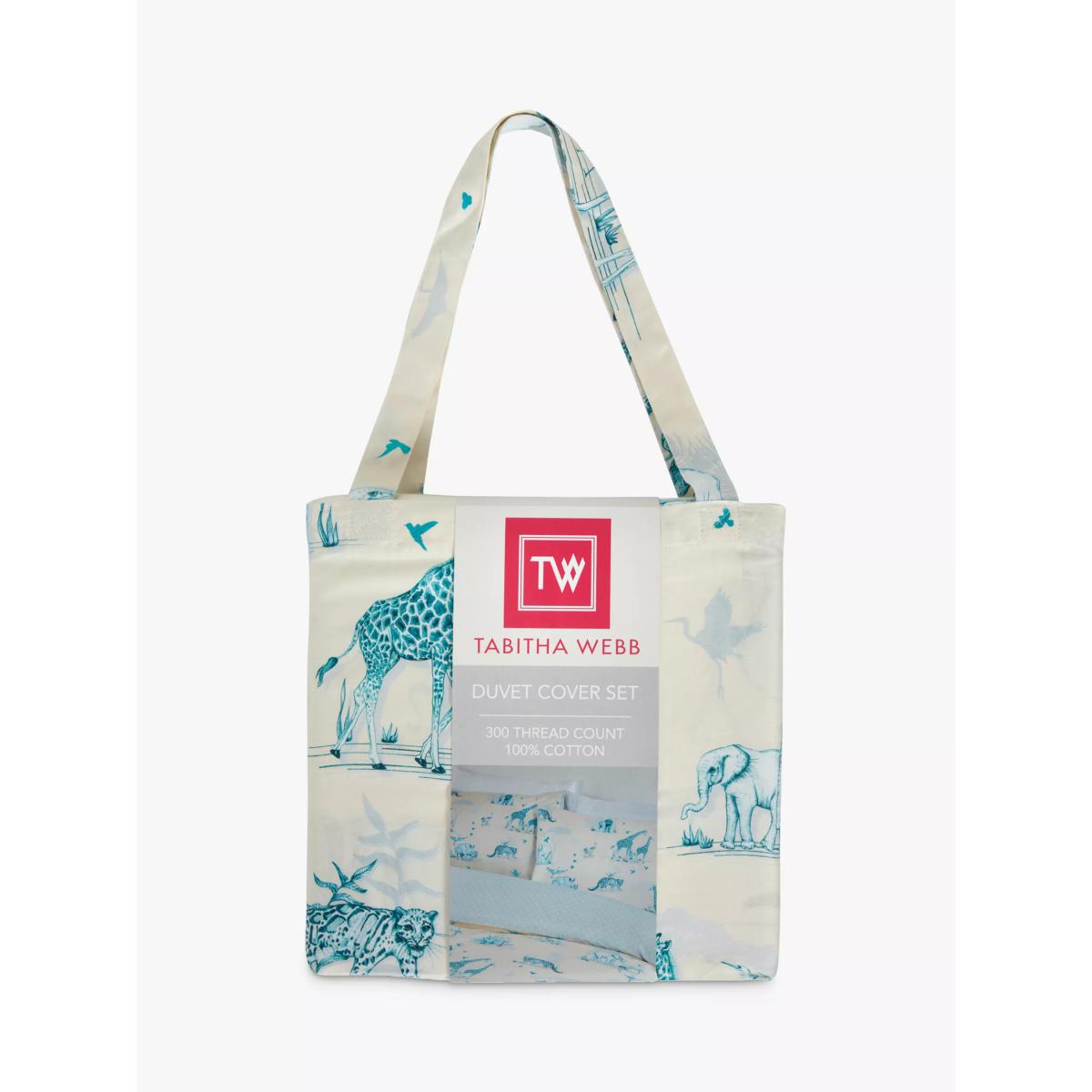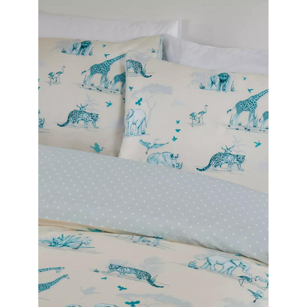 Tabitha Webb's Safari design features digitally printed African animal sketches, with a coordinating reverse of small dot patterns matching the light duck egg and soft ivory colour theme. Woven in pure, combed cotton 300 thread count sateen, this fabric is beautifully soft and silky, helping you to relax and enjoy a comfortable nights sleep. The single set comes with one standard pillowcase, while the double, king and super king sets come with two standard pillowcases. Bedding sizes To fit duvet/pillow size (cm) Standard pillowcase, L75 x W50cm Single duvet cover, L200 x W135cm Double duvet cover, L200 x W200cm King duvet cover, L220 x W225cm Super king duvet cover, L220 x W260cm