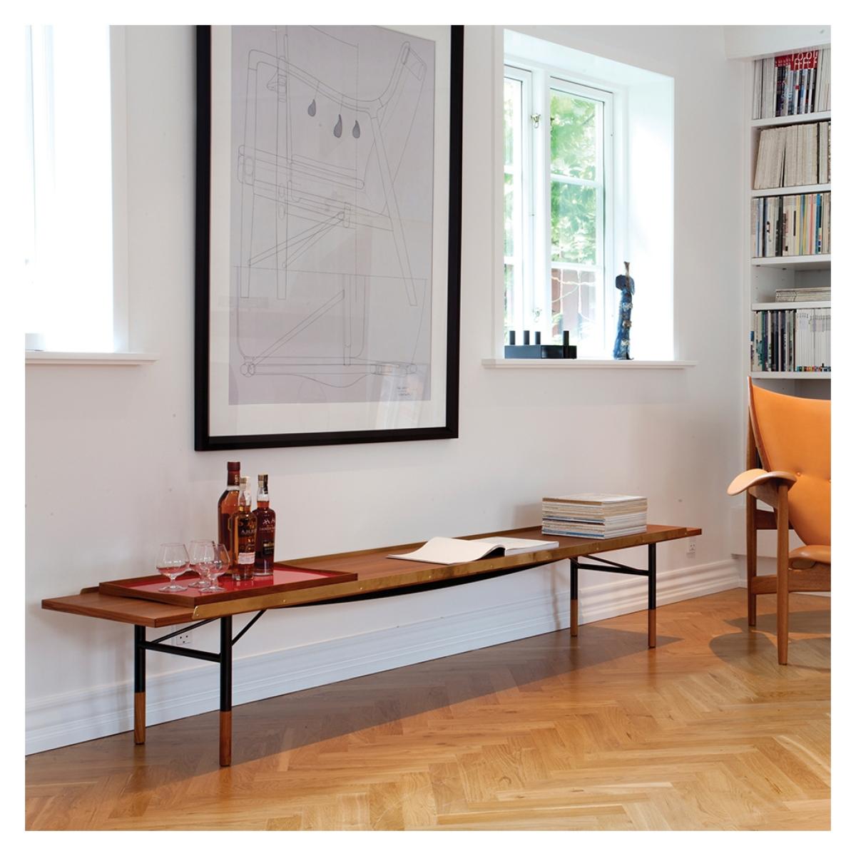 Finn Juhl, the master of Danish Modern, originally designed the large walnut and brass Table Bench in 1953 after having been inspired by the work of American designers he encountered. Exquisitely designed, the Table Bench formed part of the large-scale Design in Scandinavia show, an exhibition curated by Finn Juhl himself that travelled across North American between 1954 and 1957, and was attended by approximately 650,000 visitors. Equally suited to use as a coffee table, sideboard, bench and display unit, the Table Bench's top is expertly crafted from walnut and finished elegant matte polished brass edging. Resting on black steel legs with feet finished in matching walnut, the Table Bench would lend a design edge to any space. The first Danish furniture designer to achieve international recognition, Finn Juhl is seen by many as the master of Danish Modern. A self-taught designer, he originally studied to become an architect but worked with the mindset of a sculptor when creating his designs. Rather than thinking in terms of practicality, Finn Juhl broke free from the constraints of conventional working methods to create truly innovative designs.