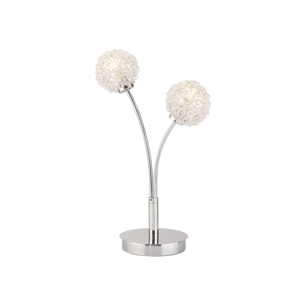 This 2-light table lamp, boasting wire shades, showcases a timeless chrome base that exudes a refreshing allure. Its delicate, plant-like aesthetic adds a touch of elegance and seamlessly fits into any living room or bedroom, enhancing the ambiance with its graceful presence.