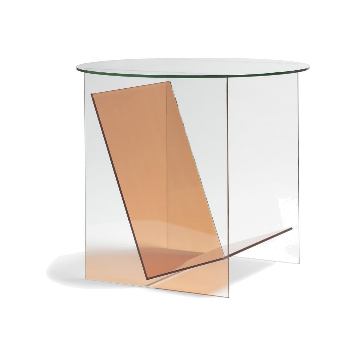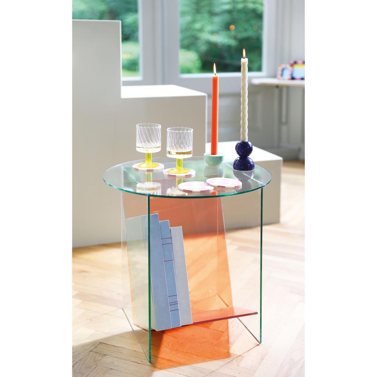 Bursting with graphics, the Tabloid glass side table offers a stunning visual effect thanks to its play on stacked volumes. It is made up of several interlocked shapes which together form an asymmetric assembly, offering an interesting perspective illusion. Inside the transparent structure is a coloured glass shelf, which appears to float in mid-air, as if by magic. This shelf can be used as a magazine holder. This table boasts a delightful union of colours and transparency. It proves to be extremely versatile in use: bedside table, sofa end table, side table.