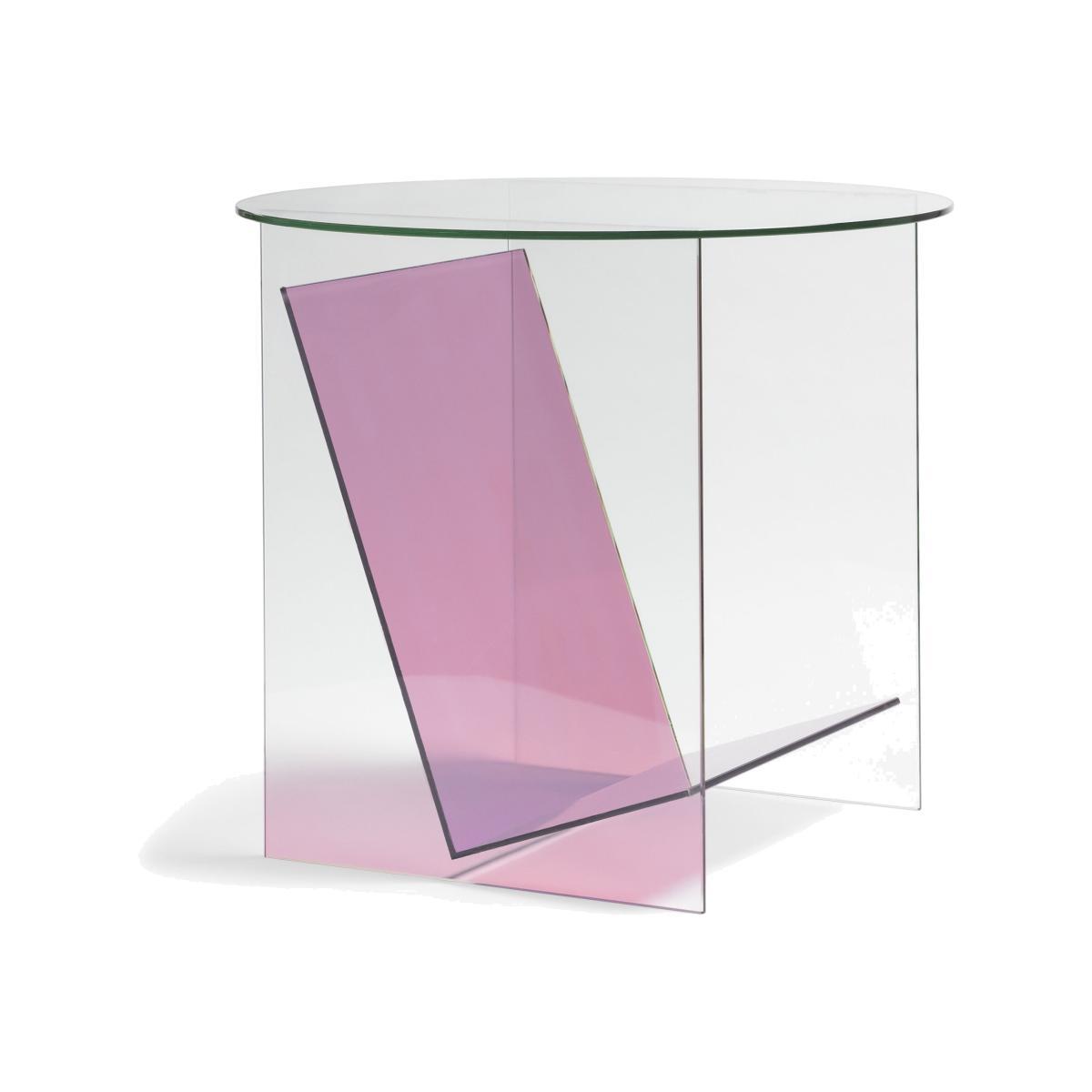Bursting with graphics, the Tabloid glass side table offers a stunning visual effect thanks to its play on stacked volumes. It is made up of several interlocked shapes which together form an asymmetric assembly, offering an interesting perspective illusion. Inside the transparent structure is a coloured glass shelf, which appears to float in mid-air, as if by magic. This shelf can be used as a magazine holder. This table boasts a delightful union of colours and transparency. It proves to be extremely versatile in use: bedside table, sofa end table, side table.