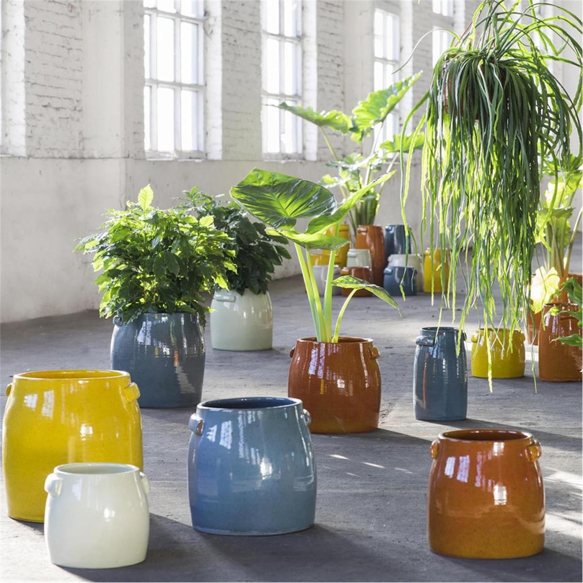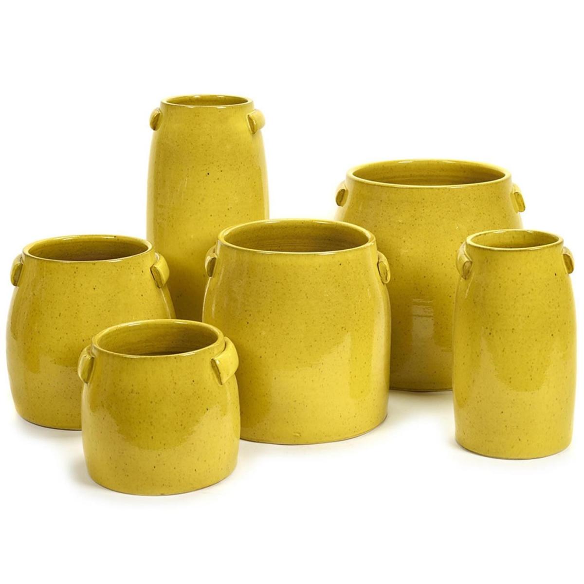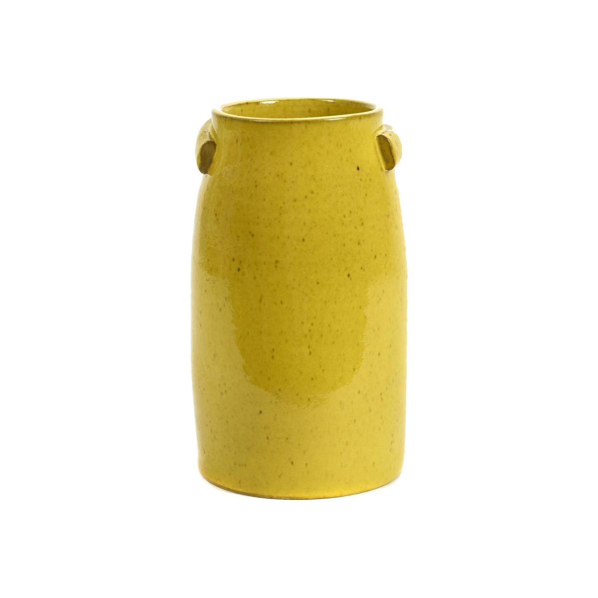 Create a colourful botanical display with this Tabor vase from Serax. Crafted from earthenware, this vase is available in bold orange or yellow with a shining glazed finish. In a tall, rounded shape, it is finished with small handle inspired features just below the rim and it is ideal for both flower or plant displays.