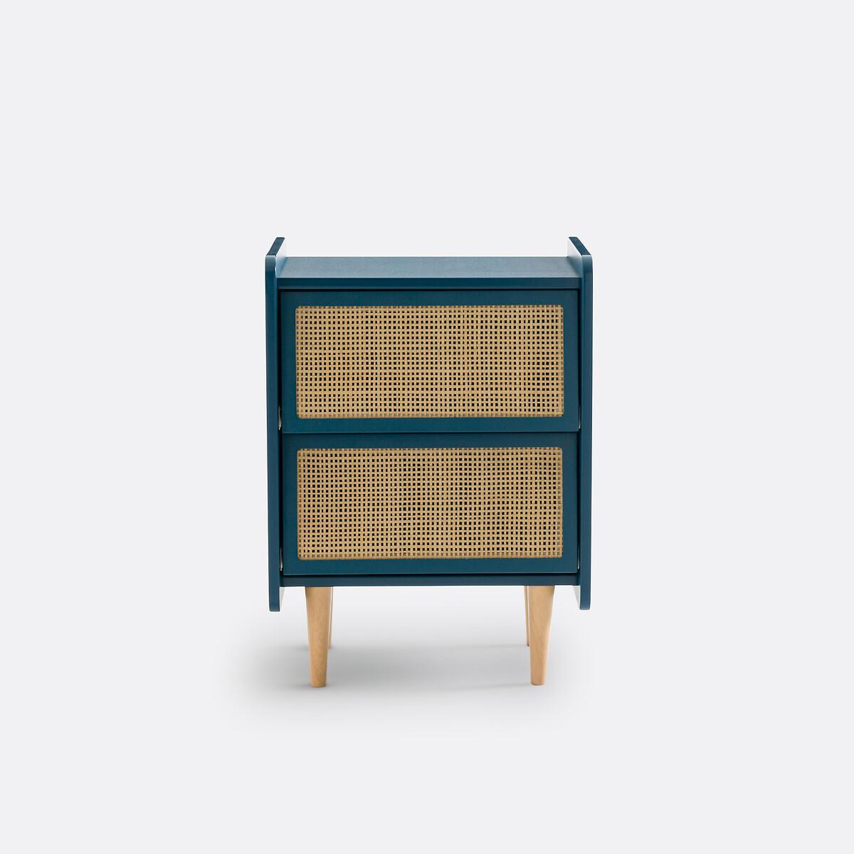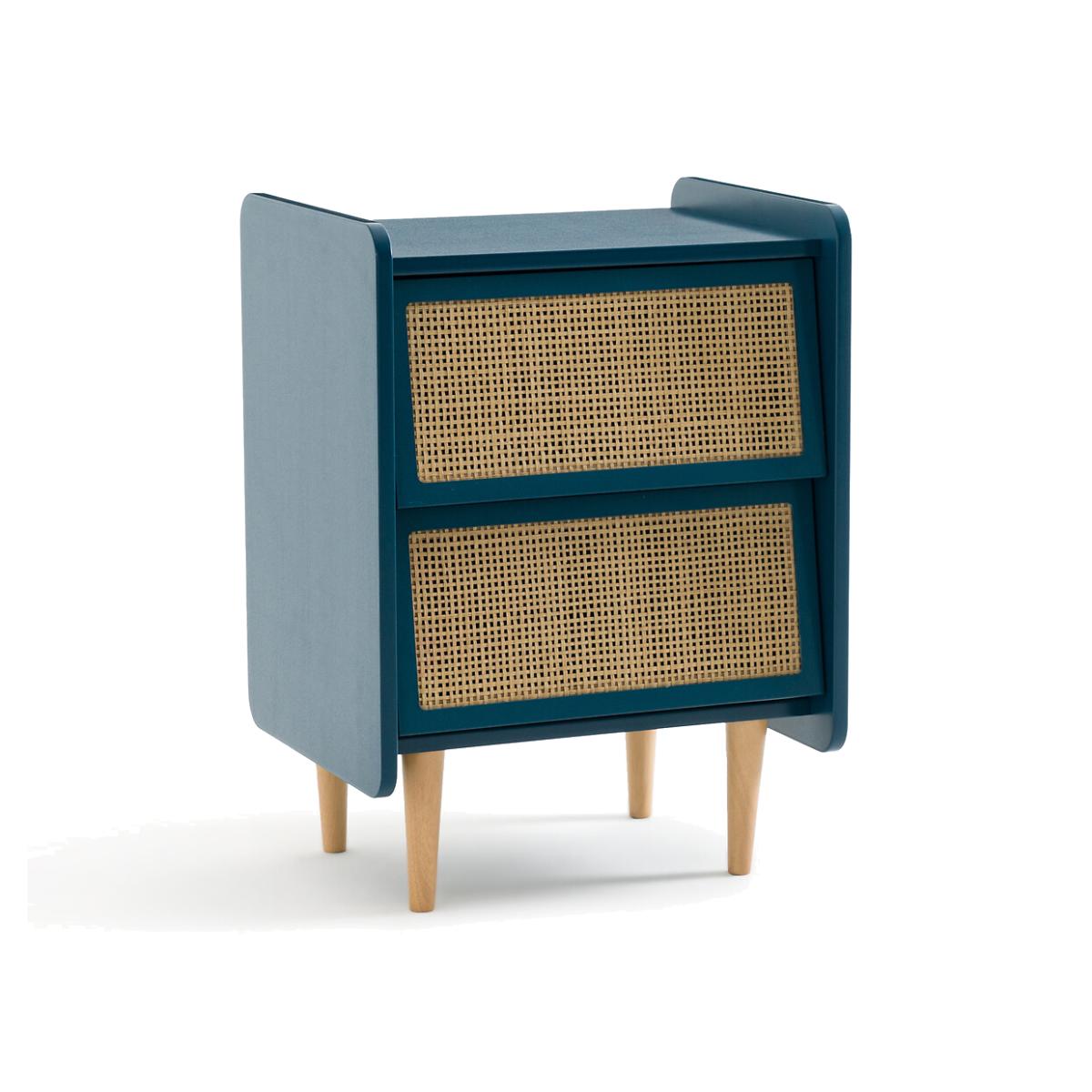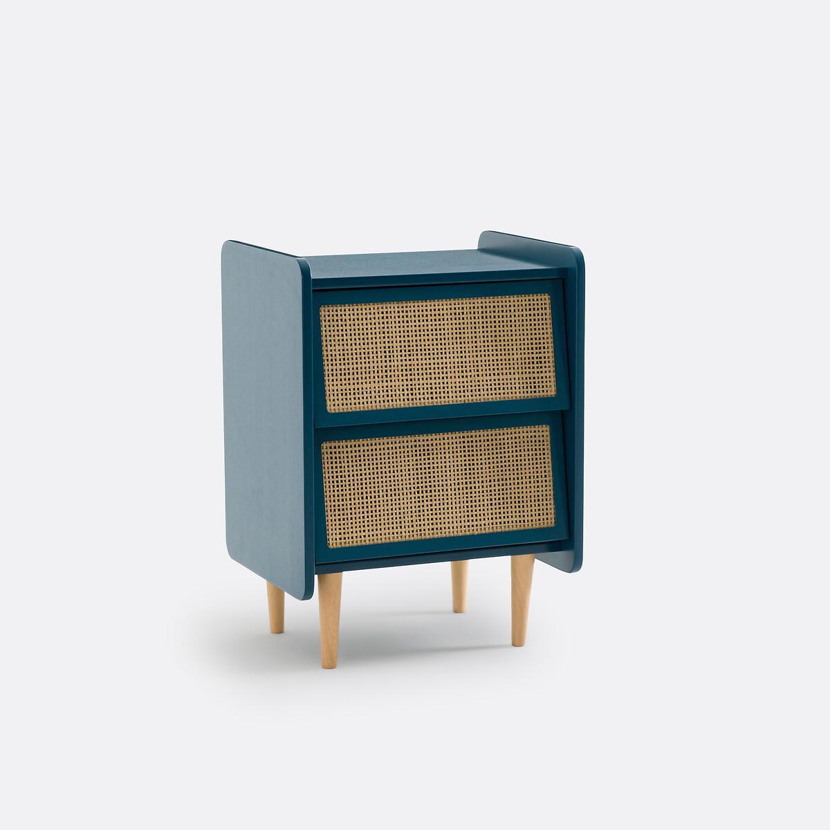 A combination of painted wood and natural rattan, with a simple design: Whether in a room for adults or children, this bedside table will look great!Product Details • Lacquered MDF box with acrylic finish (solvent-free water-based paint), • Rattan cane drawer fronts • Solid pine legs • Drawers with metal slidersDimensions. Overall • Width: 43.4cm • Height: 59.9cm • Depth: 35cm • Weight: 10.3kg. Usable dimensions • Drawer: L35.5 x D26.4 x H13.4cm. Home delivery:This product is delivered to assemble yourself. Parcel dimensions and weight • L80 x H54.4 x D8.4cm. • 13kg.