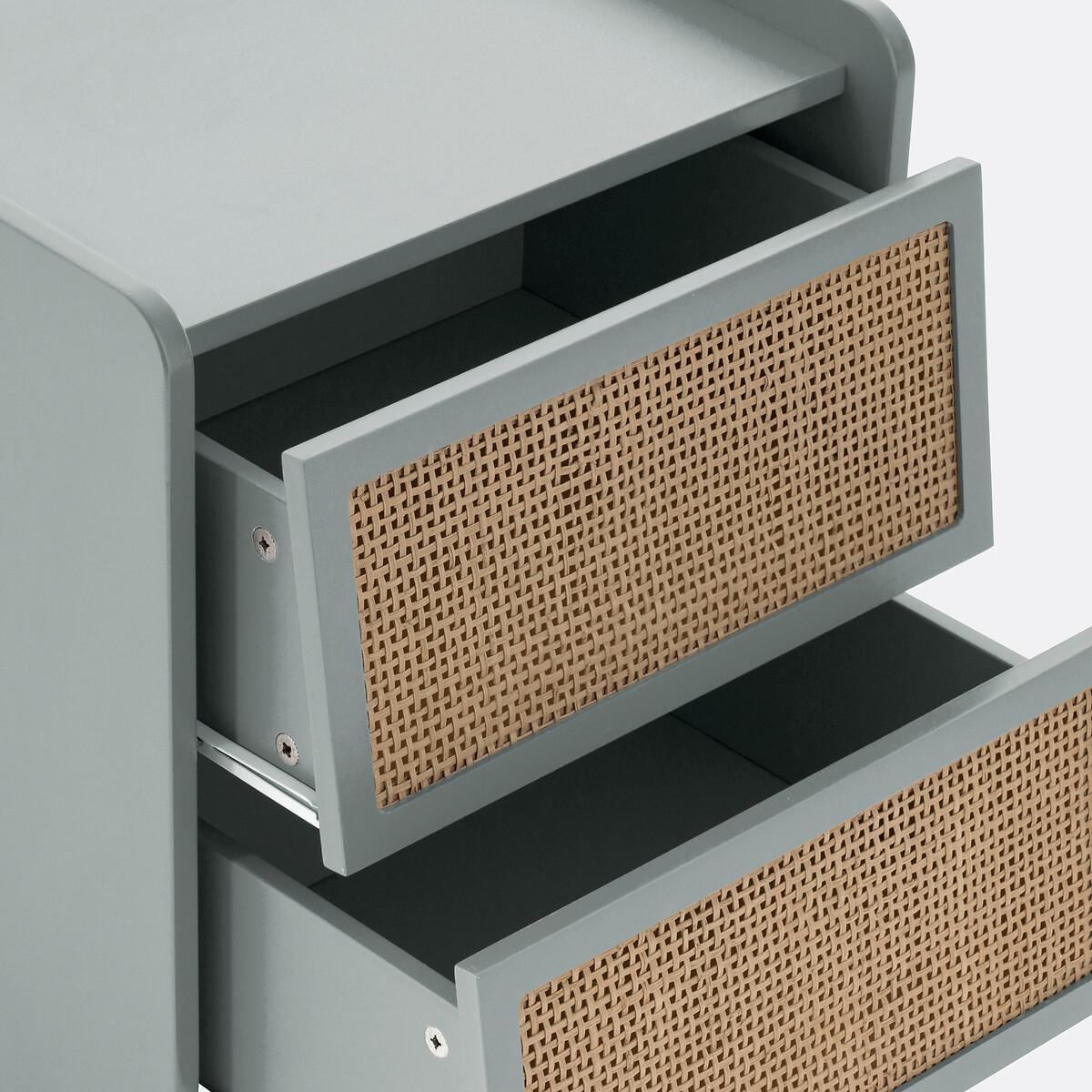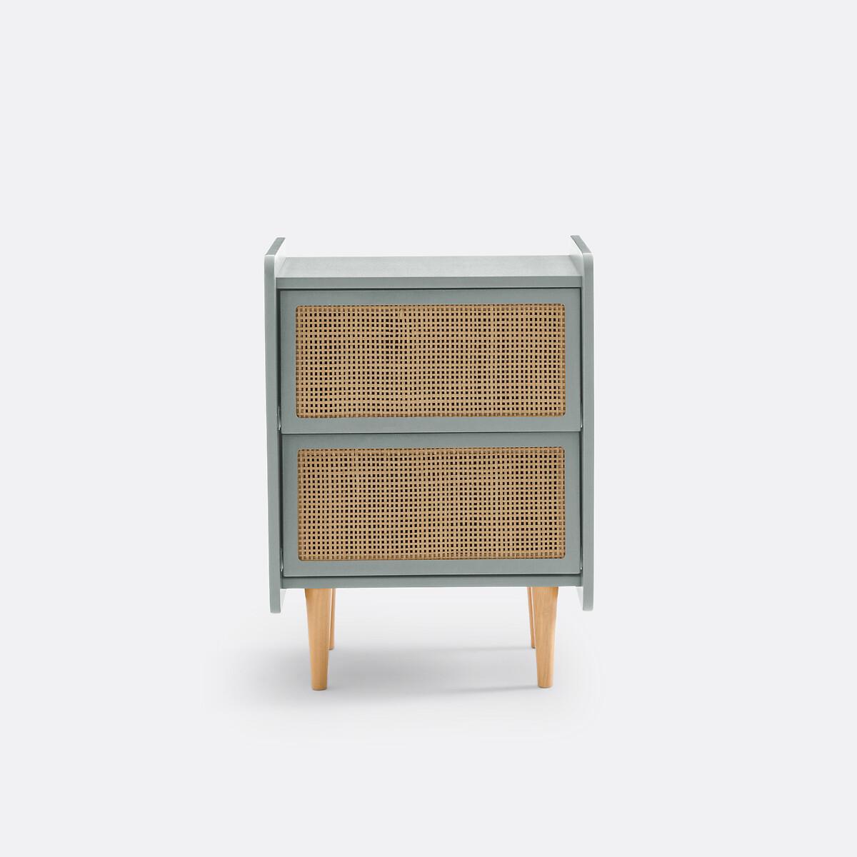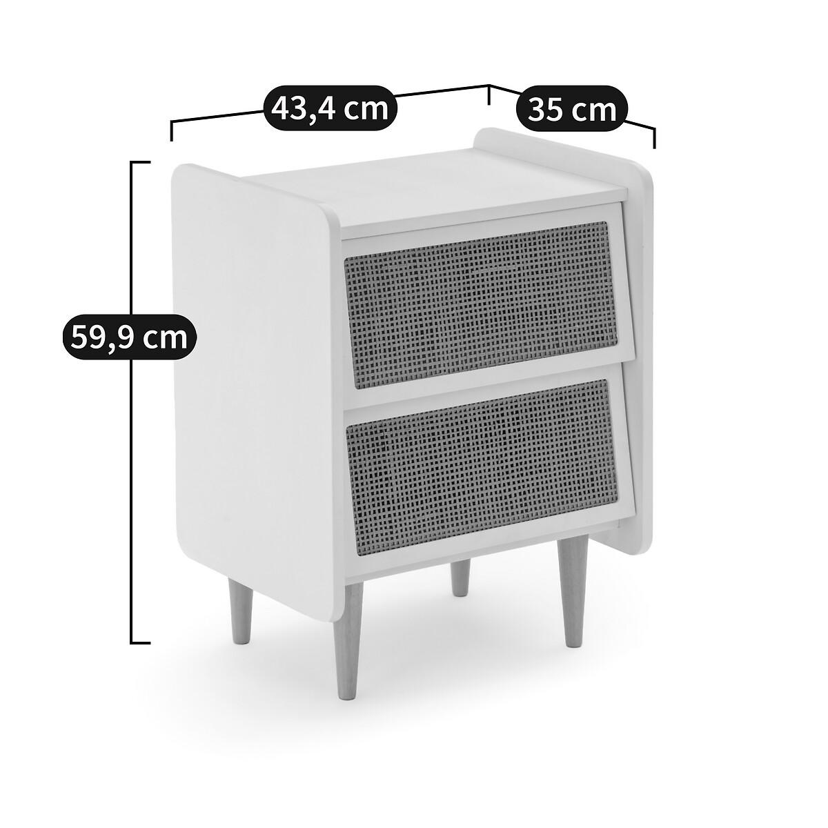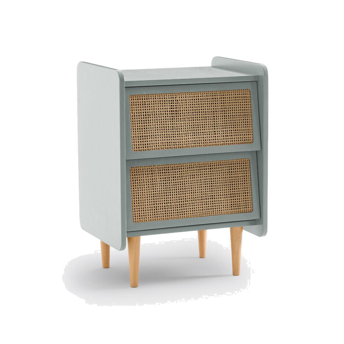 A combination of painted wood and natural rattan, with a simple design: Whether in a room for adults or children, this bedside table will look great!Product Details • Lacquered MDF box with acrylic finish (solvent-free water-based paint), • Rattan cane drawer fronts • Solid pine legs • Drawers with metal slidersDimensions. Overall • Width: 43.4cm • Height: 59.9cm • Depth: 35cm • Weight: 10.3kg. Usable dimensions • Drawer: L35.5 x D26.4 x H13.4cm. Home delivery:This product is delivered to assemble yourself. Parcel dimensions and weight • L80 x H54.4 x D8.4cm. • 13kg.