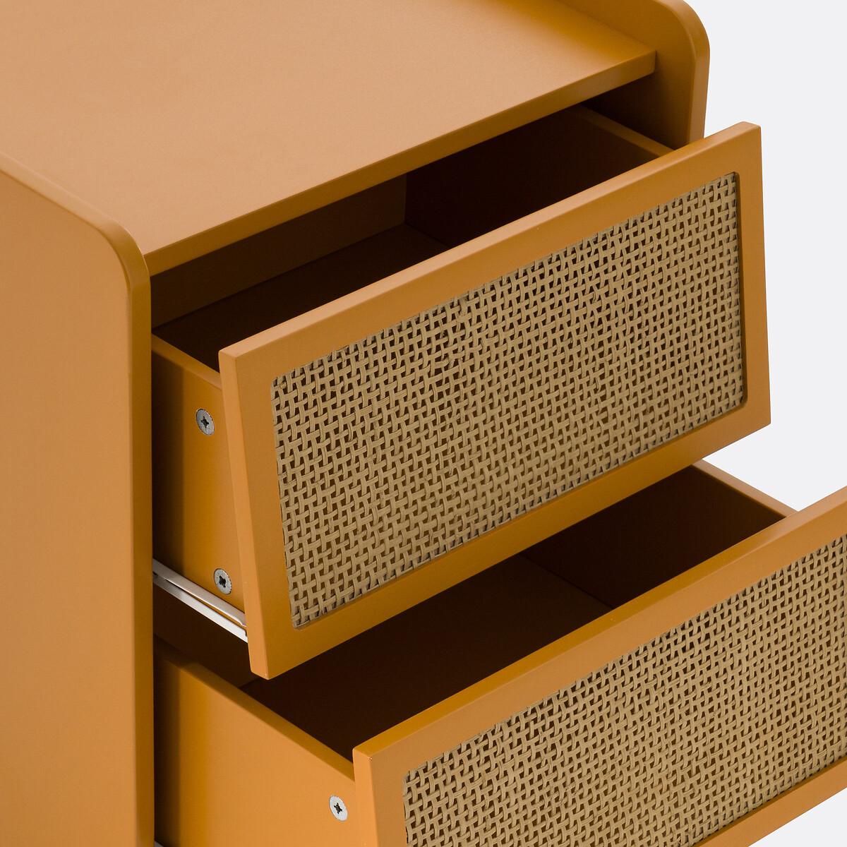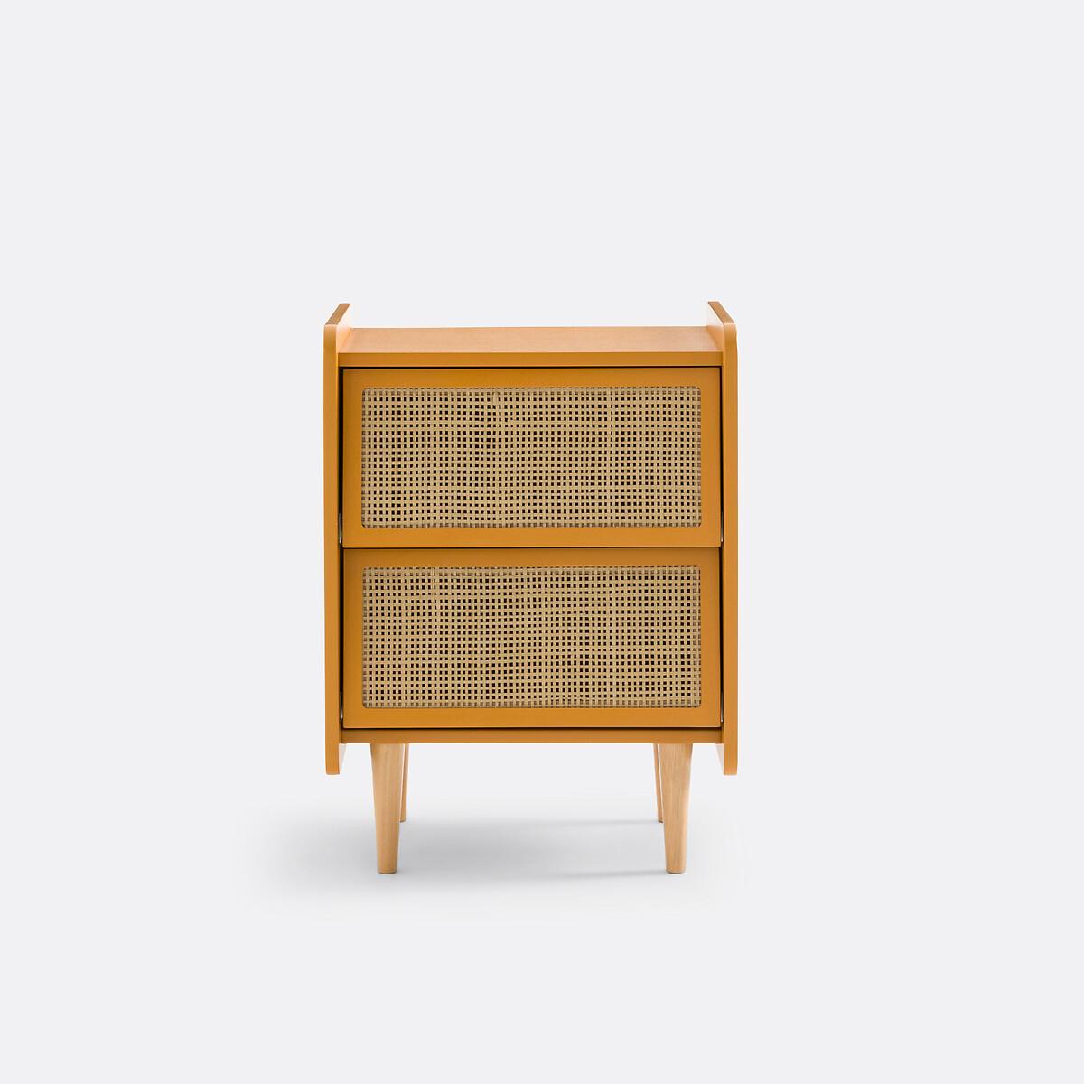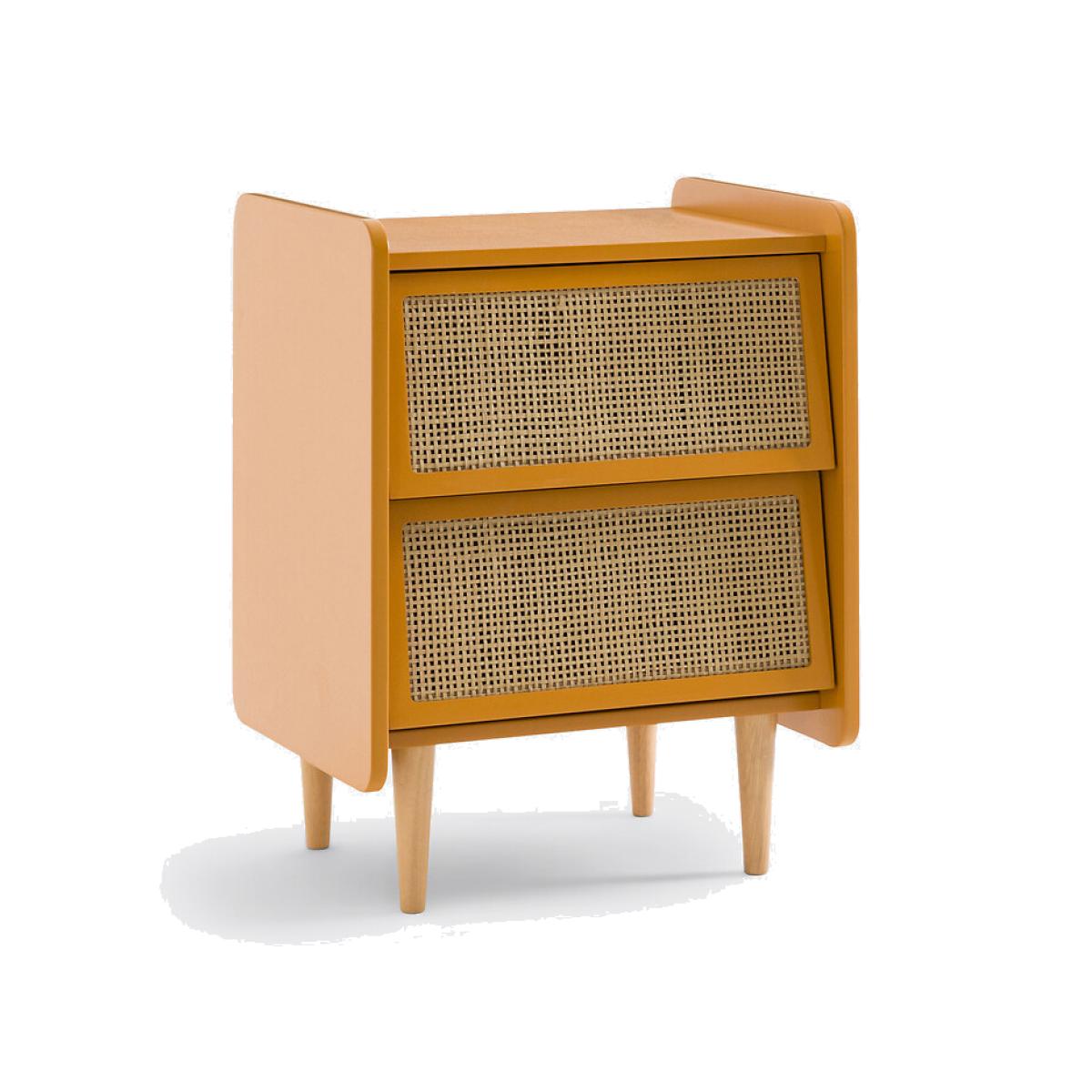 A combination of painted wood and natural rattan, with a simple design: Whether in a room for adults or children, this bedside table will look great!Product Details • Lacquered MDF box with acrylic finish (solvent-free water-based paint), • Rattan cane drawer fronts • Solid pine legs • Drawers with metal slidersDimensions. Overall • Width: 43.4cm • Height: 59.9cm • Depth: 35cm • Weight: 10.3kg. Usable dimensions • Drawer: L35.5 x D26.4 x H13.4cm. Home delivery:This product is delivered to assemble yourself. Available for home delivery. Note! Please check that all access points are large enough to accommodate your delivery (doors, stairs, lifts). • WOOD FROM MORE SUSTAINABLY MANAGED FORESTS AND CONTROLLED SOURCES. FSC® Mix wood contains at least 70% FSC® certified and/or recycled wood, the remainder being FSC® controlled wood. Parcel Dimensions • L80 x H54.4 x D8.4cm. • 13kg.
