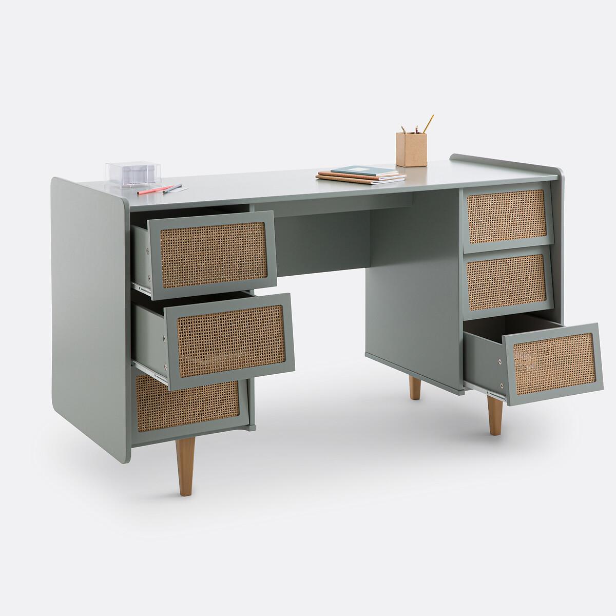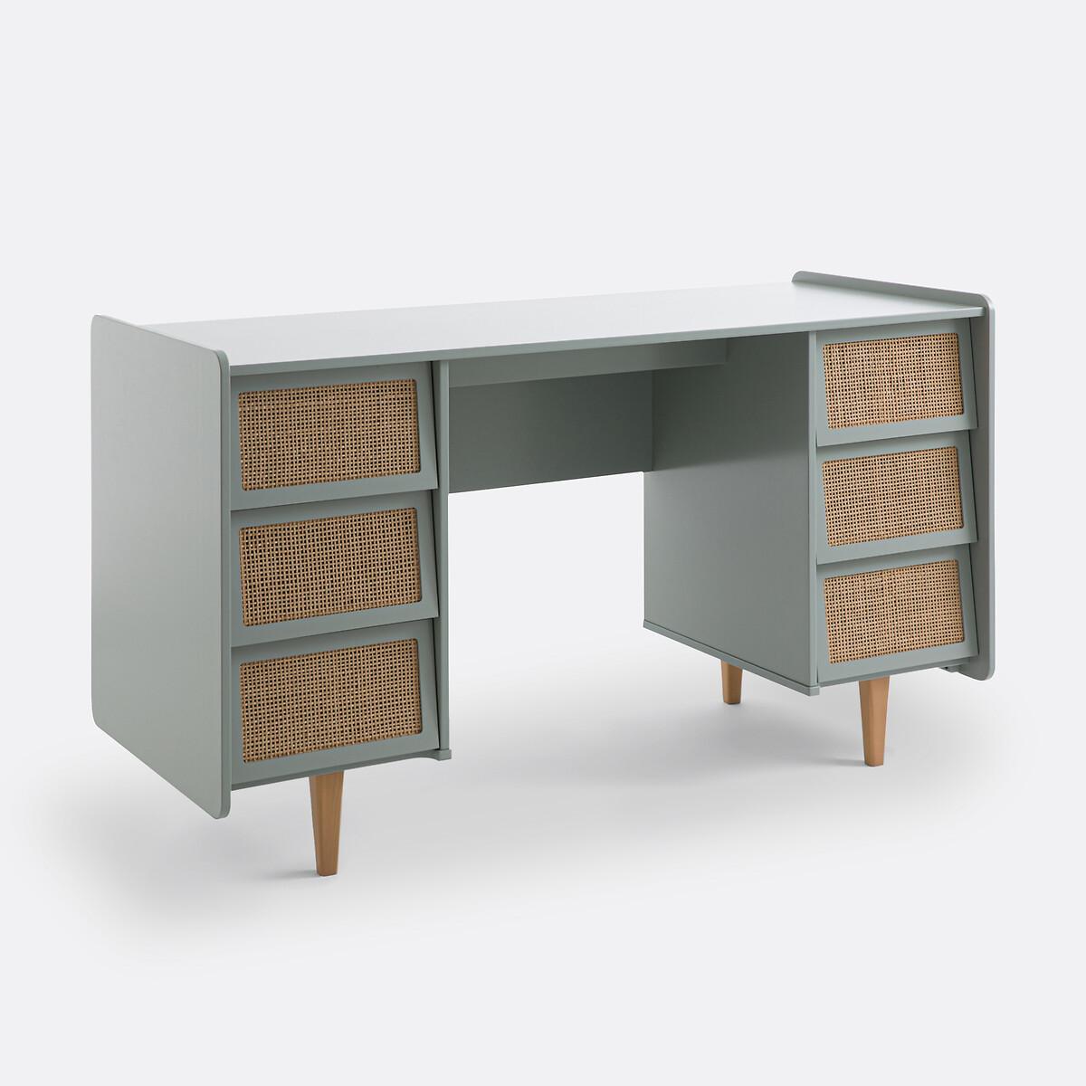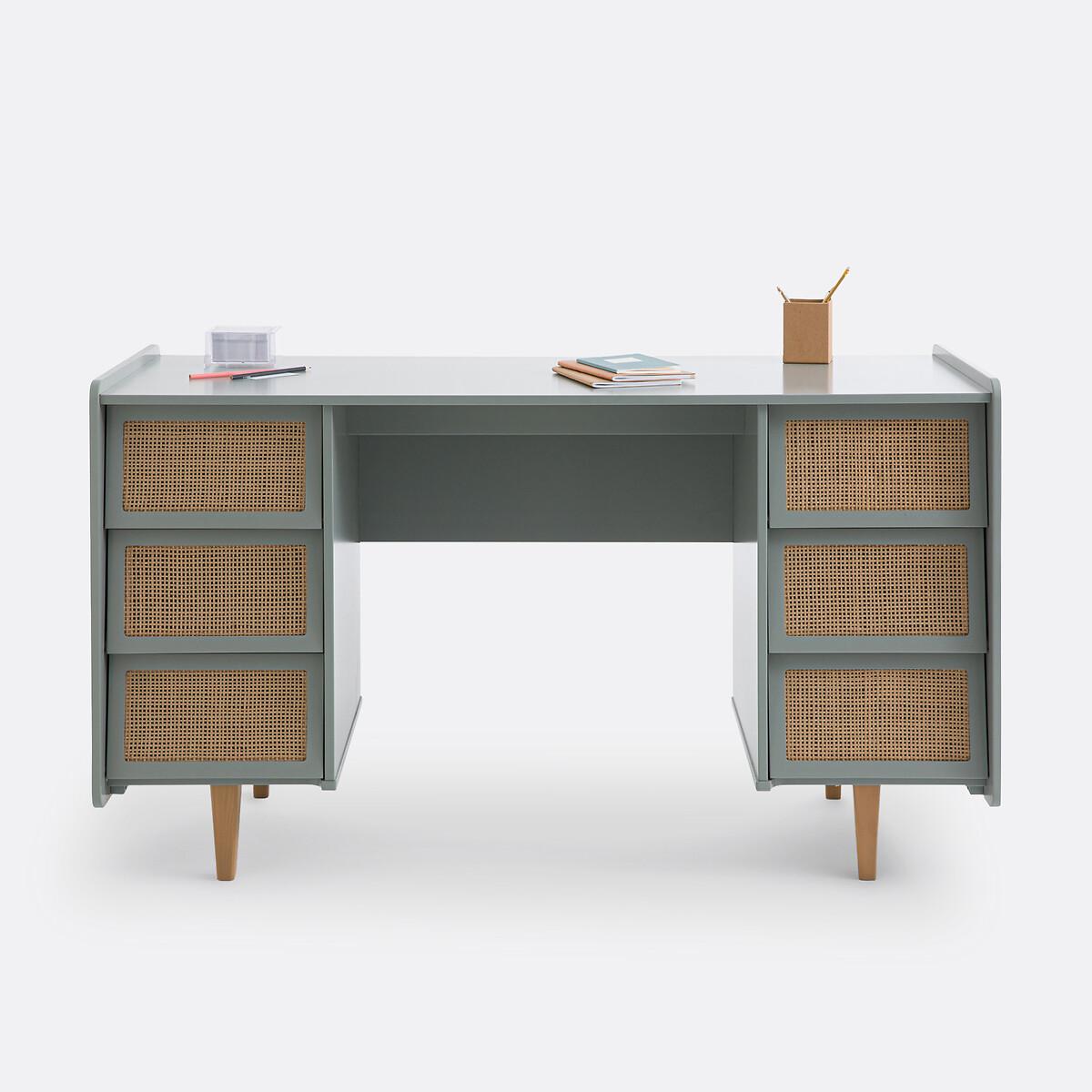 The combination of painted wood and rattan, in a simple design: the Taga double pedestal desk has everything to please adults and children alike!Product Details • Structure in FSC® certified MDF with acrylic finish (water-based paint without solvent) • Drawer fronts in rattan canework, with steel slides • FSC® certified solid pine legsDimensions. Overall • Width: 136cm • Height: 77cm • Depth: 56cm • Height of legs: 15cm • Weight: 50.5kg. Usable space • Drawer:L28 x H13 x D38cm • Top: L133 x H75.5cmDelivery:. Assembly required. Available for home delivery. Note! Please check that all access points are large enough to accommodate your delivery (doors, stairs, lifts) • WOOD FROM SUSTAINABLY MANAGED FORESTS. FSC® certified wood comes from forests that are environmentally, socially and economically well managed. Parcel Dimensions:2 parcels • L143 x H61.5 x D8cm. 29kg • L109 x H46 x D13cm. 25kg