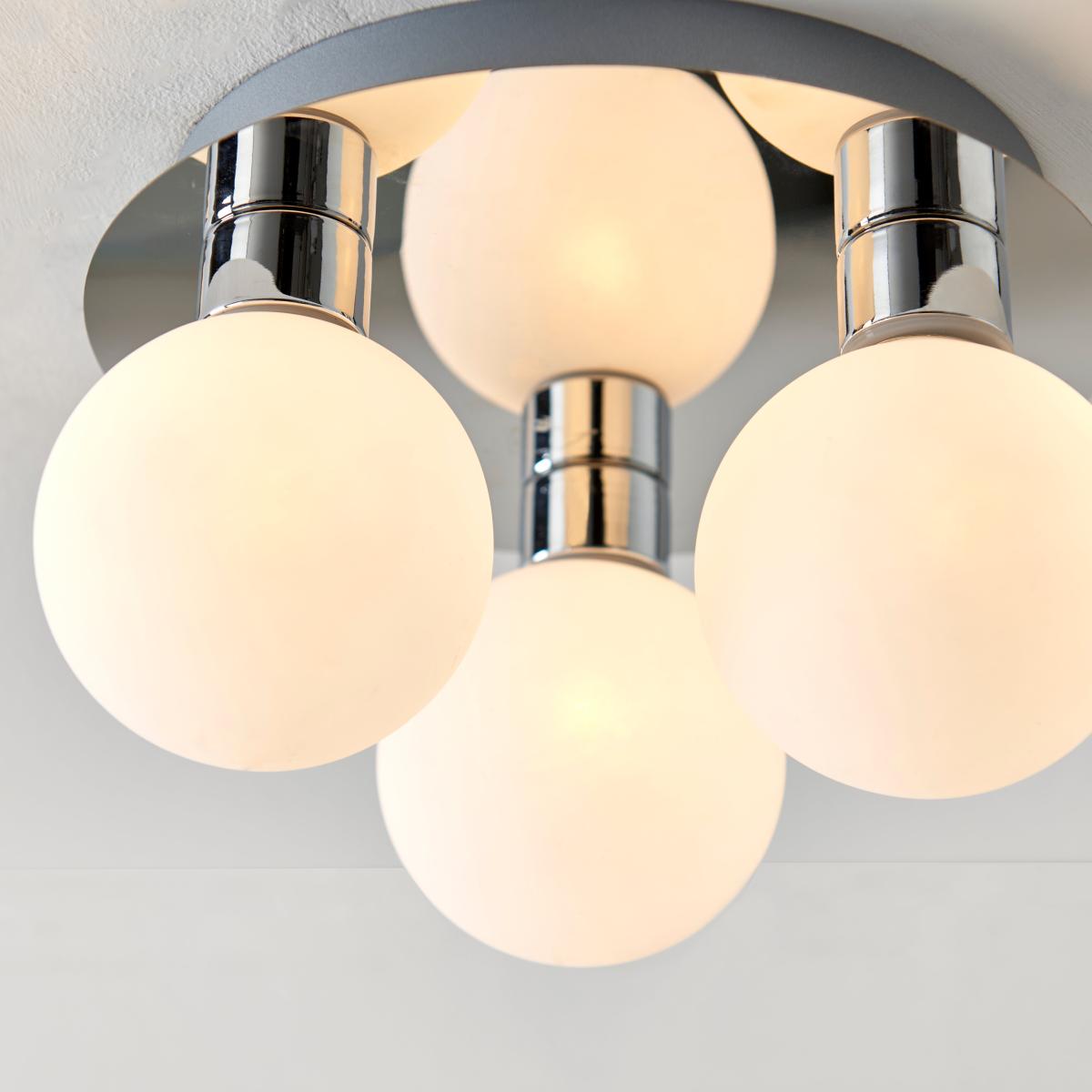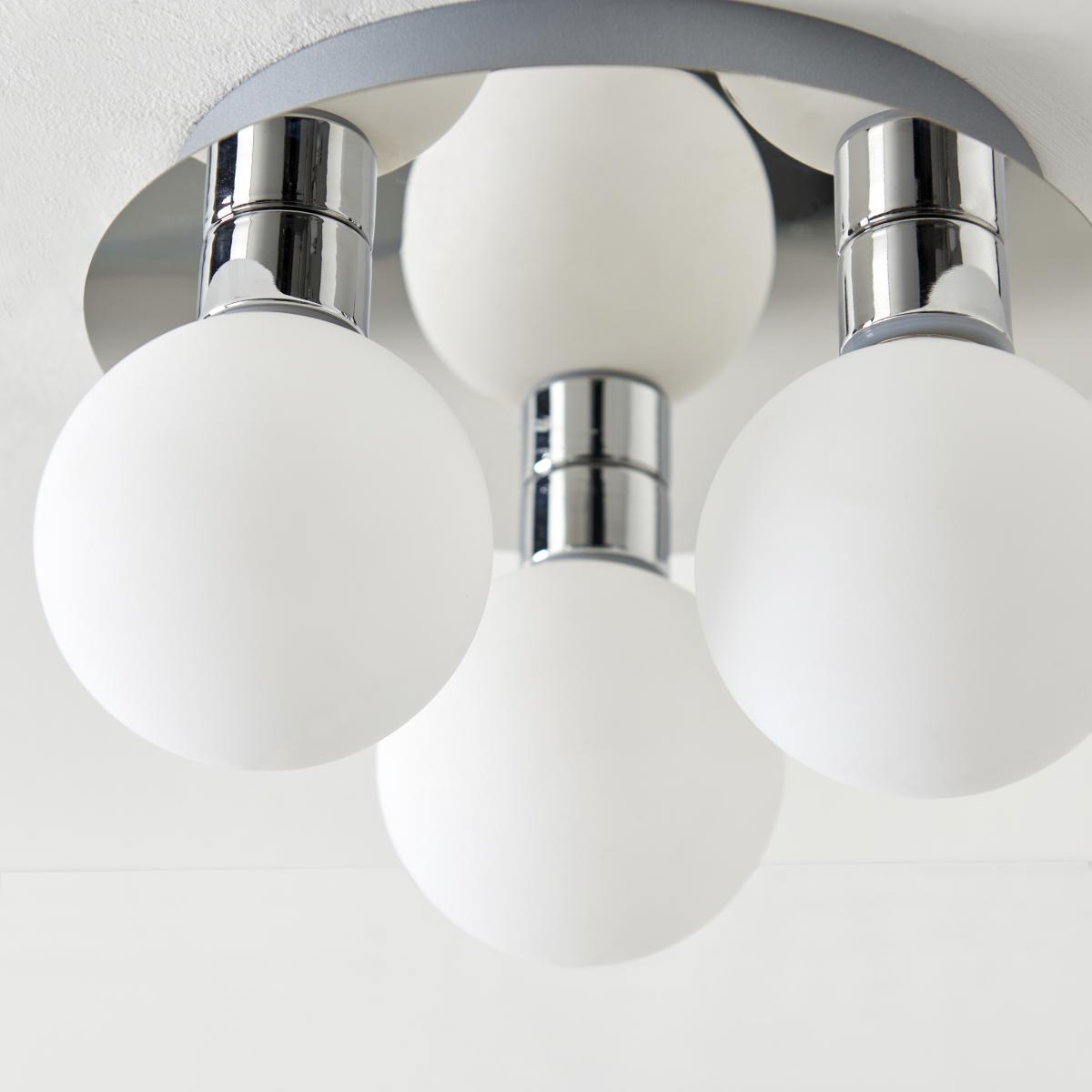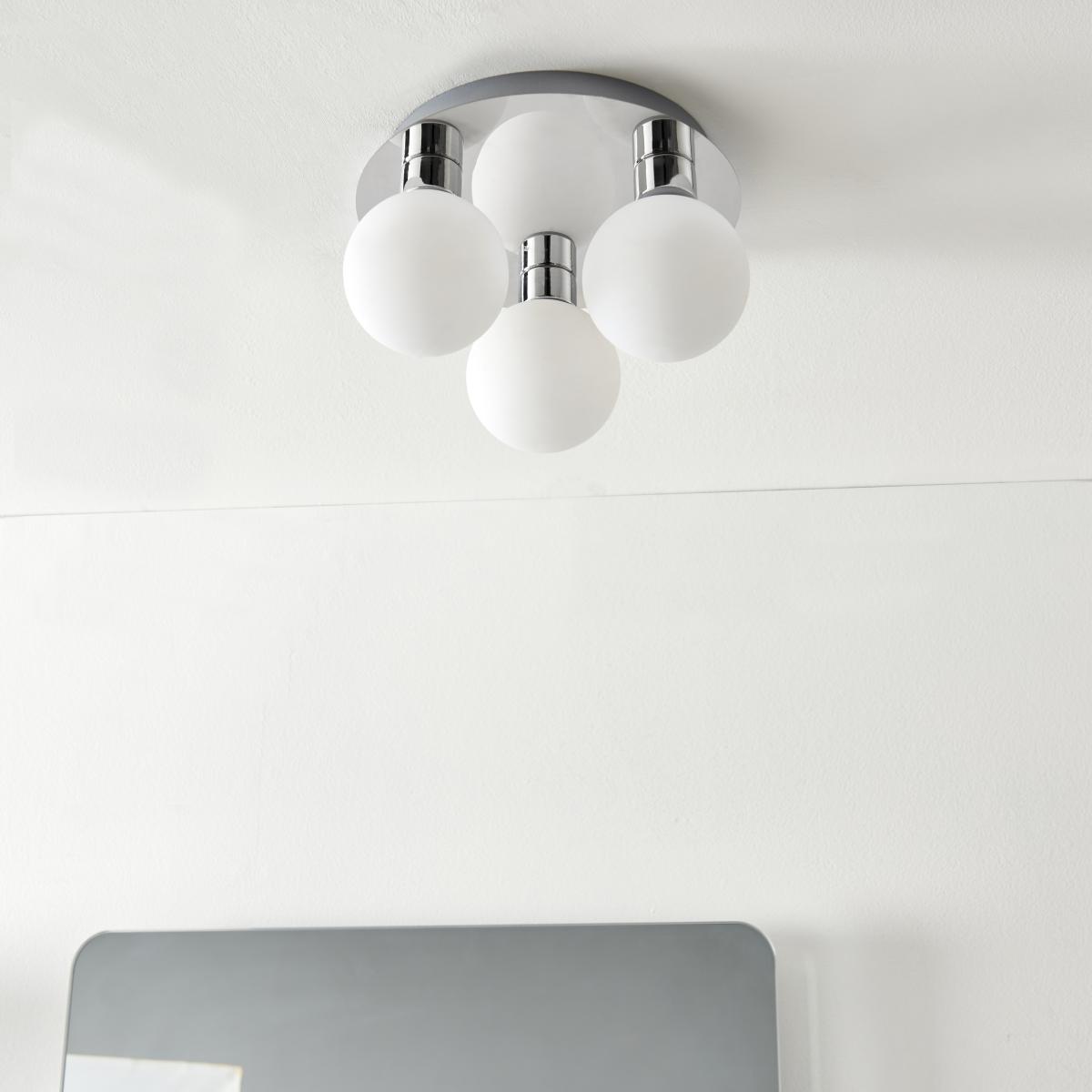 Modern semi flush ceiling light featuring opal glass shades. A modern and stylish design, this ceiling light is part of the Tago range. Featuring a polished chrome finish, the ceiling light has been paired with opal glass shades. Designed with lower ceilings in mind, create a statement without compromising on space.