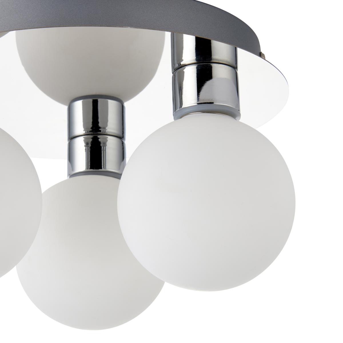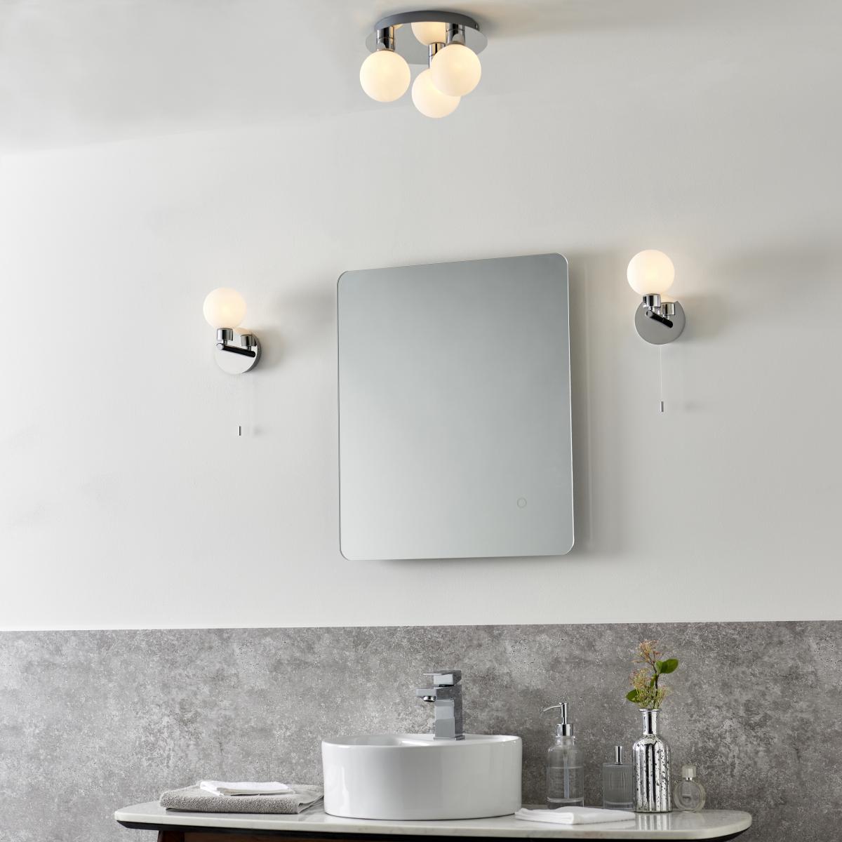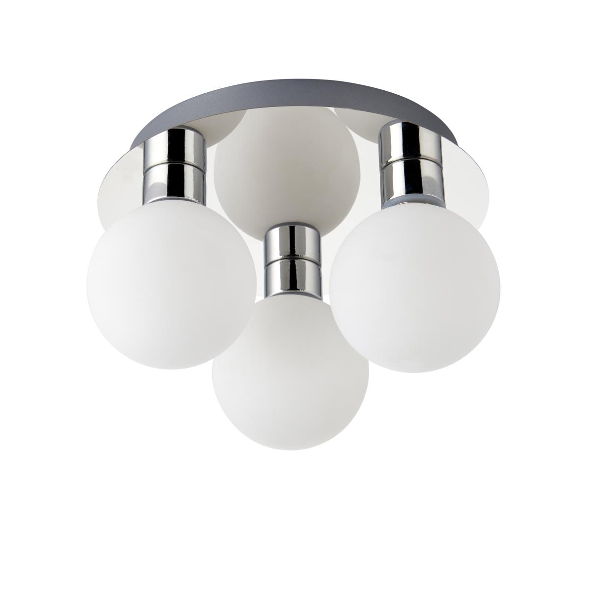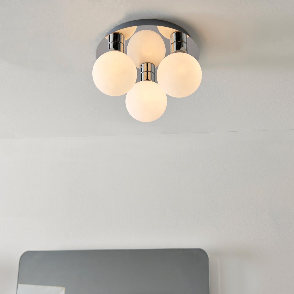 Modern semi flush ceiling light featuring opal glass shades. A modern and stylish design, this ceiling light is part of the Tago range. Featuring a polished chrome finish, the ceiling light has been paired with opal glass shades. Designed with lower ceilings in mind, create a statement without compromising on space.