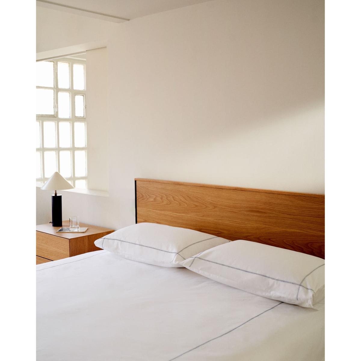 Headboard from the Taiana collection, with an oak veneer and steel legs painted black, for a natural look with an industrial touch.