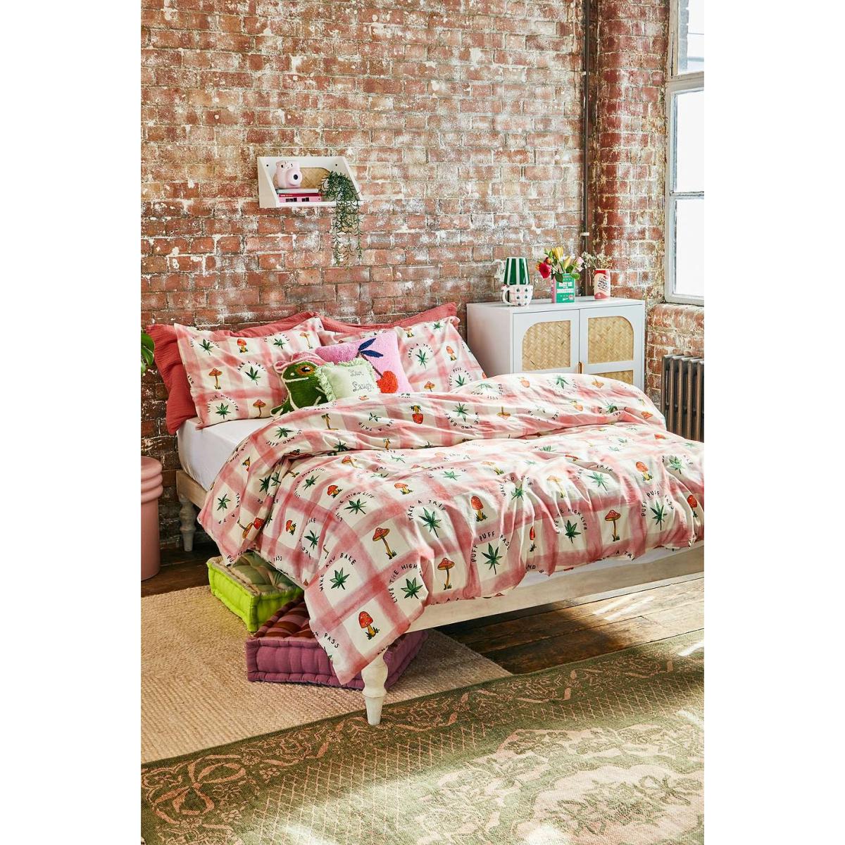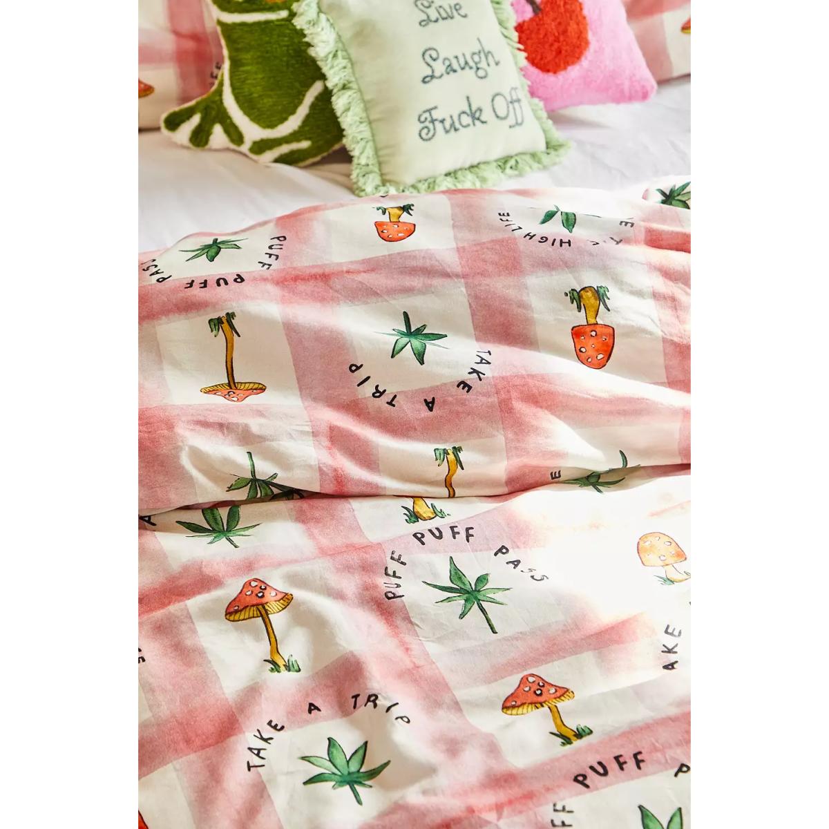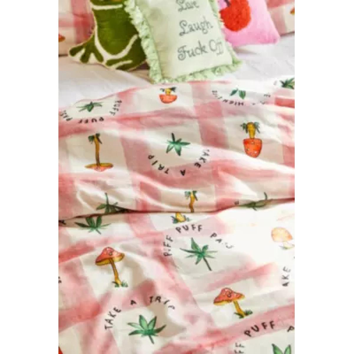 Complete your chill-out space with this trippy duvet set. Cut from a checked cotton topped with a mushroom and leafy print. Complete with matching pillowcases. **Content + Care** \- 100% Cotton \- Machine wash **Size** \- Single (includes 1 pillowcase): 135cm (W) x 200cm (H) \- Double (includes 2 pillowcases): 200cm (W) x 200cm (H) \- King (includes 2 pillowcases): 230cm (W) x 220cm (H) \- Pillowcase: 75cm x 50cm