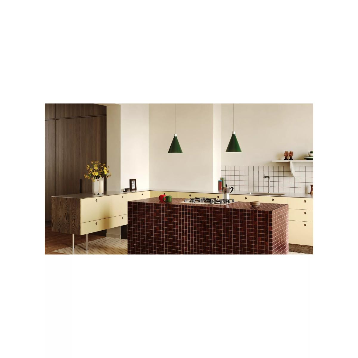 I love this pendant’s bold, contemporary look thanks to its rich dark green finish, which adds a sophisticated touch to various interiors. It works particularly well in modern or mid-century styled spaces, especially over kitchen islands or dining tables where a statement piece is desired. For practical styling, consider pairing it with matte or brass fixtures to enhance its colour and shape, and keep the surrounding decor neutral to let the green pendant stand out. It’s versatile enough to complement both minimalist setups and more eclectic schemes, making it a clever choice for injecting colour and character into everyday living areas.