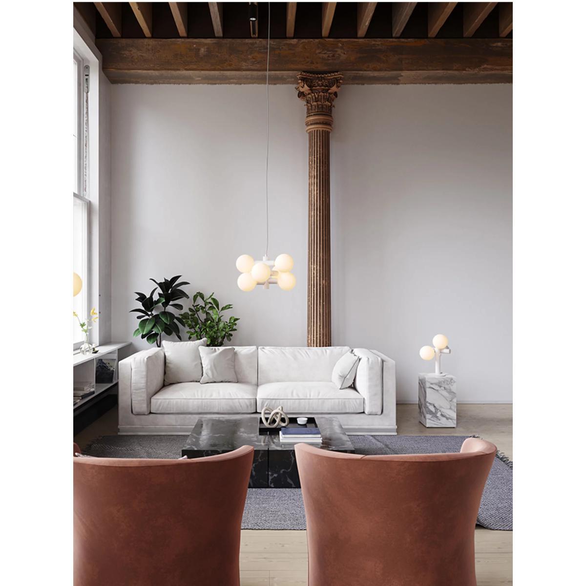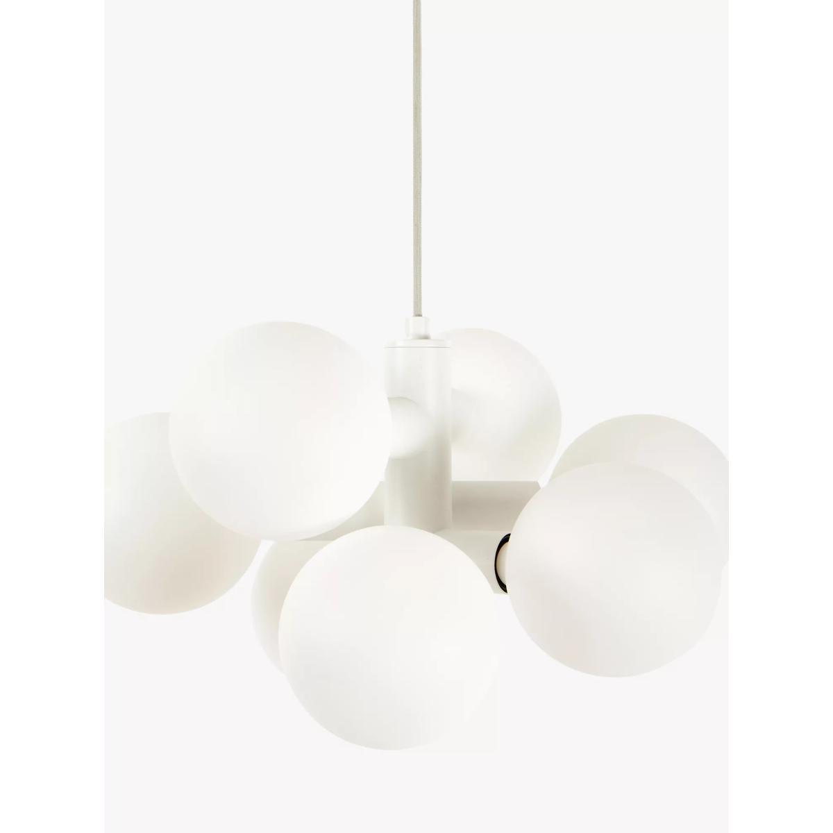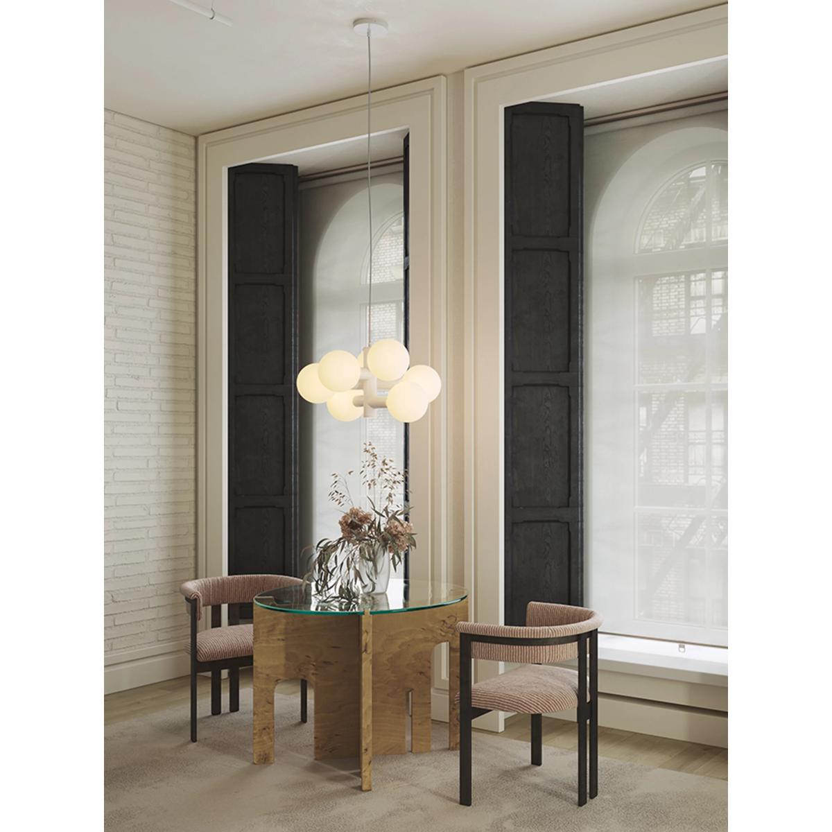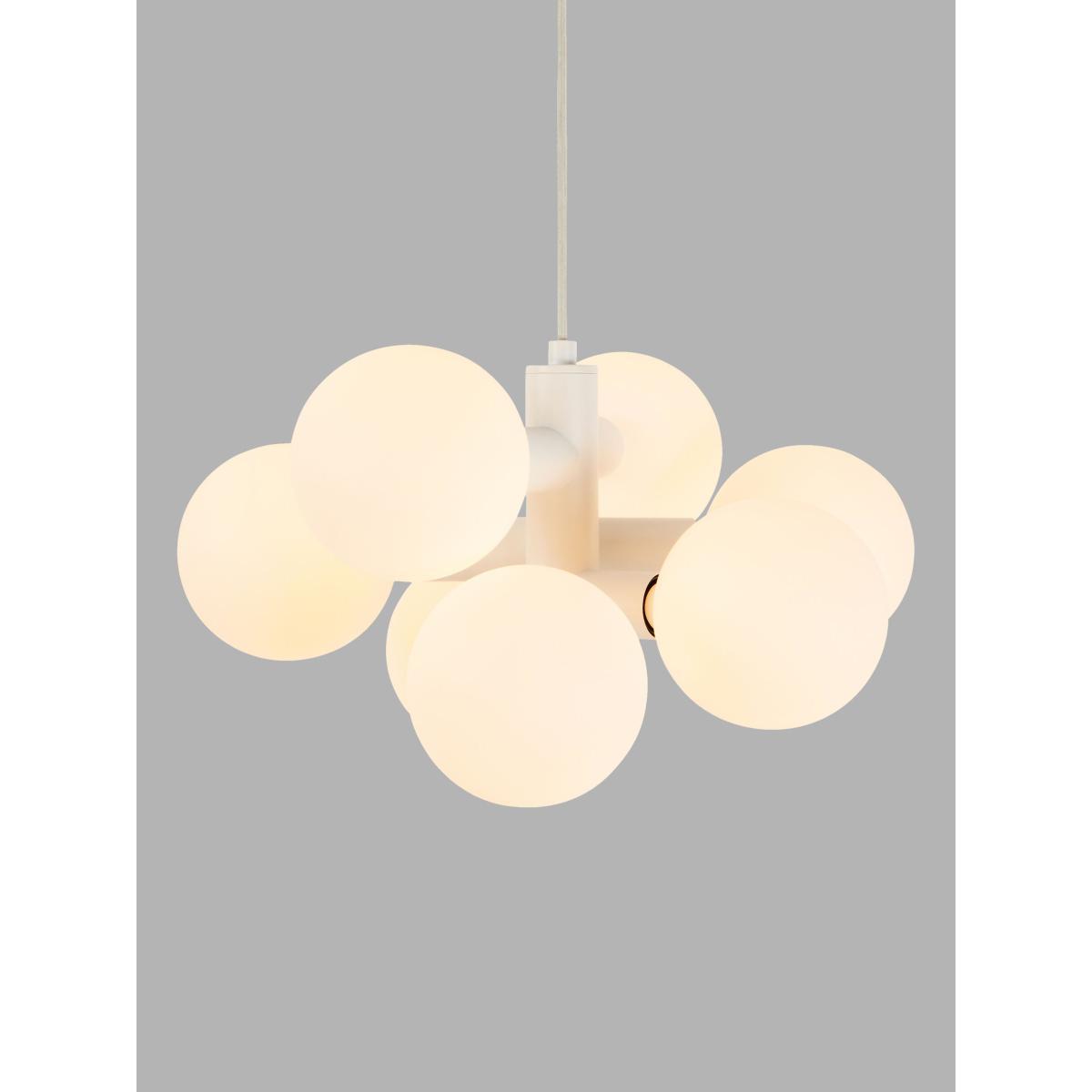 Designed exclusively for Tala by David Weeks, this bold and contemporary ceiling fitting will elevate any interior setting. It has an intersecting steel structure that incorporates seven matt white globe lampshades to cast light around your space. Tala's Sphere IV LED bulbs with dim-to-warm technology are included, which gives this light unrivalled dimming performance from a functional to decorative glow. The result is a cloud-like lighting display that can be set-up to match the mood in your space. Suspended from a height-adjustable cord for perfect positioning.