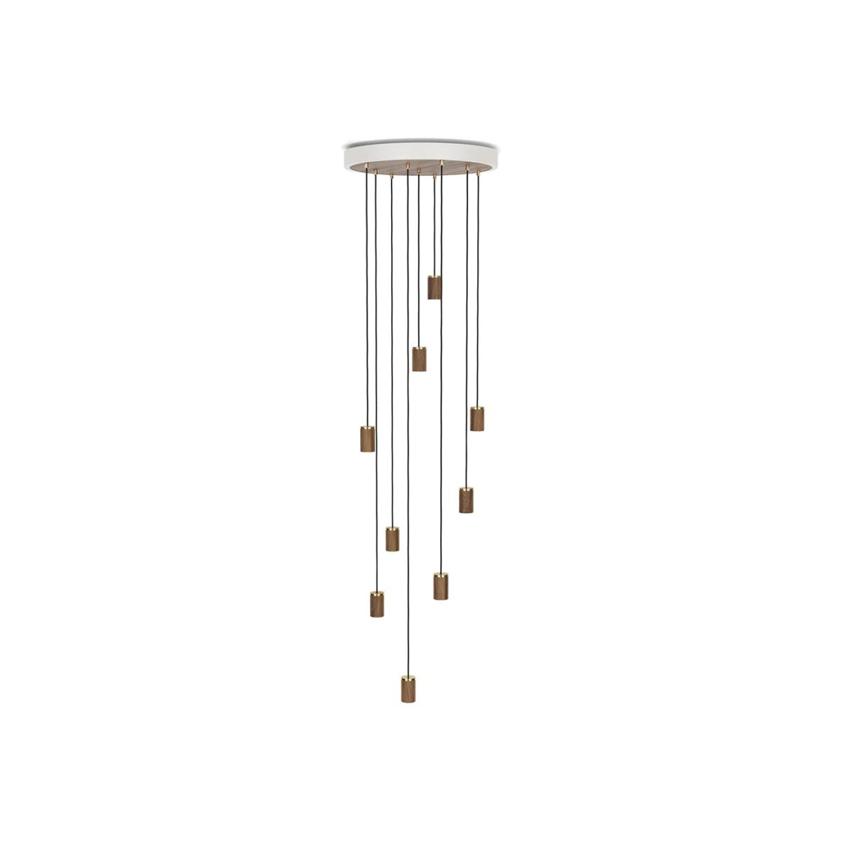 Striking in its simplicity, this lofty lighting display features nine walnut fittings suspended from a white ceiling canopy. With five metres of adjustable cord, this fixture is more than equipped to accommodate them. Housed in a steel white frame, the inner disc is reversible so it can be displayed in oak, walnut or brass depending on the chosen finish. Once assembled, the display looks especially great in foyers or suspended in spiral staircases.
