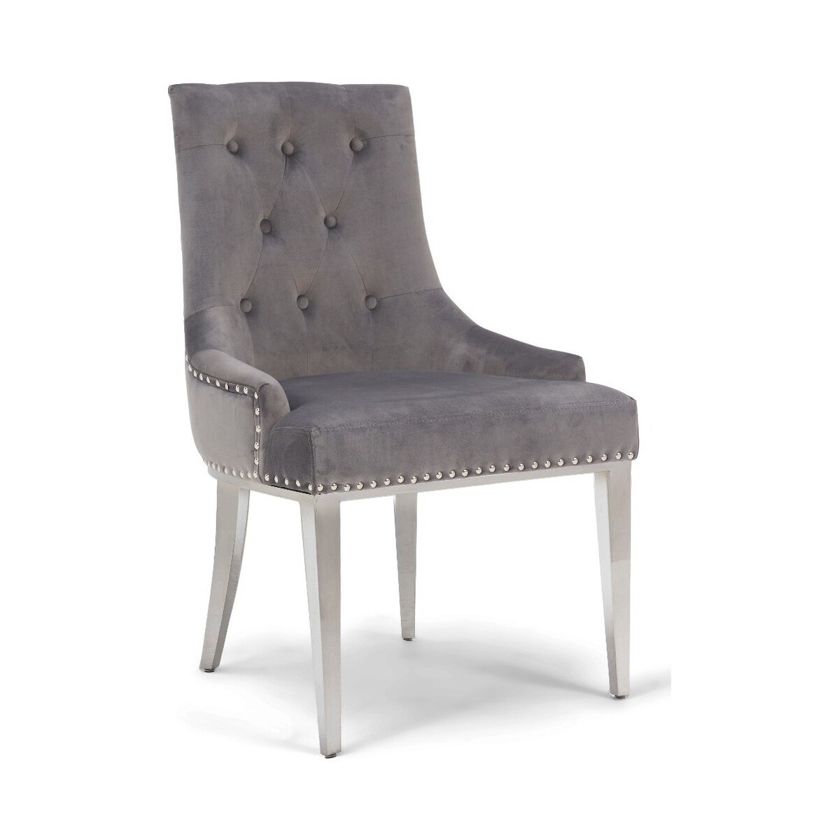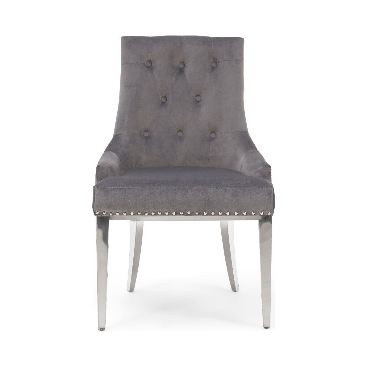 Bring a touch of vintage style to your home dining area with the Talia Grey Velvet Dining Chairs. Upholstered in soft touch velvet and featuring a metal ring detail on the backrest and a metal stud trim, the chairs are complete with sturdy legs. Stylish grey velvet dining chairs make an impression Soft-touch grey velvet upholstery for a classic luxury look Padded seats for a comfortable sit Timeless details including a metal ring on the backrest and metal studs Elegant yet durable legs complete the look