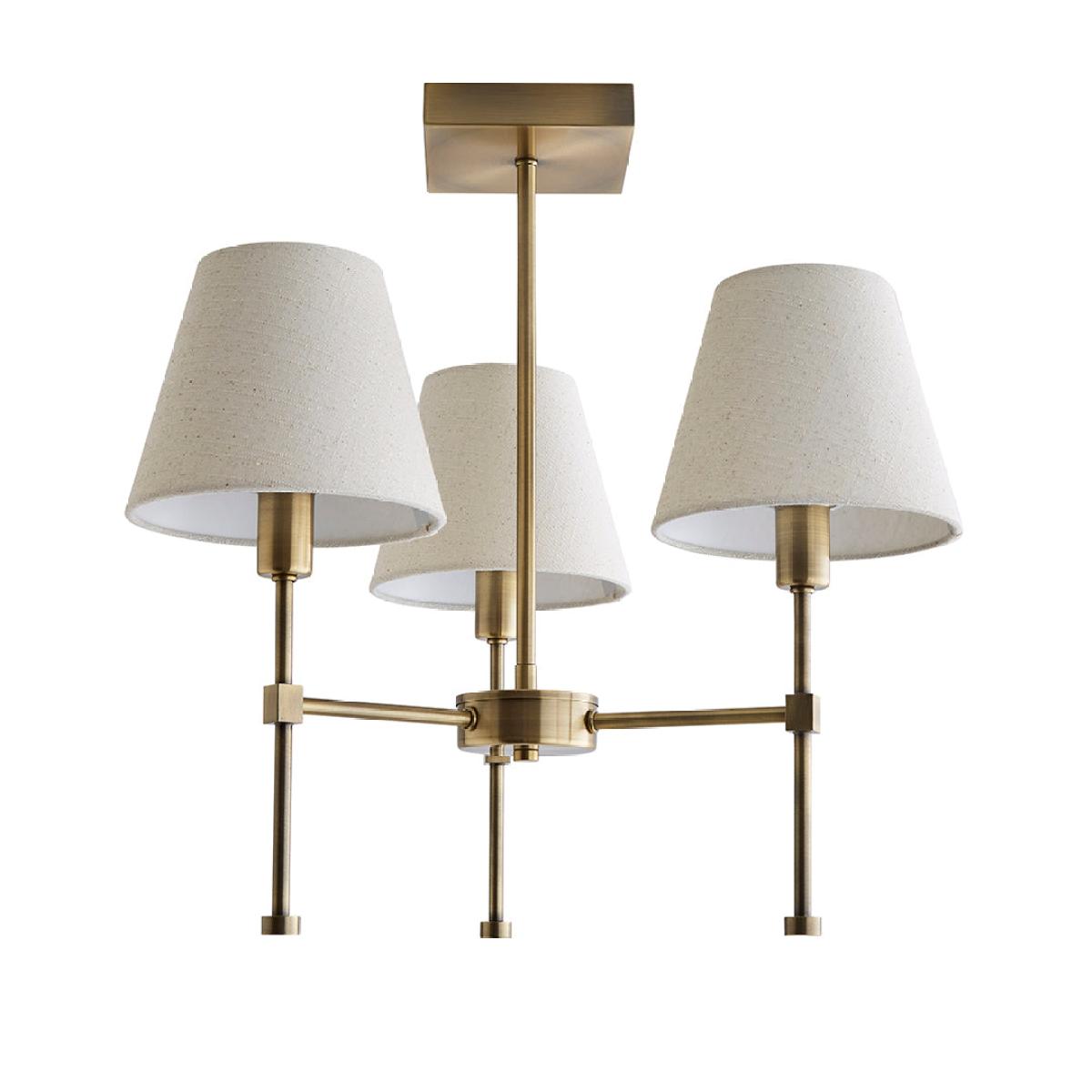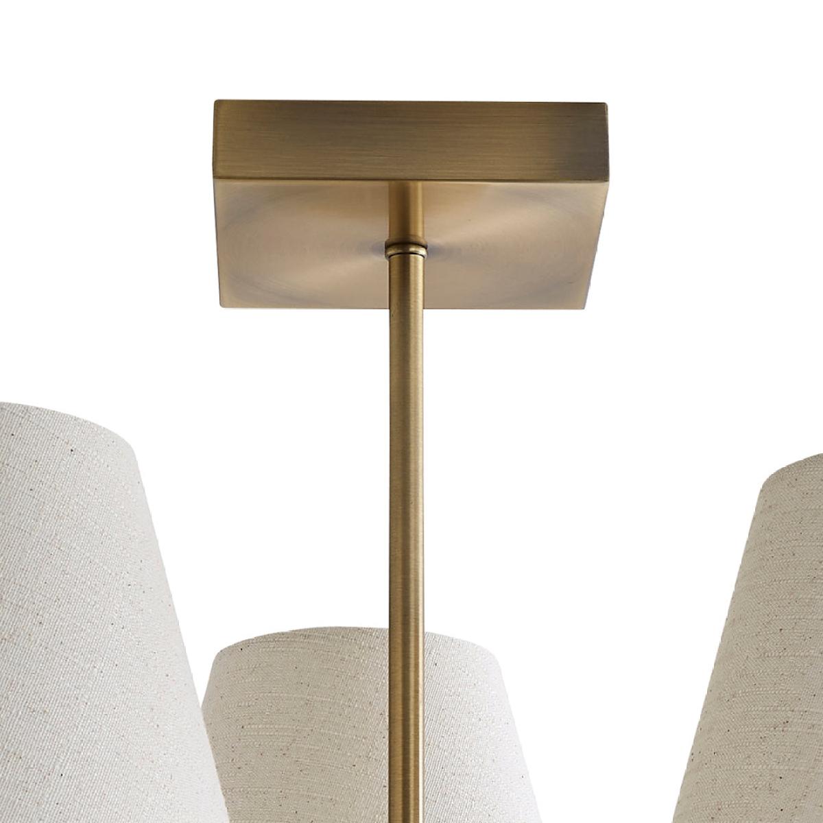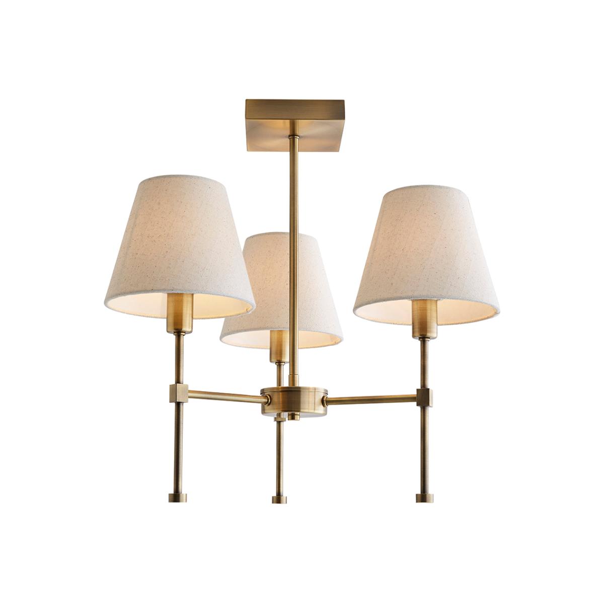 Bring timeless style and warmth to your home with the Taliah 3-Light Antique Brass Semi-Flush Ceiling Light, a Pagazzi Design exclusive that beautifully blends classic charm with contemporary detailing. Featuring a decorative antique brass finish, this elegant ceiling light is designed with a square ceiling plate, adding a modern twist to its traditional form. The fixture supports three fixed gimbals, each topped with a tapered drum shade crafted from natural textured fabric. The soft, neutral tones of the shades gently diffuse the light, creating a warm and inviting ambience perfect for living rooms, bedrooms, or hallways. The semi-flush design makes the Taliah ideal for spaces with lower ceilings, while its high-end finish and subtle details bring a sophisticated touch to any interior. For flexible mood lighting, the fitting is dimmable when used with compatible dimmable bulbs and an external dimmer switch.