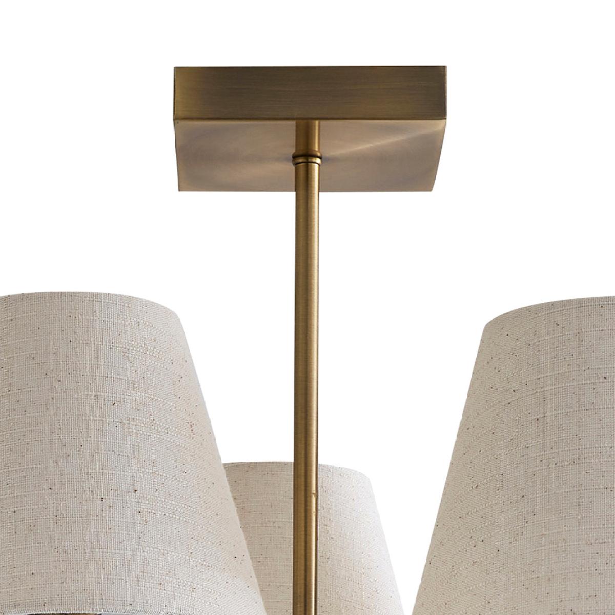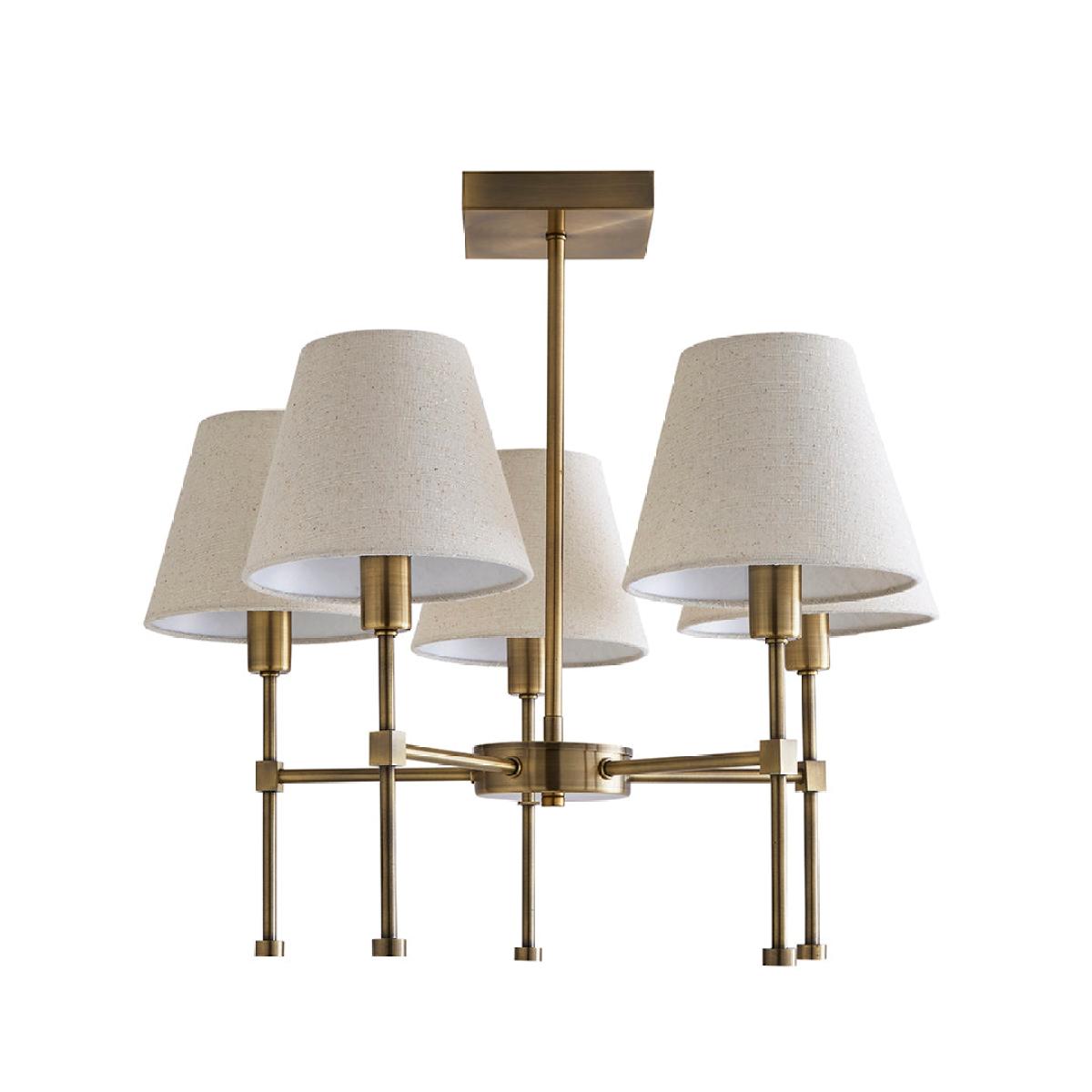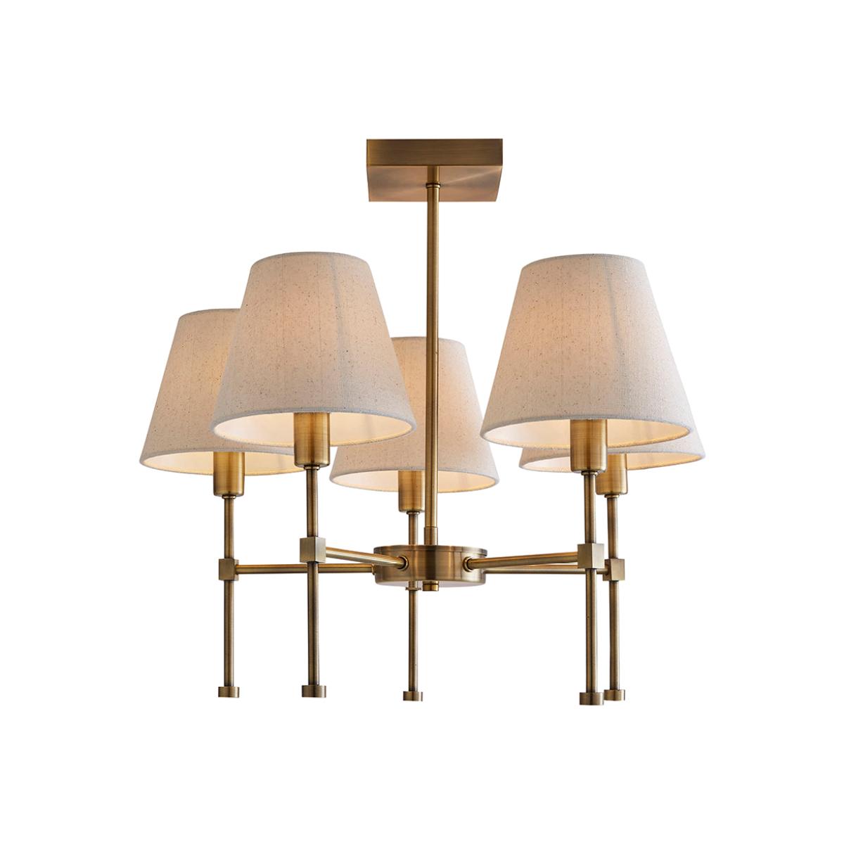 Enhance your interior with the refined elegance of the Taliah 5-Light Antique Brass Semi-Flush Ceiling Light, an exclusive design from Pagazzi Lighting. Perfectly balancing timeless style and modern sophistication, this ceiling light brings warmth, texture, and a touch of luxury to any living space. Crafted with an antique brass finish, the Taliah features a square ceiling plate that adds a sleek, contemporary twist to its classic form. The fitting is adorned with five tapered drum shades, each made from a beautifully textured natural weave fabric. These softly diffusing shades create a gentle, ambient glow — ideal for cosy, welcoming spaces. Supported by 3-way fixed gimbals, the shades are precisely angled to ensure excellent light distribution, while the semi-flush design makes it a perfect choice for rooms with lower ceilings. The Taliah is also dimmable when used with compatible dimmable bulbs and a dimmer switch, giving you full control over your room’s atmosphere.