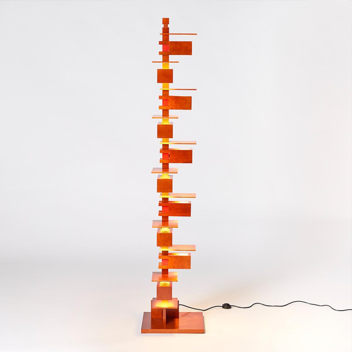 With special permission by the Frank Lloyd Wright Foundation, Japanese lighting brand Yamagiwa presents the cherry Taliesin 2 Floor Lamp. The design is inspired by Wright's Taliesin 1 Pendant Light, an original design that was created to illuminate a theatre at the architect's 1911 residence in Taliesin, Wisconsin. The Frank Lloyd Wright Foundation and Frank Lloyd Wright School of Architecture are now both located at this very same location. Crafted from cherry wood, the material was chosen after Wright's favourite colour, red. The sculptural lamp consists of a series of boxes which contain the light sources, each reflecting off the boards placed above and below them. Care instructions: Dust using a dry cloth. Requires 10 x Max 25W E14 bulbs (not included)