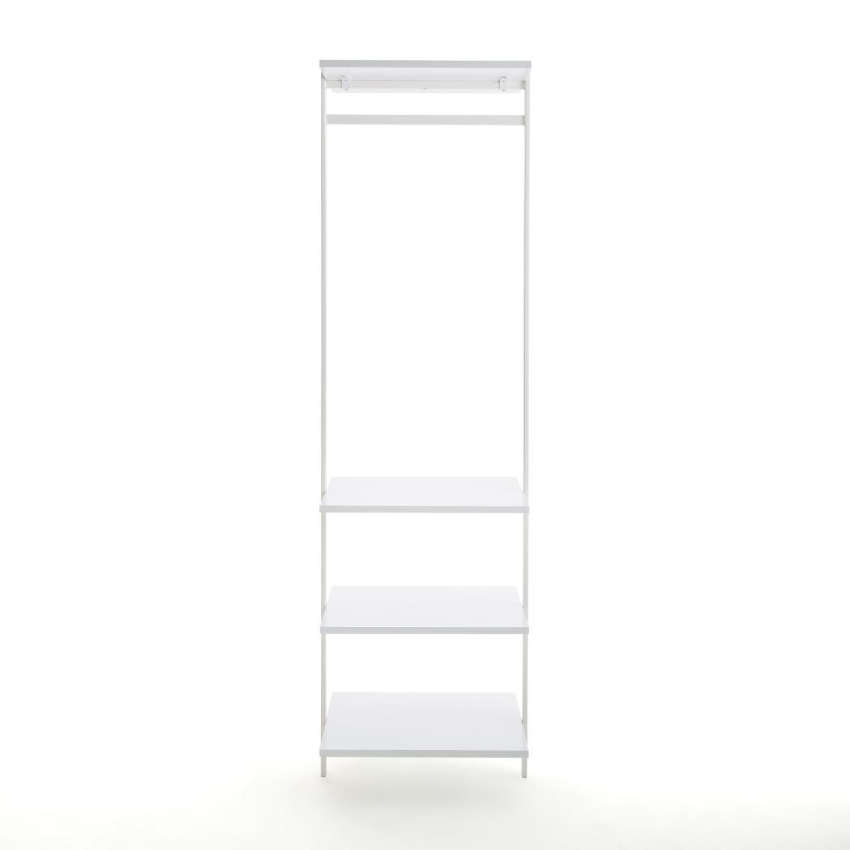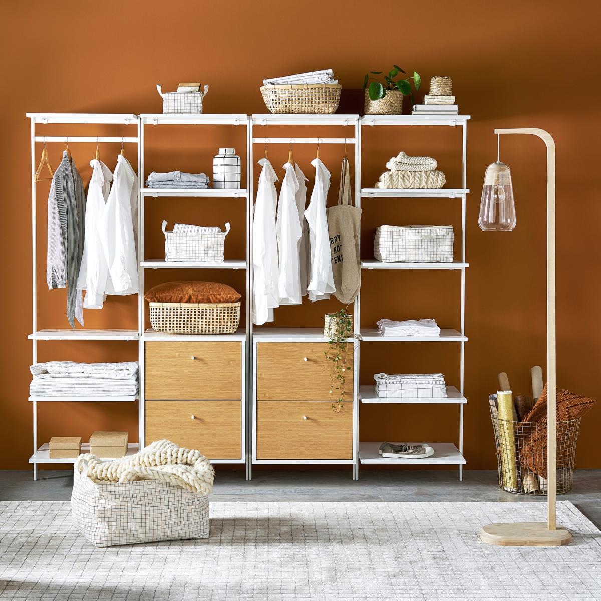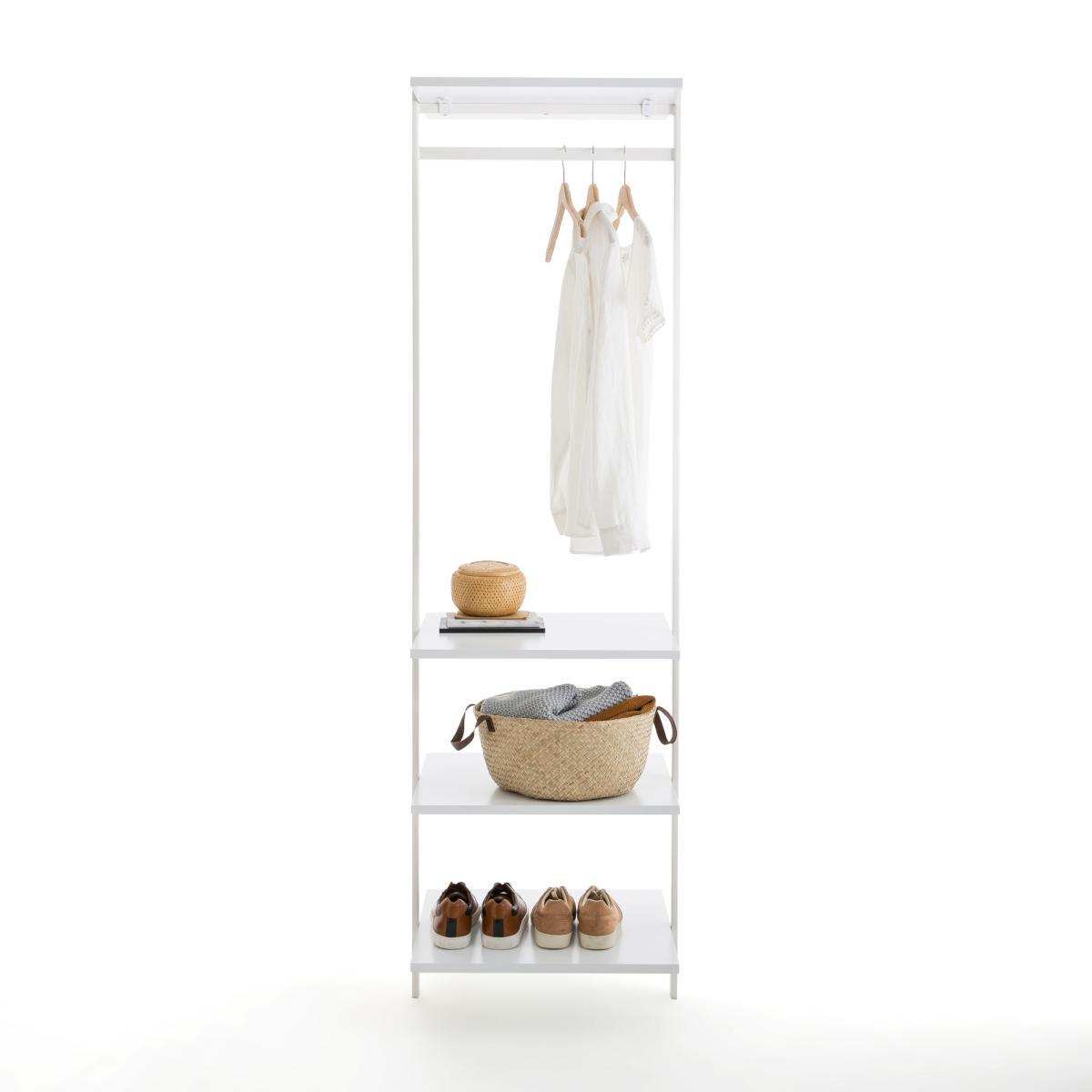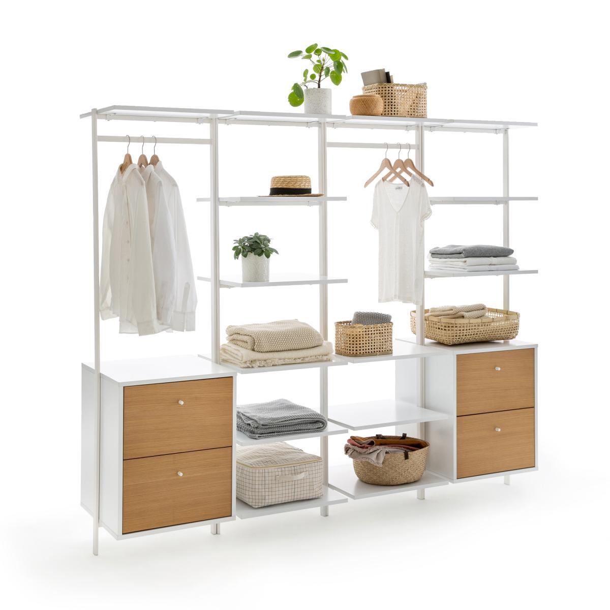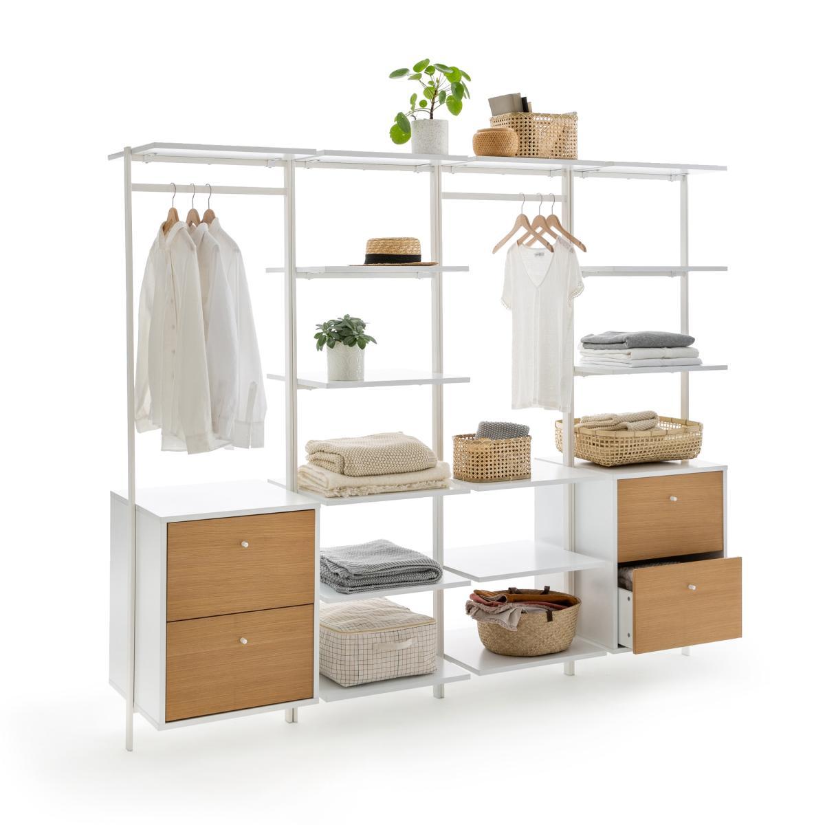 Our Talist range of modular furniture has all the elements you need to create your own personalised storage solution at home. With a wide range of wardrobe, shelf and drawer components available in different sizes and forms, the possibilities are endless. This wardrobe module, equipped with two drawers and hanging rail, mixes up light oak accents with white metal, creating a pleasing combination that's ideal for bedrooms or dressing rooms. Product details:. 3 shelves. 1 half-wardrobe. Must be fixed to wall Features:. Frame and bar in white metal, epoxy finish, matte effect. Shelves in white lacquered MDF, nitrocellulose varnish finish. Shop the full Talist range online.. Dimensions:. Width: 55.4 cm. Depth: 51cm. Height: 188 cm. Height of hanging section: 97.5cm. Distance between 3 lowest shelves: 29cm. Home Delivery: Your Talist module is supplied ready to assemble, with instructions. It will be delivered to your door!Note! Please check that all access points are large enough to accommodate your delivery (doors, stairs, lifts)..Dimensions and weight of parcel:1 box. L202 x D61 x H11 cm. 24kg.