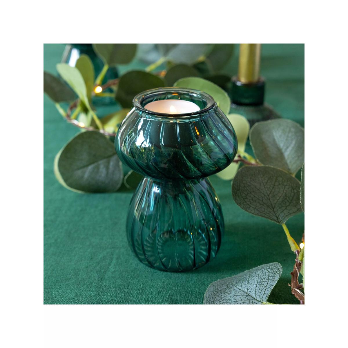 I love this mushroom glass candle holder for its playful yet sophisticated shape and striking green hue. It works really well in both modern and eclectic interiors, adding a pop of colour and texture to coffee tables, sideboards, or mantelpieces. To style it effectively, try pairing it with natural materials like wooden trays or woven textiles for a cosy, layered look. It also makes a lovely centrepiece when paired with candles of different heights, creating a warm and inviting atmosphere. Its unique form lends itself well to both everyday use and special occasions, making it a versatile addition to any space.
