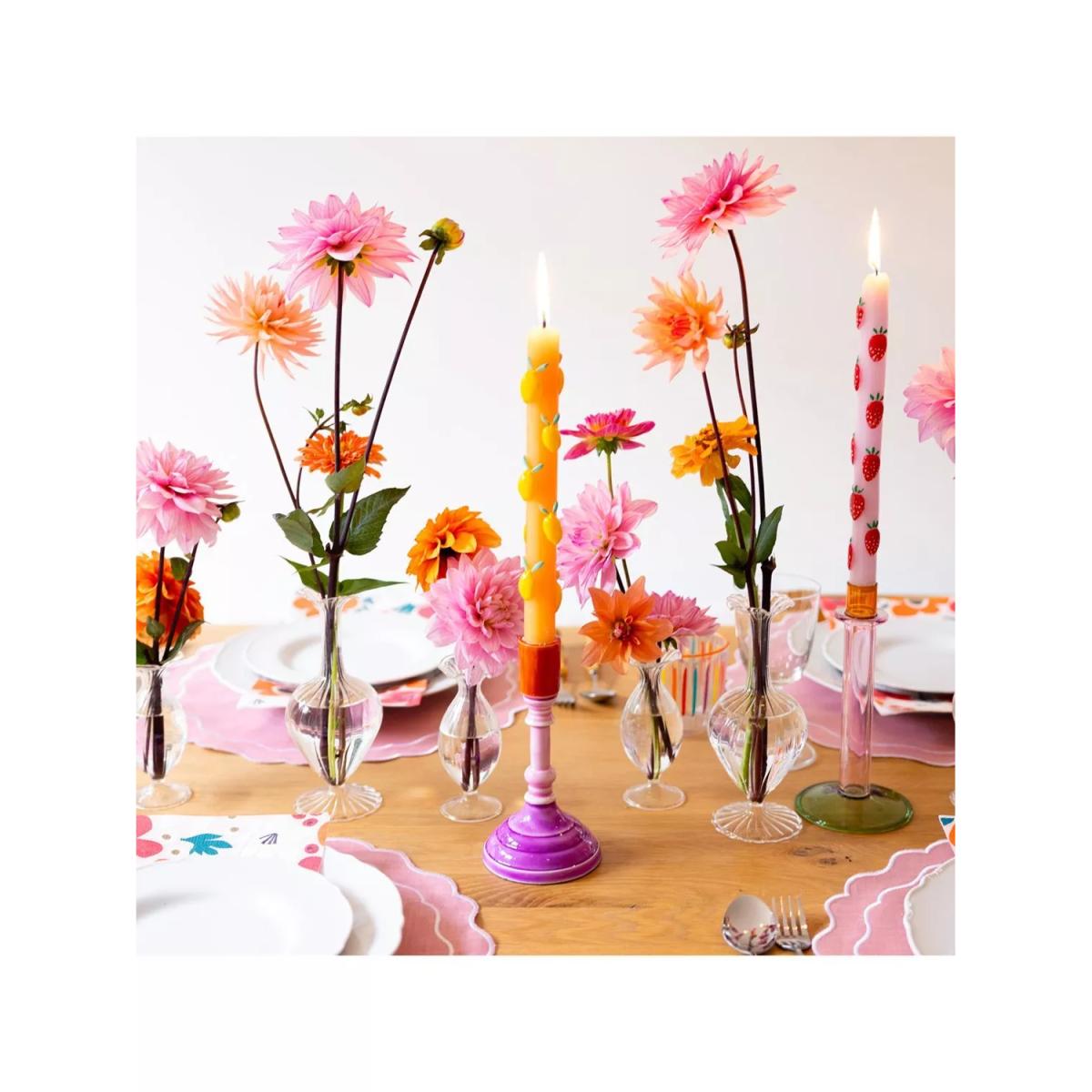 This popular pattern never fails to please. In each pack, you'll find two pastel pink dinner candles with 3D hand-painted illustrations of individual strawberries. Ideal for garden parties and long, lazy outdoor lunches, each candle is unfragranced and has a burn time of up to eight hours.