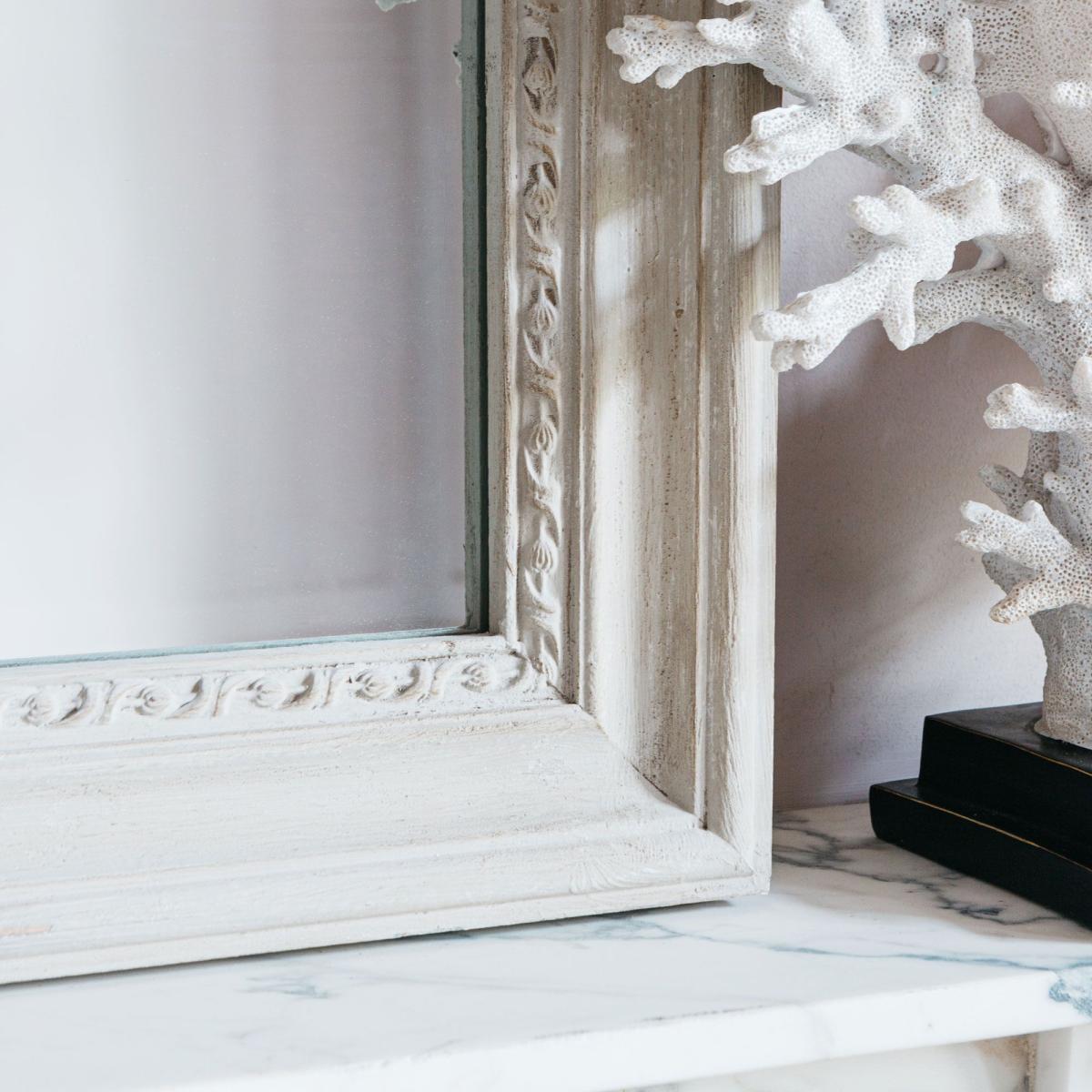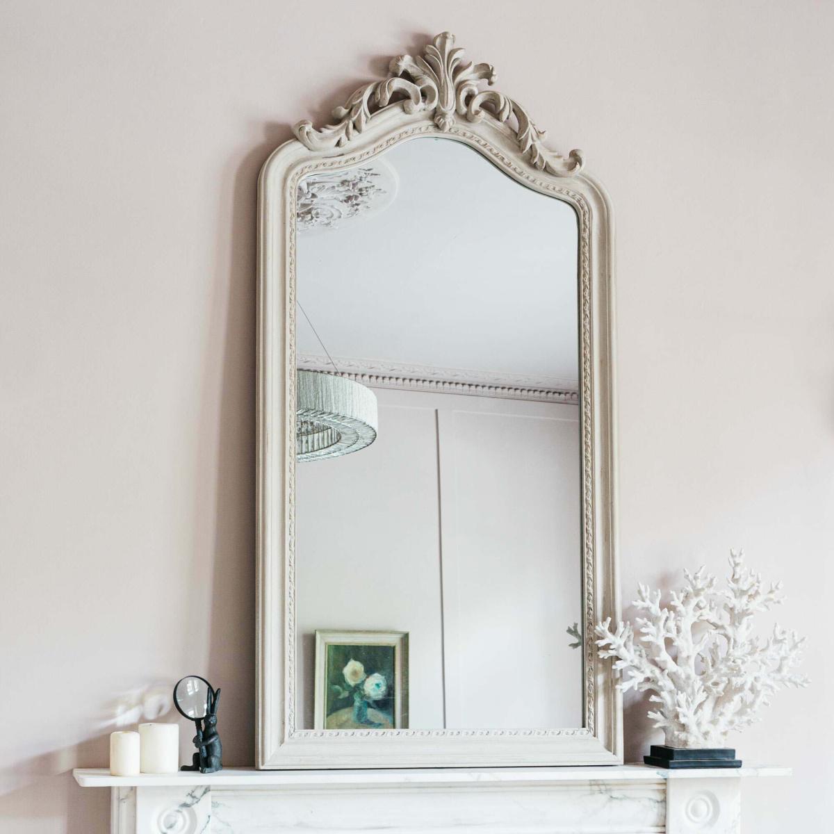 An oversized French renaissance style mirror crafted from paulownia wood with a matte chalk painted frame and ornate detailing.