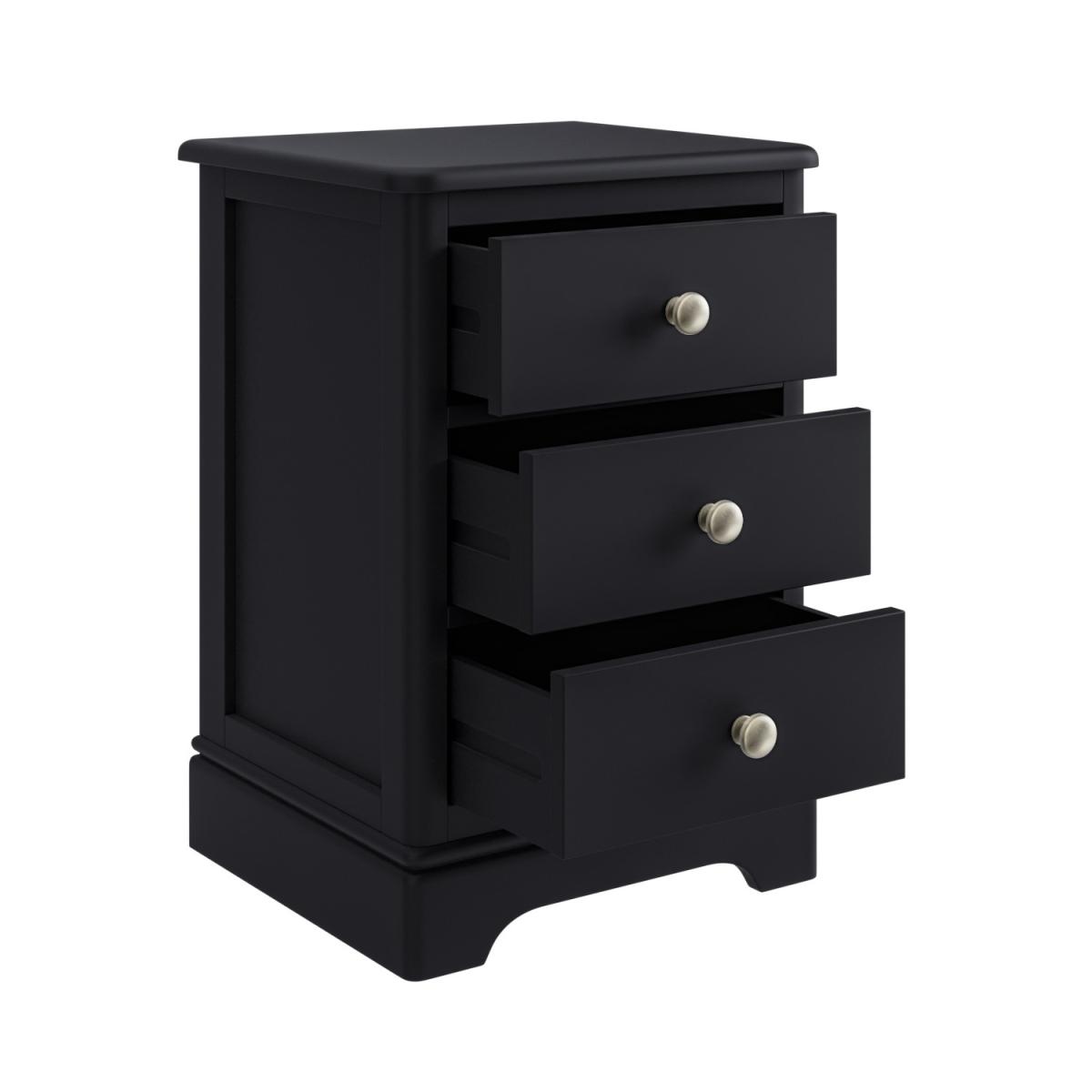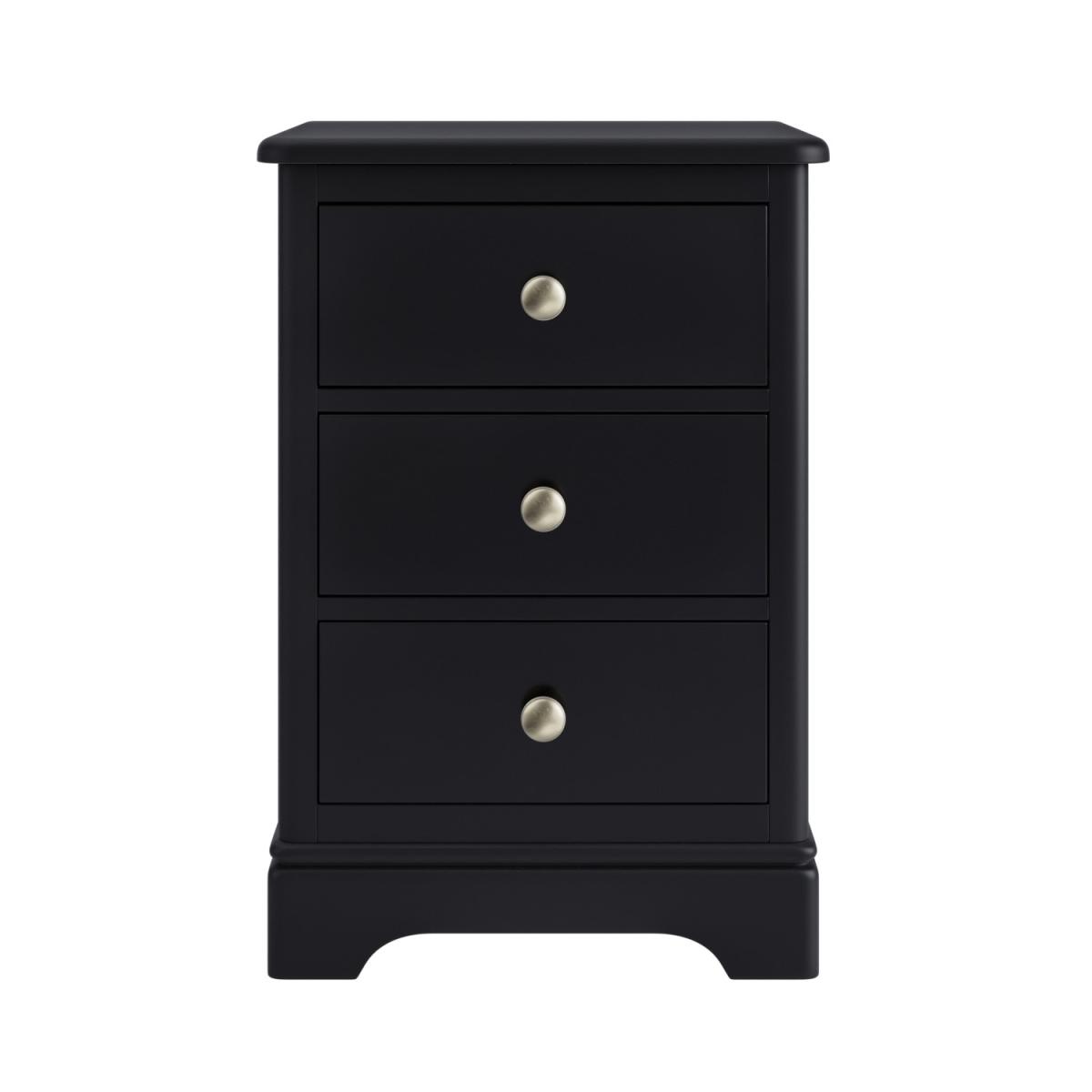 All about me This modern bedside table would make a stunning addition to any bedroom. With its bold silhouette thanks to its black painted finish and roomy drawers, it's versatile, practical and timeless. It makes perfect storage for bedroom items and has enough space on top for a brew, lamp, bedtime read and even your smartphone. With a solid pine wood frame, it's so durable. Need to know Product dimensions:W45 x D40 x H65 cm Inner drawer dimensions:W32.4 x D28.8 x H11.8 cm Product weight: 13.5kg Number of drawers: 3 Colour: Black Finish: Painted and brushed nickel (handles) Material: Solid pine wood (frame), MDF (inlay panels, drawer sides and front), wooden runner and metal (handles) Assembly required: No Packaging dimensions: W53 x D48 x H75 cm Packaging weights: 17.5kg