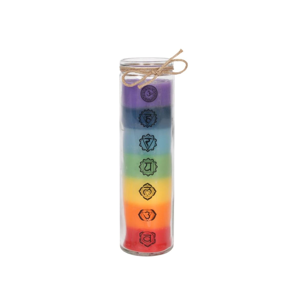 This beautiful candle is presented in a tall glass holder with seven layers of coloured wax, each representing one of the seven chakras and features the corresponding chakra symbol. The perfect gift for someone who enjoys yoga or reiki to help enhance their spiritual and physical wellbeing. Made from paraffin wax.