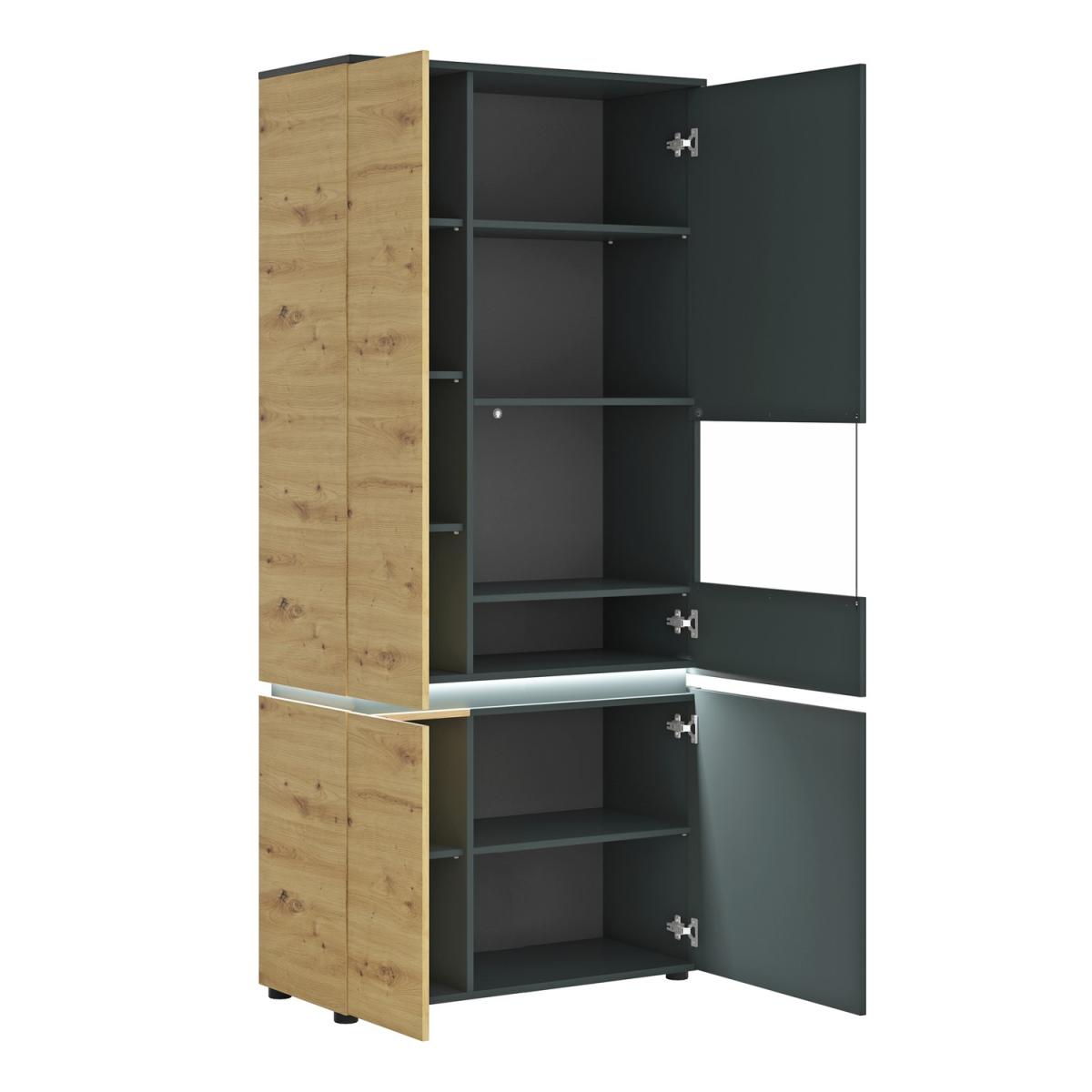 A tall display cabinet with glazing in a geometric shape and a modern combination of Artisan Oak and Grey Cosmos decor is a solution for people looking for a unique and timeless style. The inside of the site has a lot of storage space, as well as a space behind the glass, where you can display interesting accessories and additionally emphasize their charm with optional lighting (sold separately). The furniture uses an ergonomic handle-free solution, soft-close accessories and tempered glass. The big advantage of the display case from the Luci collection is the constructional lighting (sold together), which gives the block a unique, but very subtle look.