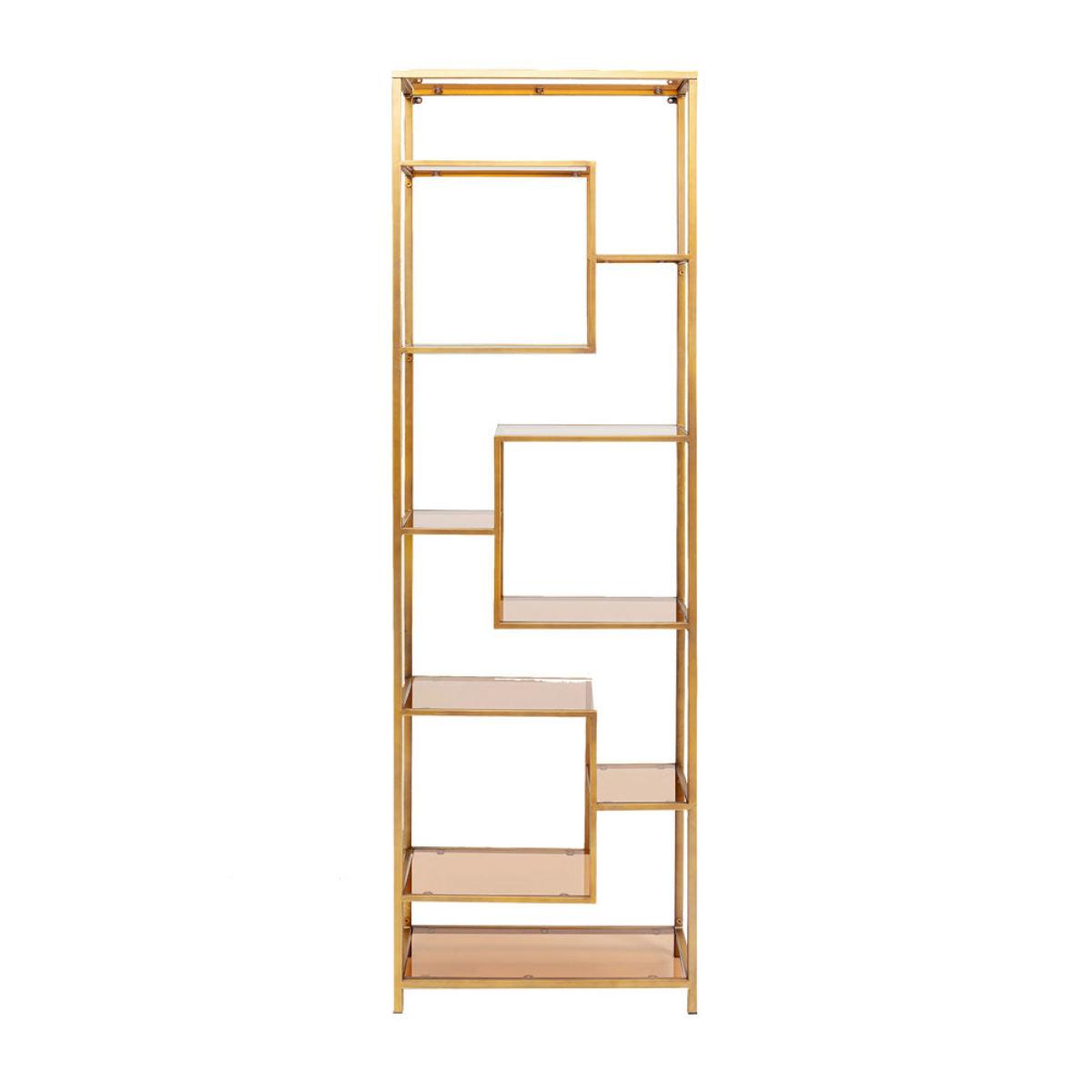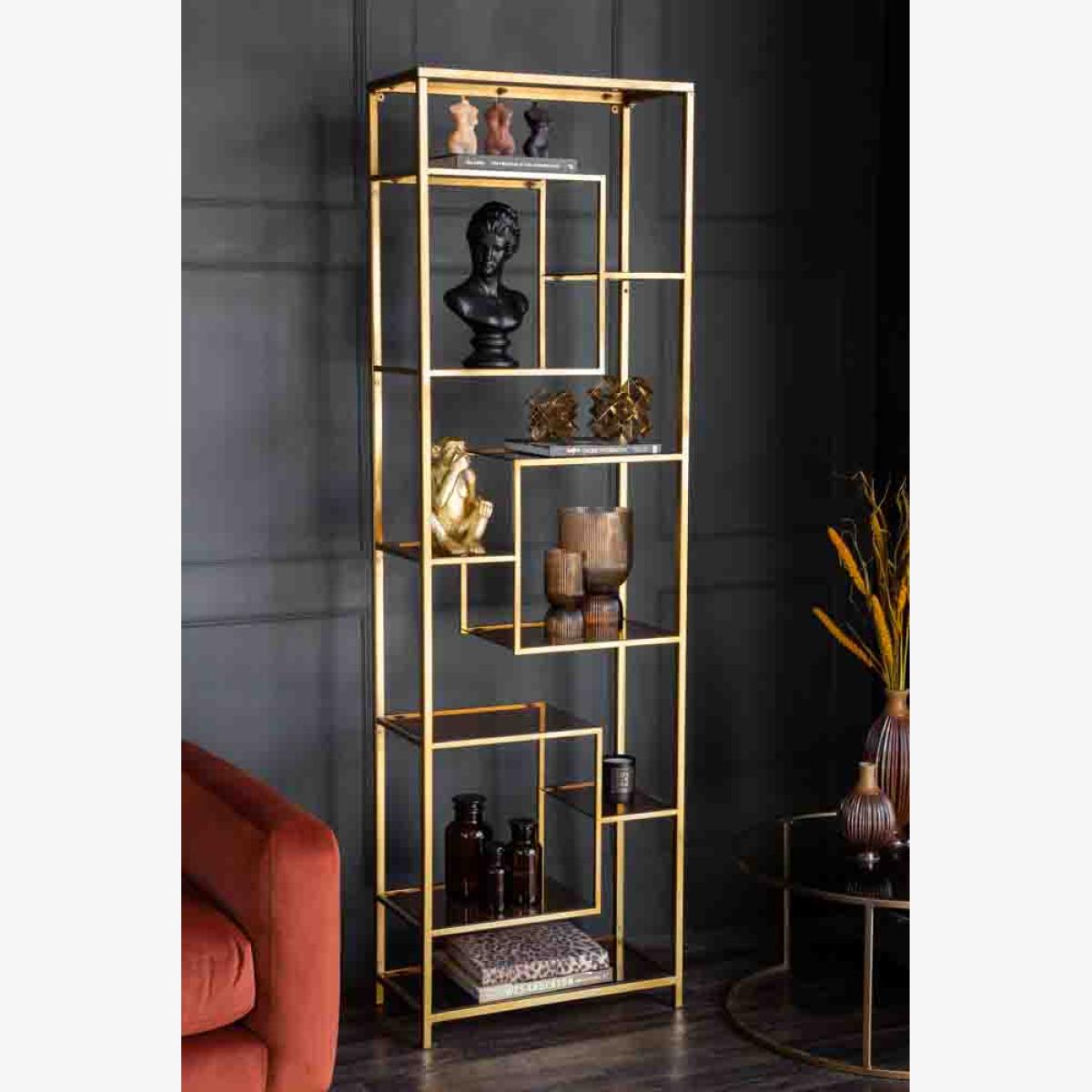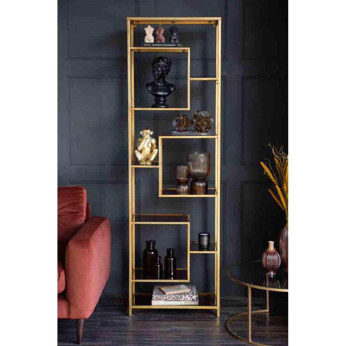 About The Tall Gold & Glass Art Deco Shelving Unit Display a luxurious bold feature in your interior scheme with the Tall Gold & Glass Art Deco Shelving Unit. Showcasing modern glamour with hints of nostalgia, this extraordinary shelving unit features an intriguing cubic shape with its 10 glass shelves that exude a delightful amber colour palette and striking gold frame that gives us 70’s Mad Men vibes. Measuring 195cm in height, 60cm in width and 30 cm in diameter, this tall shelving unit will make for an eye-catching living room display. Why We Think You’ll Love The Glass Shelving Unit Offering the perfect size to display coffee table books as well as novels, this shelving display would make for an interesting bookshelf as well as a delightful place to showcasing decorative ornaments and quirky vases alike. We love how each shelf is at a different height as this provides an eye-catching and quirky look that’ll uplift your interior scheme with intriguing allure, so what’s not to love?! Where To Style The Gold Shelving Unit This tall glass shelving unit is the ideal large piece of furniture that’s wonderful for dividing a large room into smaller and more intimate spaces. If you have the room, display three of these tall shelves in a row for a striking statement that exudes a luxurious hotel-style effortlessly stealing the show in your interior scheme. Get creative with your styling and display an array of ornaments, candles, vases and books for a unique display that has your own personal stamp on it.