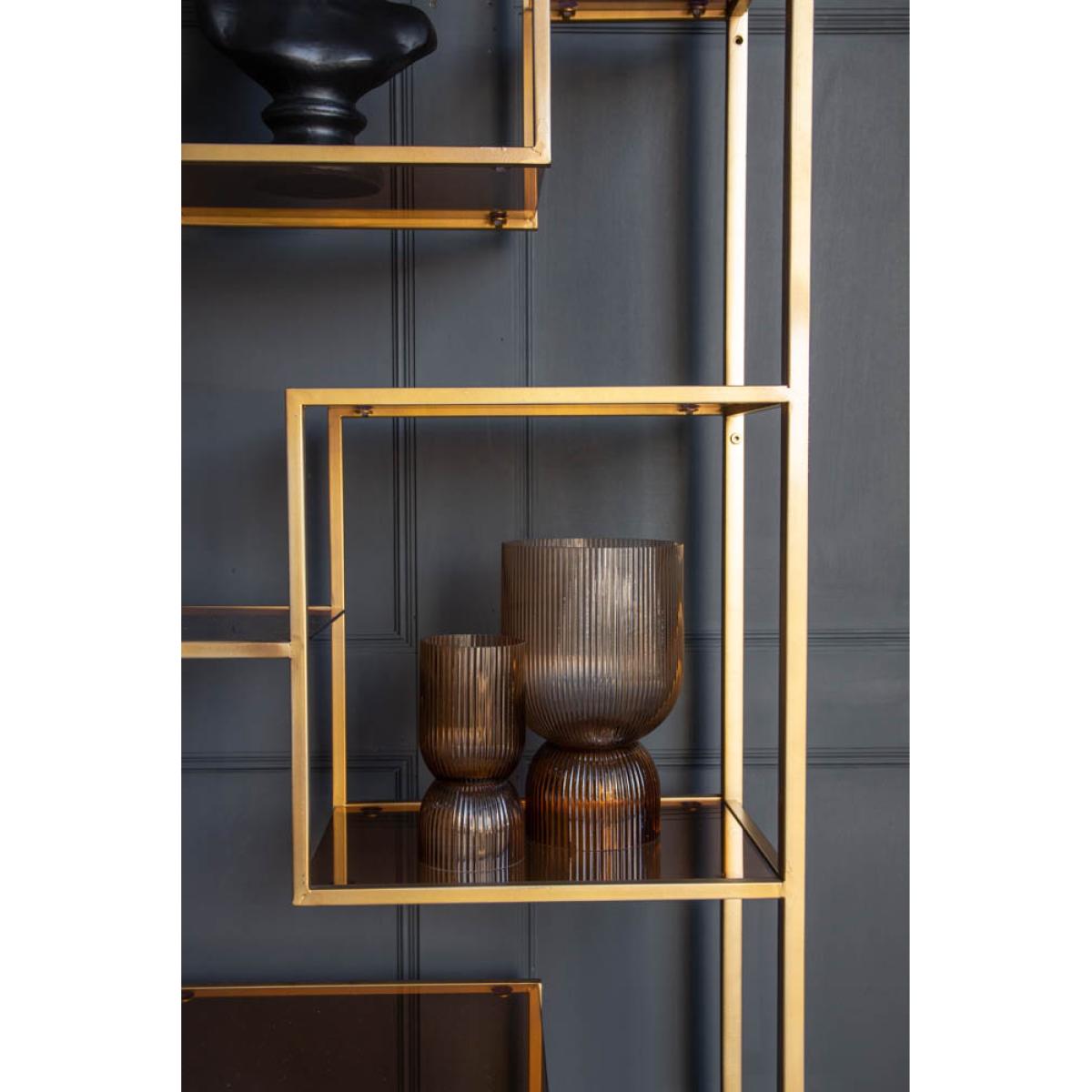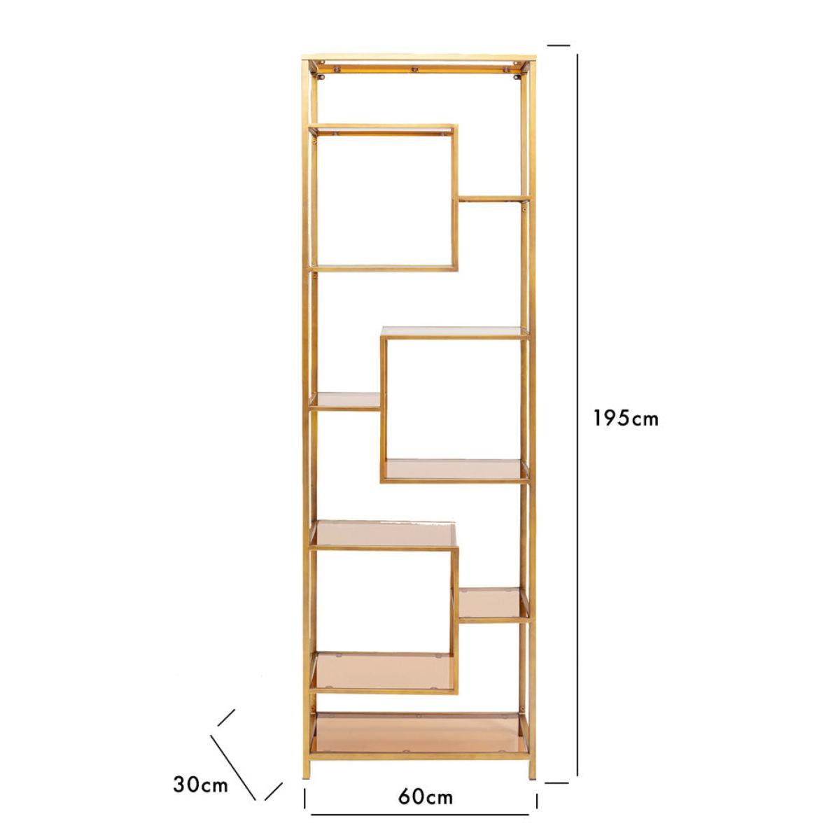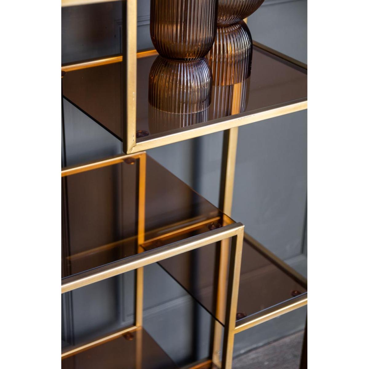 About The Tall Gold & Glass Art Deco Shelving Unit Display a luxurious bold feature in your interior scheme with the Tall Gold & Glass Art Deco Shelving Unit. Showcasing modern glamour with hints of nostalgia, this extraordinary shelving unit features an intriguing cubic shape with its 10 glass shelves that exude a delightful amber colour palette and striking gold frame that gives us 70’s Mad Men vibes. Measuring 195cm in height, 60cm in width and 30 cm in diameter, this tall shelving unit will make for an eye-catching living room display. Why We Think You’ll Love The Glass Shelving Unit Offering the perfect size to display coffee table books as well as novels, this shelving display would make for an interesting bookshelf as well as a delightful place to showcasing decorative ornaments and quirky vases alike. We love how each shelf is at a different height as this provides an eye-catching and quirky look that’ll uplift your interior scheme with intriguing allure, so what’s not to love?! Where To Style The Gold Shelving Unit This tall glass shelving unit is the ideal large piece of furniture that’s wonderful for dividing a large room into smaller and more intimate spaces. If you have the room, display three of these tall shelves in a row for a striking statement that exudes a luxurious hotel-style effortlessly stealing the show in your interior scheme. Get creative with your styling and display an array of ornaments, candles, vases and books for a unique display that has your own personal stamp on it.