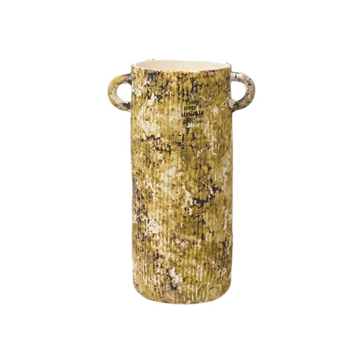 The Tall Green Ceramic Vase is a captivating piece! Its textured and glazed ceramic composition, adorned in shades of greens, yellows, and browns, must lend it a natural, earthy charm. Such a versatile piece, suitable for standing out on its own or blending seamlessly within a collection. Its sunny disposition and double handles make it a standout addition to any space. It must be a pleasure to admire its beautiful proportions and intricate details up close.