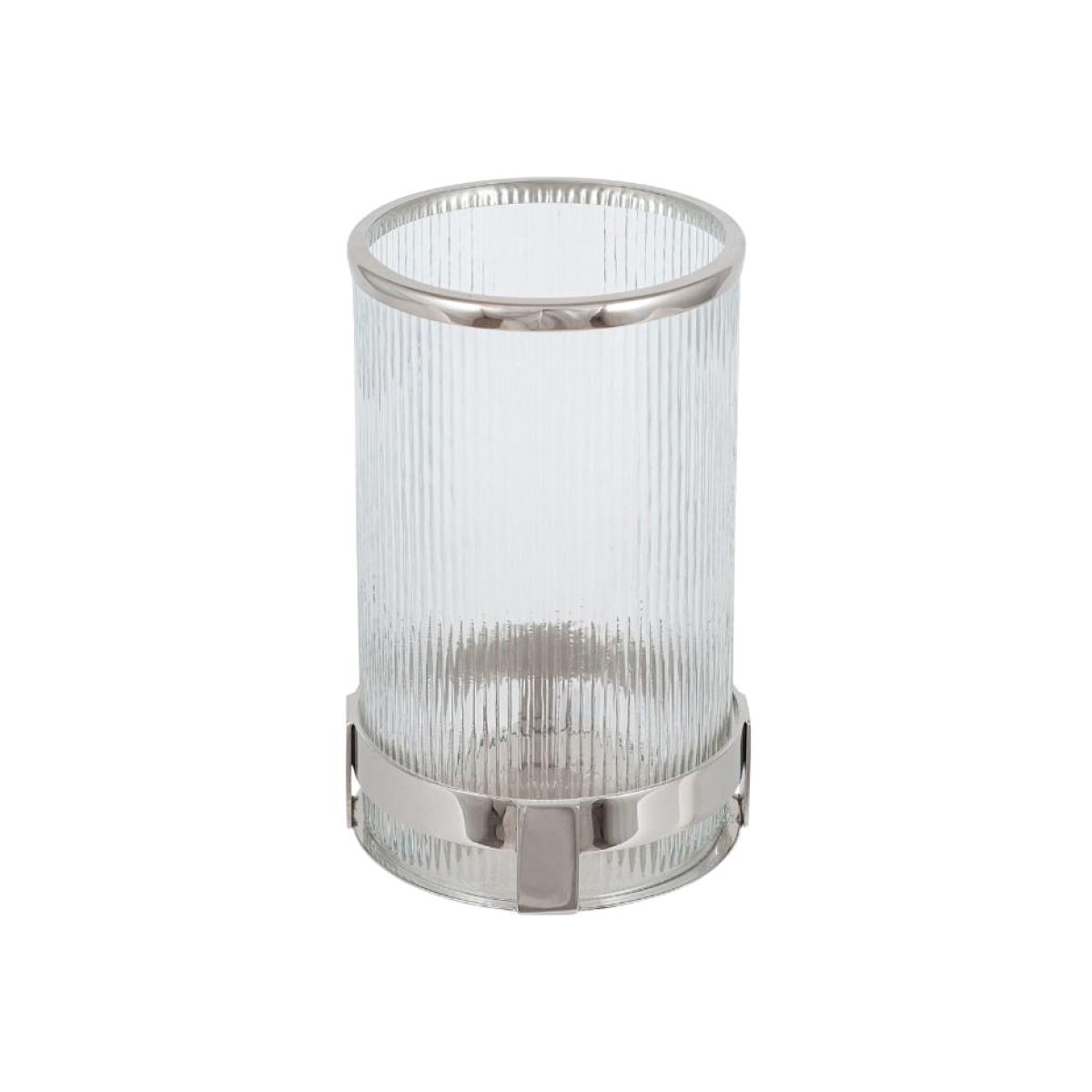 Textured glass and silver tall candle holder. The Hurricane candle holder features textured glass and silver detailing. Perfect for creating a cosy glow to any room. Available in two size options, that can be placed in multiples or singular for desired aesthetic.