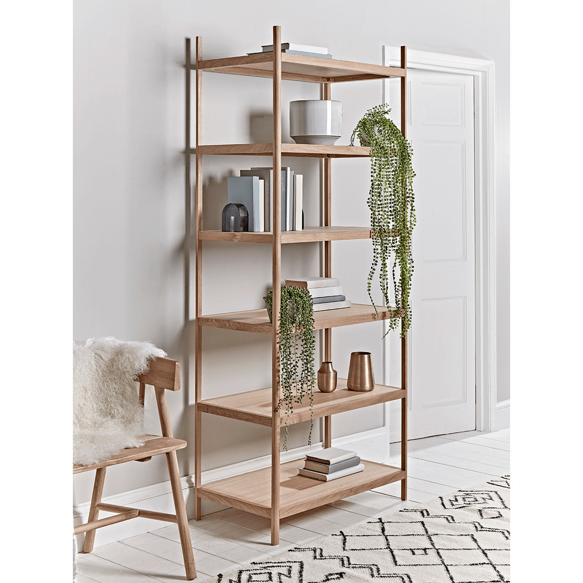 I love this tall oak shelving unit for its clean, minimalist design and natural warmth, which makes it a versatile addition to many interiors. It works particularly well in contemporary, Scandi, or rustic settings where the focus is on lightness and natural materials. Practical styling tips include using the top shelves for decorative accessories or plants to draw the eye upwards, while the lower shelves can be utilised for books or storage boxes for organisation. To keep it looking balanced, vary the heights and textures of your accessories, and incorporate some greenery for a fresh, lived-in feel. It’s an excellent piece for adding both function and understated style to living rooms, offices, or even bedrooms.