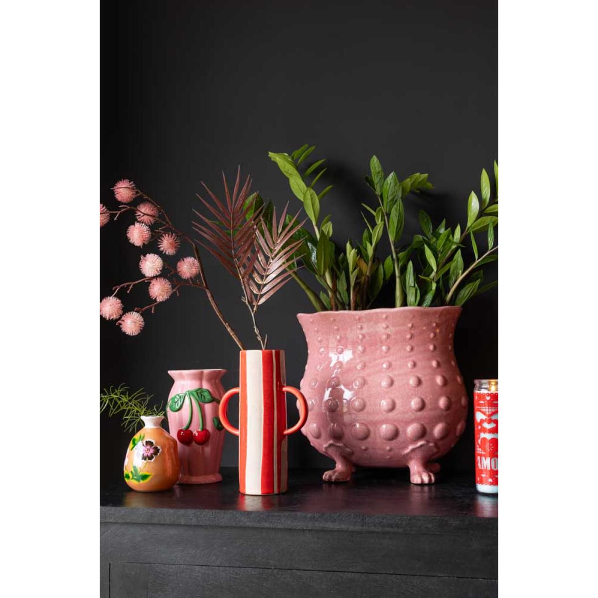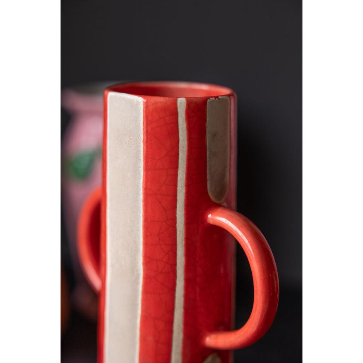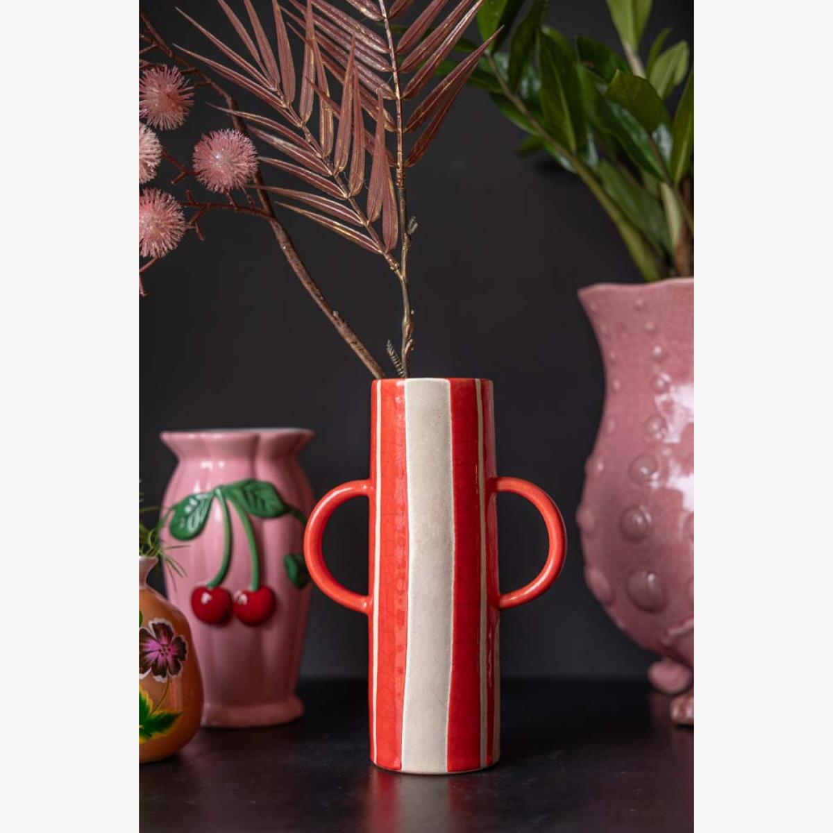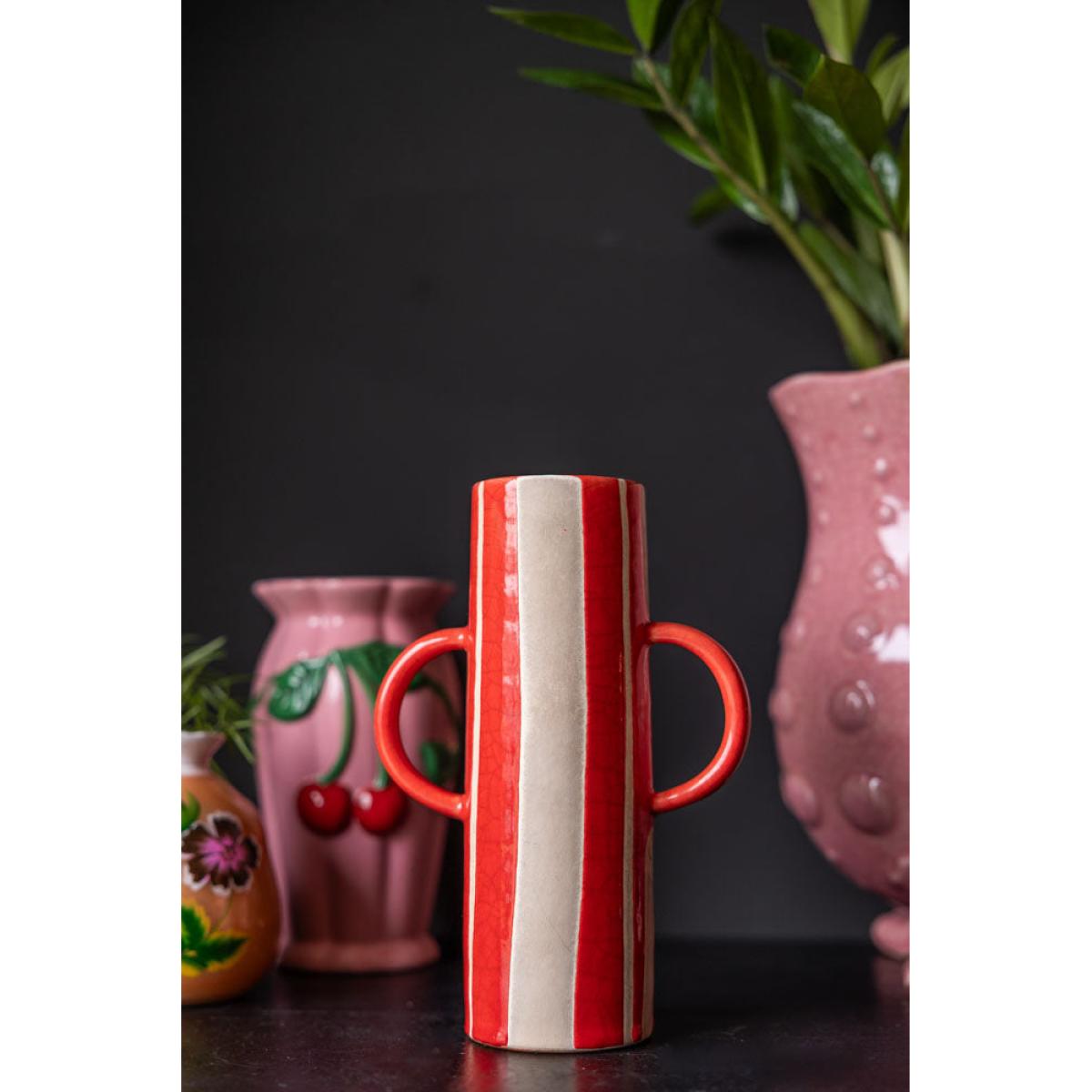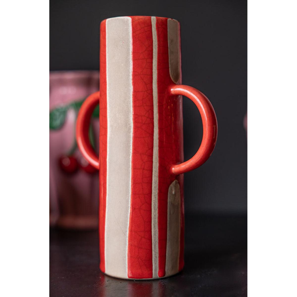I love this tall red stripe vase with handles for its bold colour and clean lines, making it a versatile piece that can elevate both modern and eclectic interiors. Its striking design works particularly well in neutral or minimalist spaces, where it can act as a statement piece, but it can also add a pop of colour to more vibrant schemes. Practical styling tips include using it as a standalone feature or filling it with simple stems or dried grasses for an effortless, contemporary look. Its handles make it easy to move around and position, so consider placing it on a console table, sideboard, or even as a centrepiece on a dining table to create visual interest.