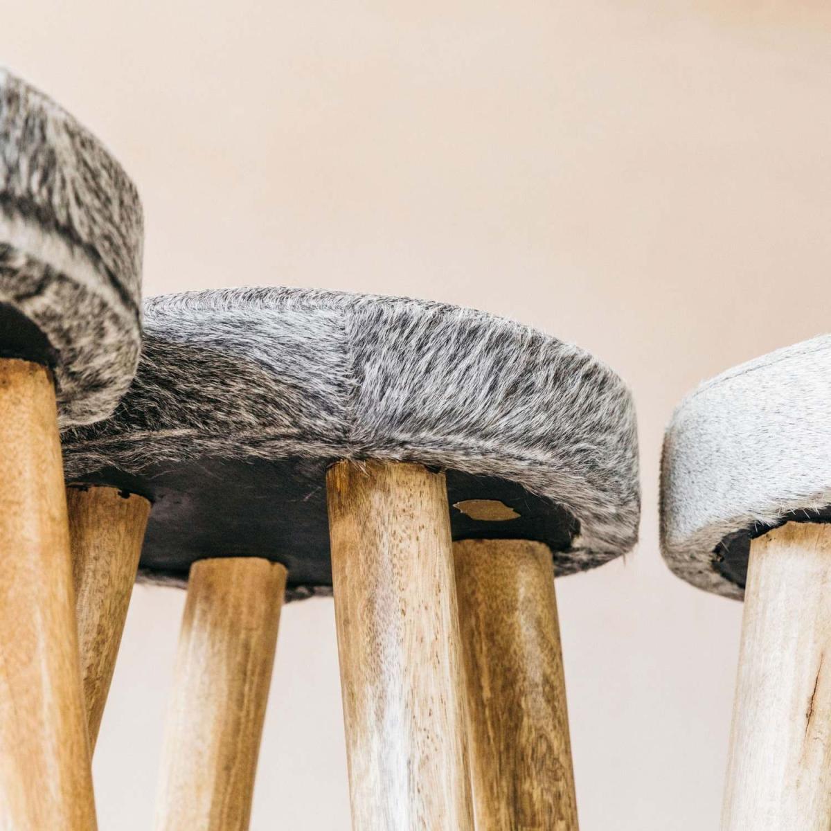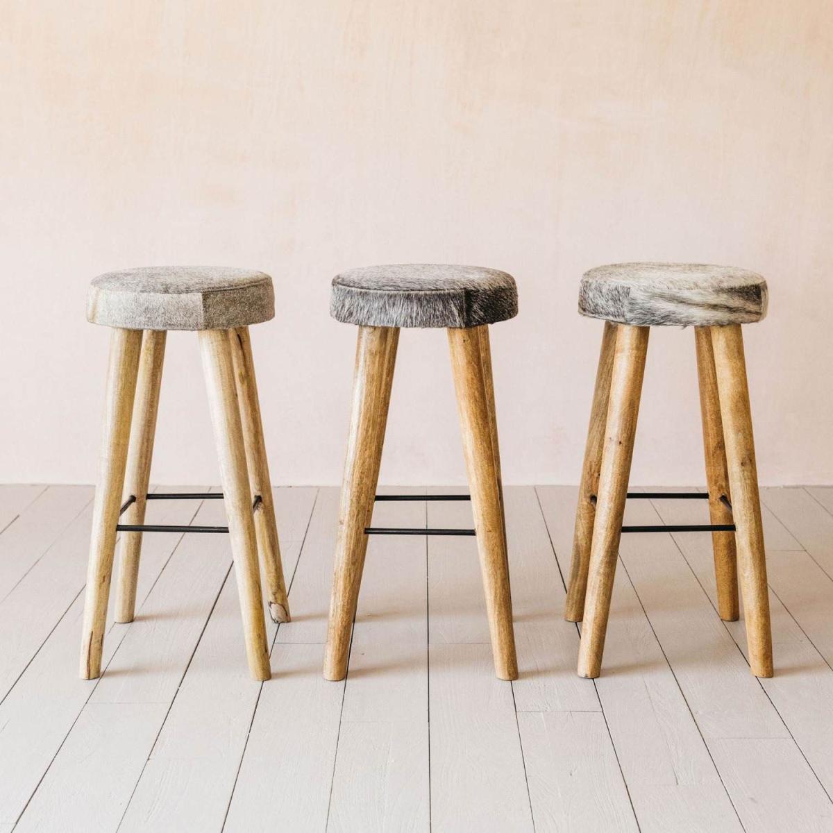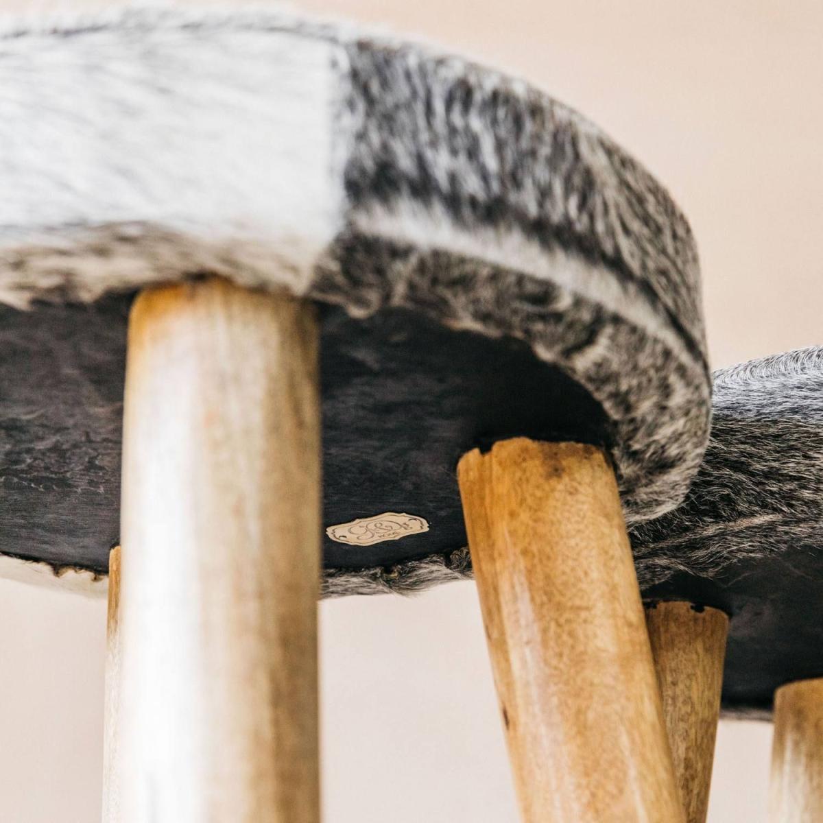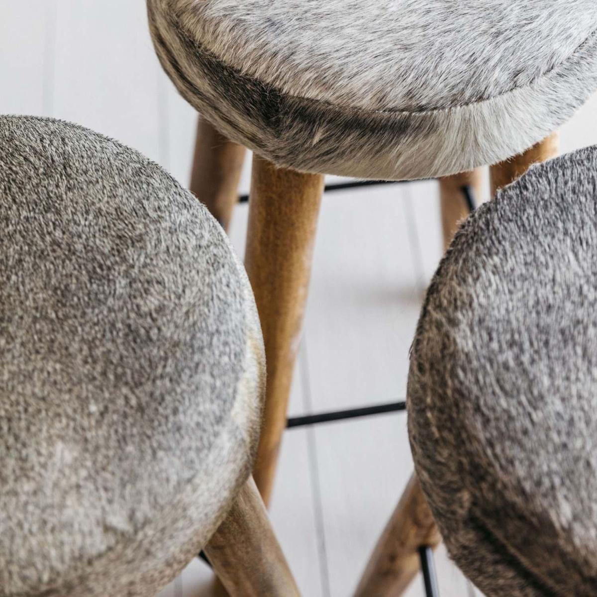 Handcrafted from solid mango wood with a sumptuously upholstered grey cowhide seat pad, our stools feature a sleek, black iron footrest and are comfortable and durable enough for everyday use in your kitchen.