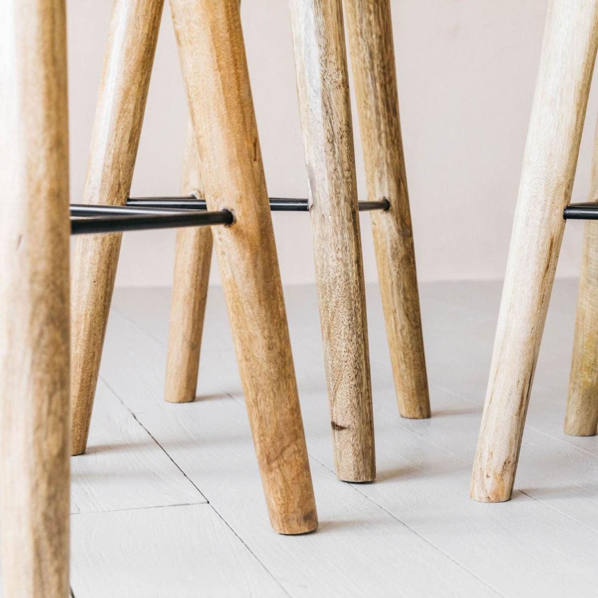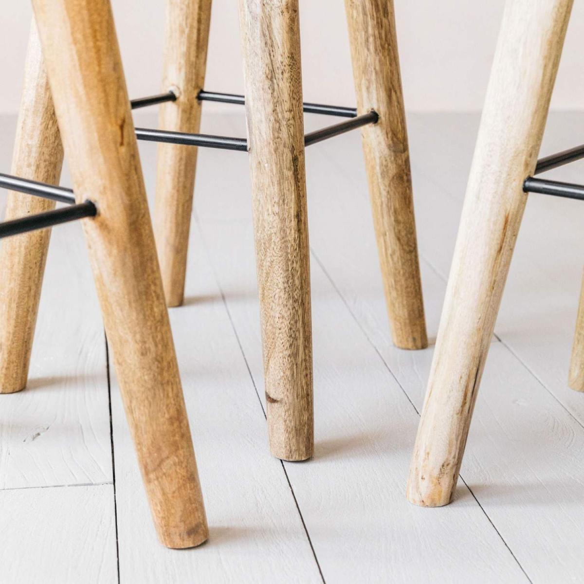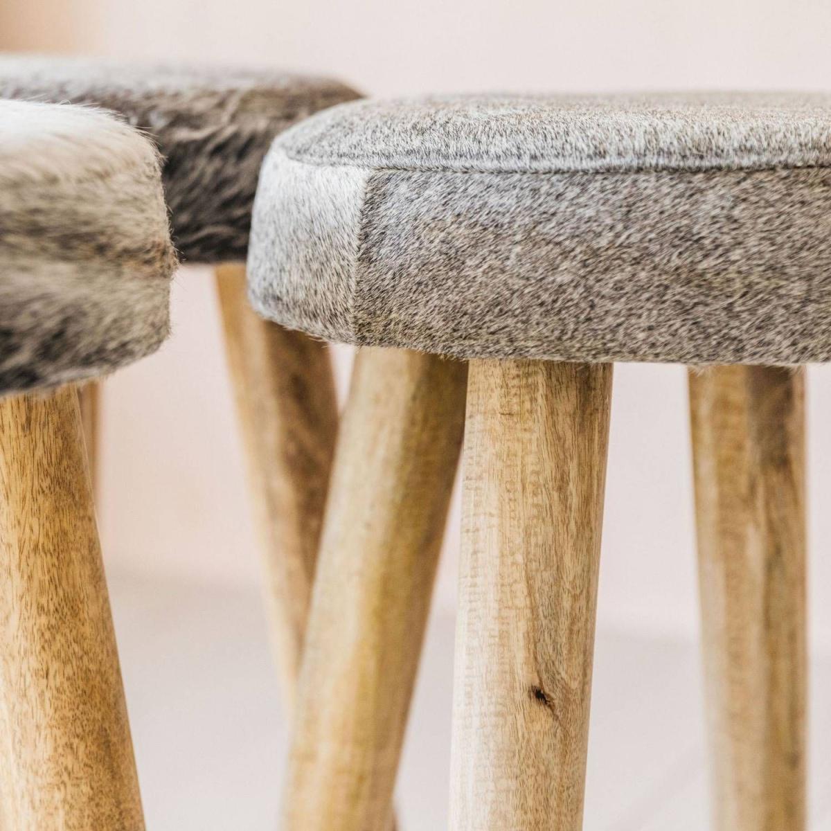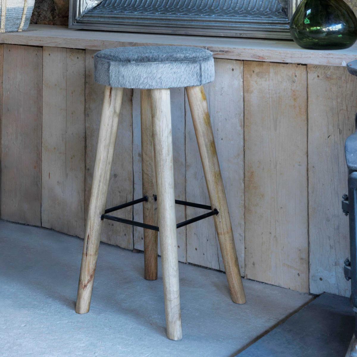 Handcrafted from solid mango wood with a sumptuously upholstered grey cowhide seat pad, our stools feature a sleek, black iron footrest and are comfortable and durable enough for everyday use in your kitchen.