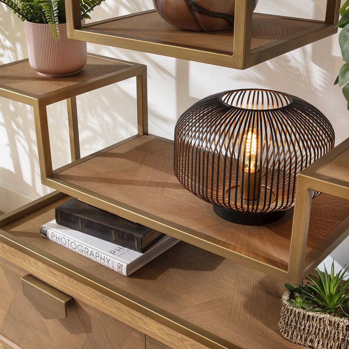 This stunning large gold metal display unit stands 207cm tall, offering a chic and modern statement piece for any space. Featuring unique shelving, a premium oak veneer finish, and two drawers, this bookcase combines style and function. Perfect as a shelving unit, display cabinet, or metal bookcase. Crafted with a striking gold metal frame, this modern display unit exudes sophistication. Its premium oak veneer shelves and base provide a warm contrast to the sleek metal design. With two practical drawers at the base, this metal shelving unit offers both aesthetic appeal and practical storage. The shelves boast a stunning interwoven wood pattern, a testament to the craftsmanship and artistry behind this book shelf. This thoughtful design transforms the unit into more than just a storage piece; its a contemporary display case that elevates any room. This metal display unit is delivered fully assembled, ready to enhance your space immediately. Ideal for homes, offices, or commercial settings, this modern bookcase blends chic design with practicality, making it a standout piece in any interior. W120cm D40cm H207cm Preassembled Tall Display Unit with Drawers