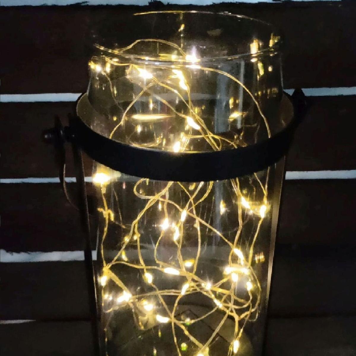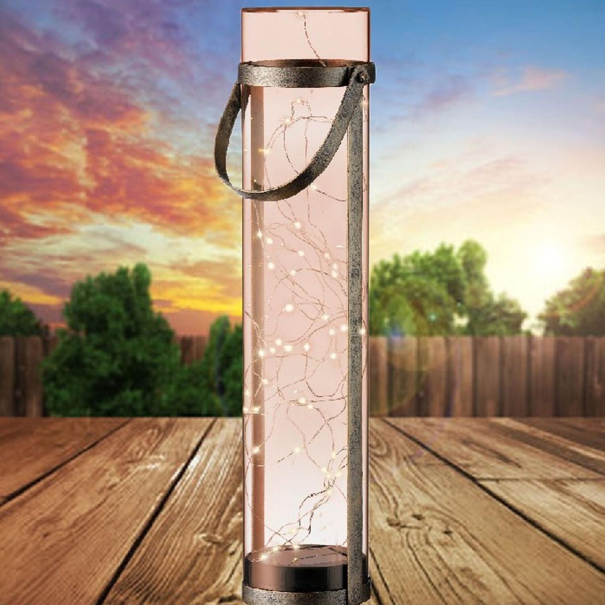 This elegant amber solar lantern illuminates with a warm white light creating a warm and welcoming atmosphere to your outdoor space. Filled with 50 micro LED wire lights, which will give up to 6 hours of active light once charged with its built in solar panel on the inside base of the lantern. Its solar function once switched on at the base, will automatically light us at dust without the need for batteries or a plug. An eco friendly way of lighting up your garden!The lantern stands at 46cm tall, 10.5cm in diameter and features a sturdy metal cage with an integrated handle enabling you to hang the lantern as well as using it as a free standing light. The classy design is perfect for outdoor dining with family and friends, or just a simple decorative garden light.