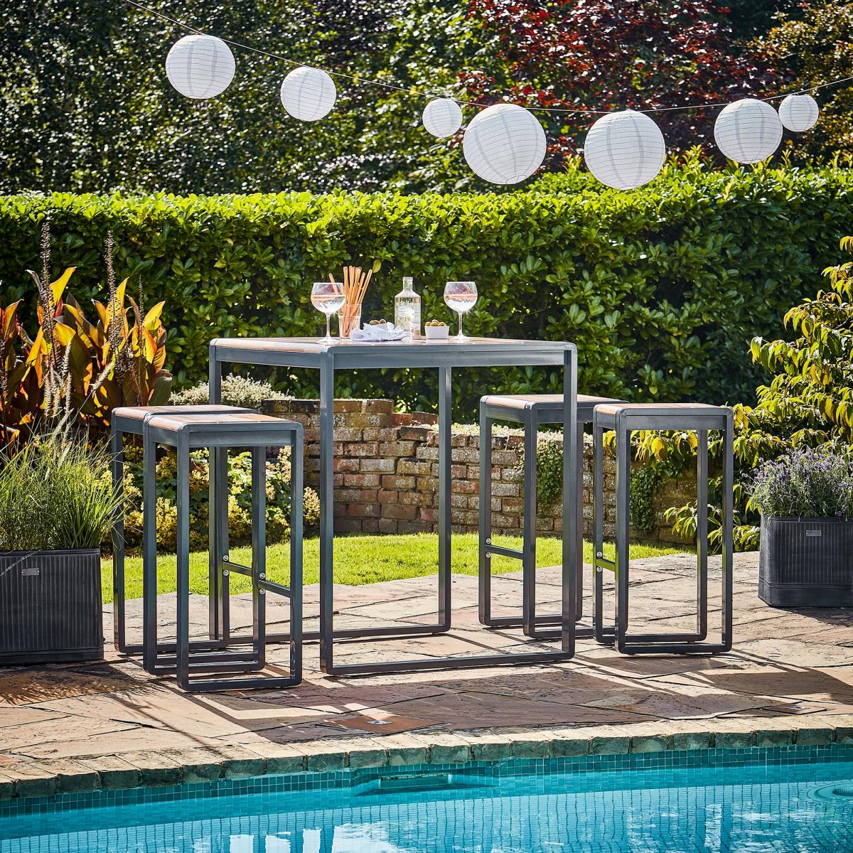 Accommodate your loved ones in both style and comfort with the Tall Spitalfields 5-Piece Furniture Set. Featuring an elongated, sleek wooden table and four square stools, the 5-Piece Set is supported by a strong powder-coated steel frame and is layered with UV stable resin – meaning that, whether it be raining or sunny, you can rest assured that your furniture will remain unblemished. In fact, not only is the Tall Spitalfields 5-Piece Furniture Set comprised of high quality, but you can also purchase a protective furniture cover – come on, let’s say yes to style this summer!