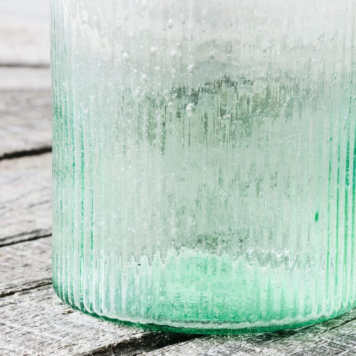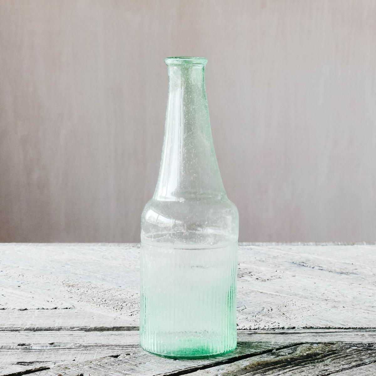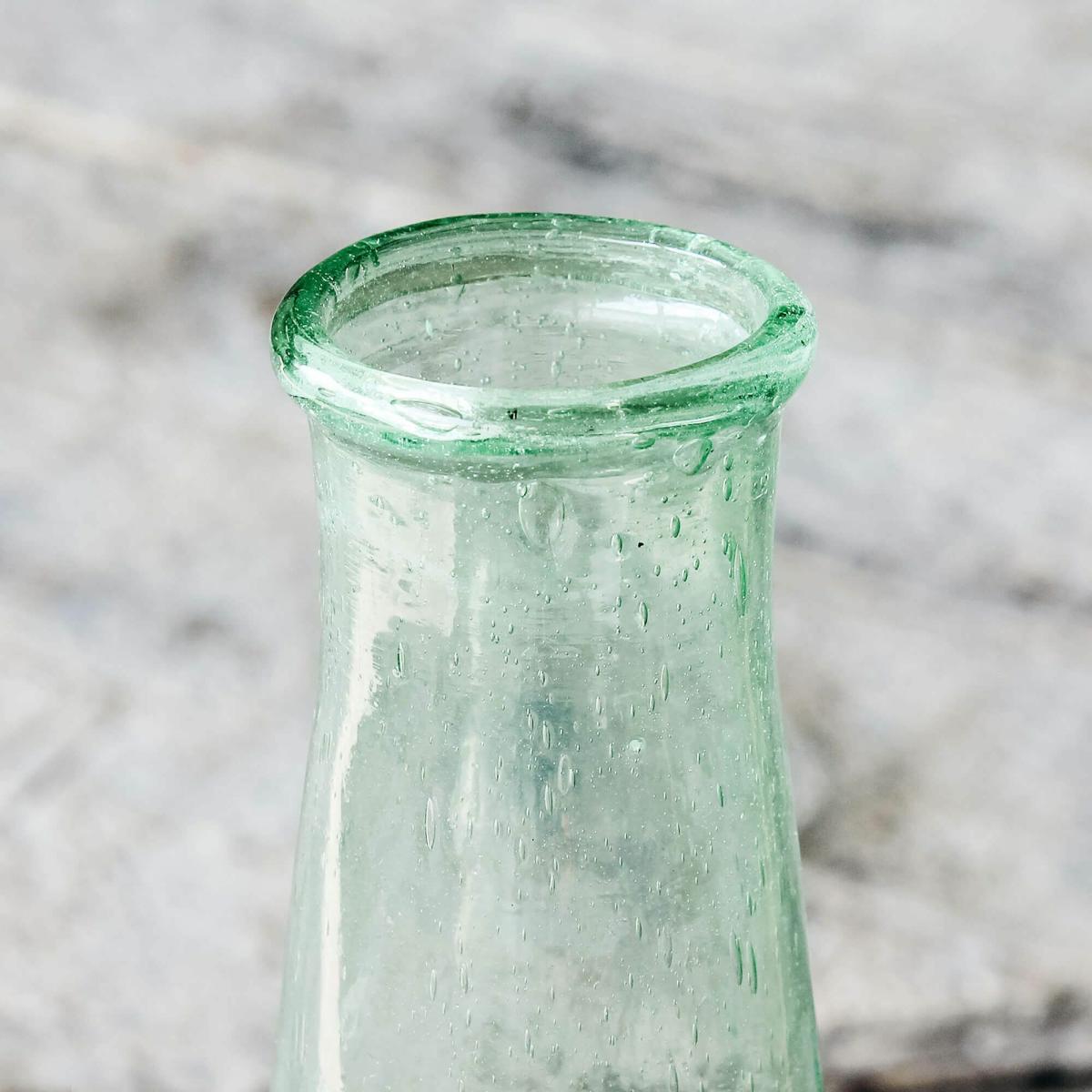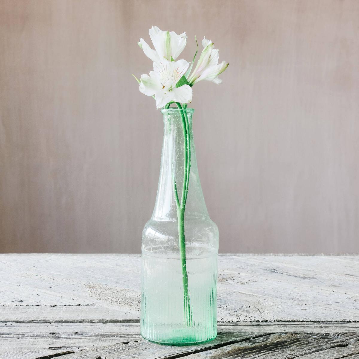 A tall green bottle vase with a tapered stem that is tinged in a fresh Spring green hue, pair this recycled glass vase with white and yellow flowers and lots of green foliage to refresh your home for the new season.