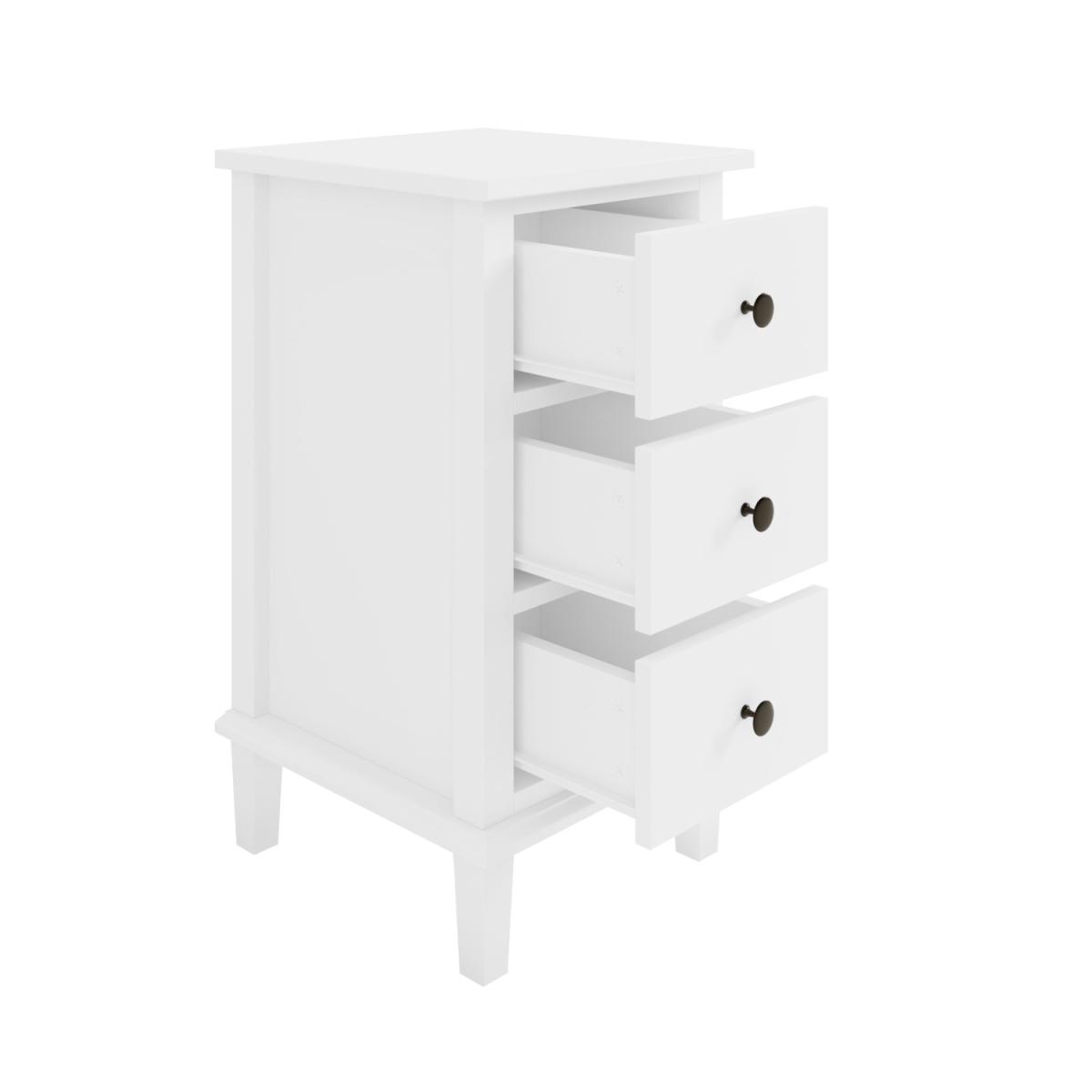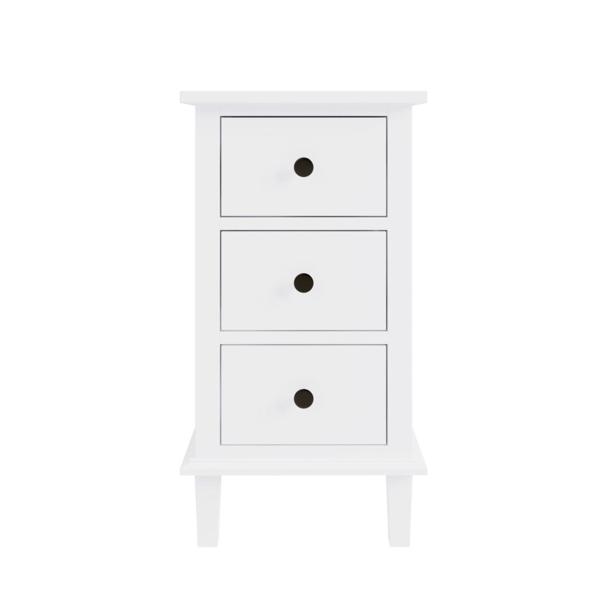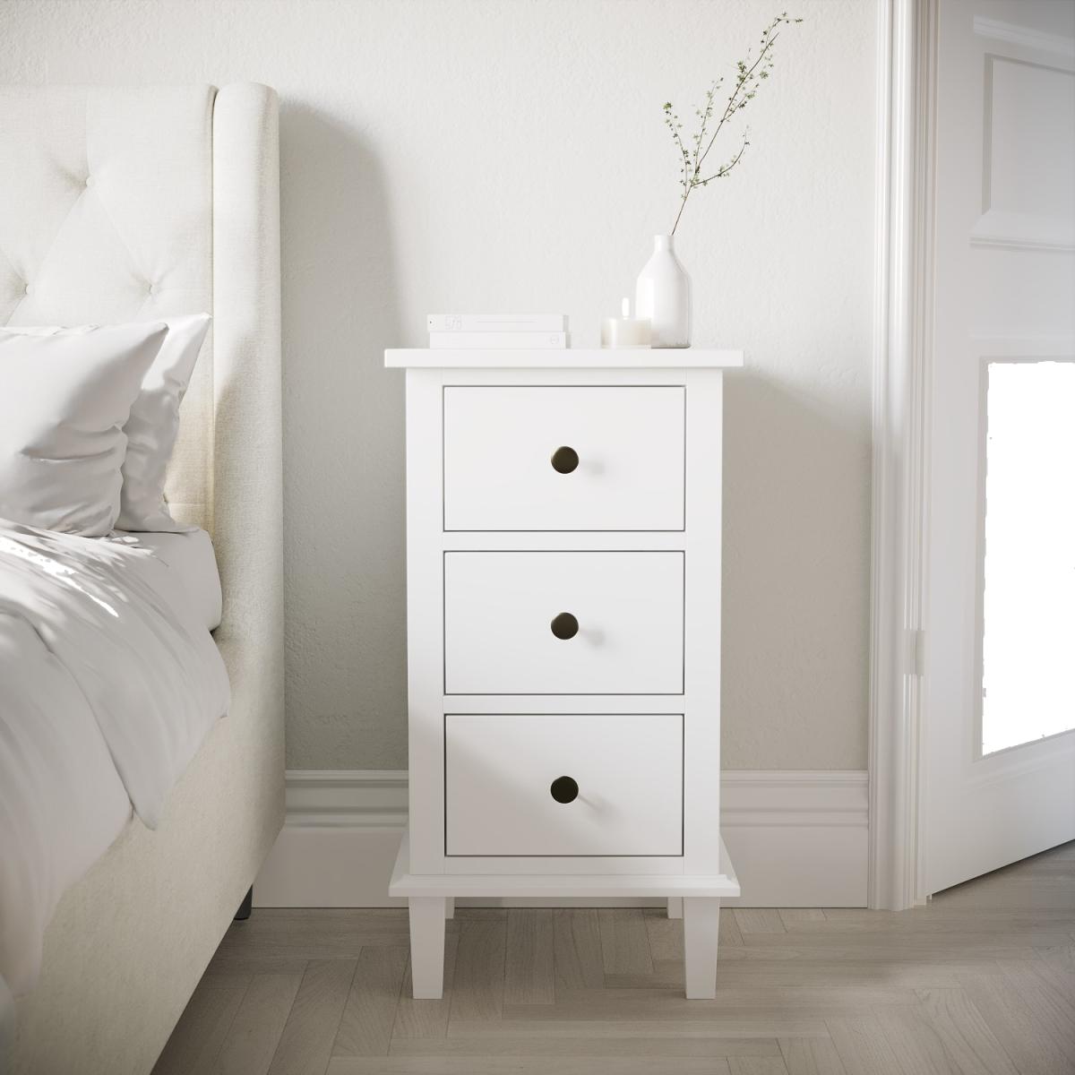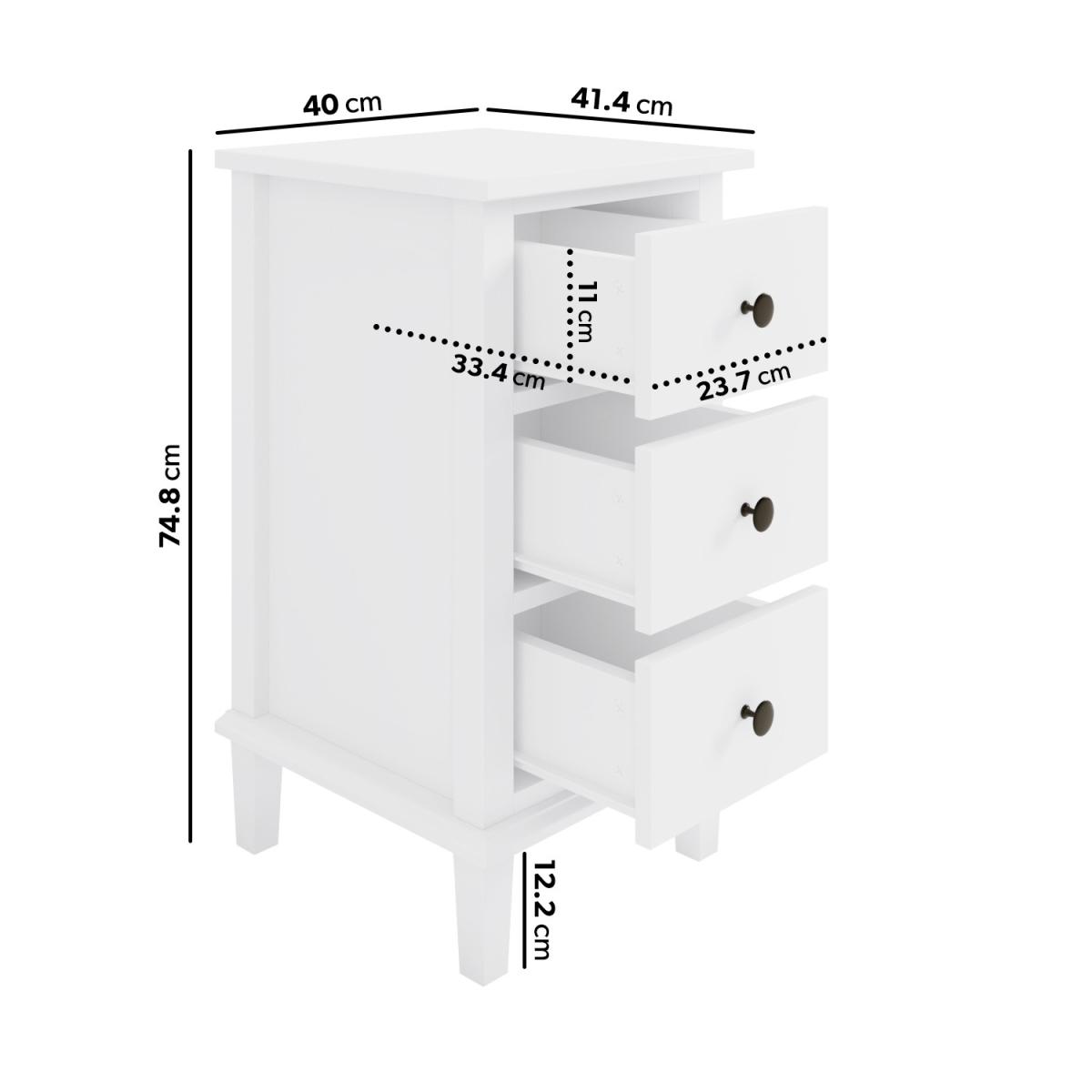 All about me Enhance your bedroom with this modern 3-drawer bedside table. With its clean Scandi lines and white painted finish, it's sure to complement any décor. Style it with the other pieces from the Marlowe bedroom furniture collection to complete the look. Need to know Product dimensions: W40 x D41.4 x H74.8 cm Base to floor height: 12.2cm Inner drawer dimensions:W23.7 x D33.4 x H11 cm Product weight: 12kg Number of drawers: 3 Colour: White Finish: Painted and antique brass (handles) Material: Solid pine wood (front, sides, top), MDF (back, drawer bases) and metal (handles and runners) Assembly required: Yes Packaging dimensions: W70.4 x D47.2 x H13.3 cm Packaging weights: 13.5kg
