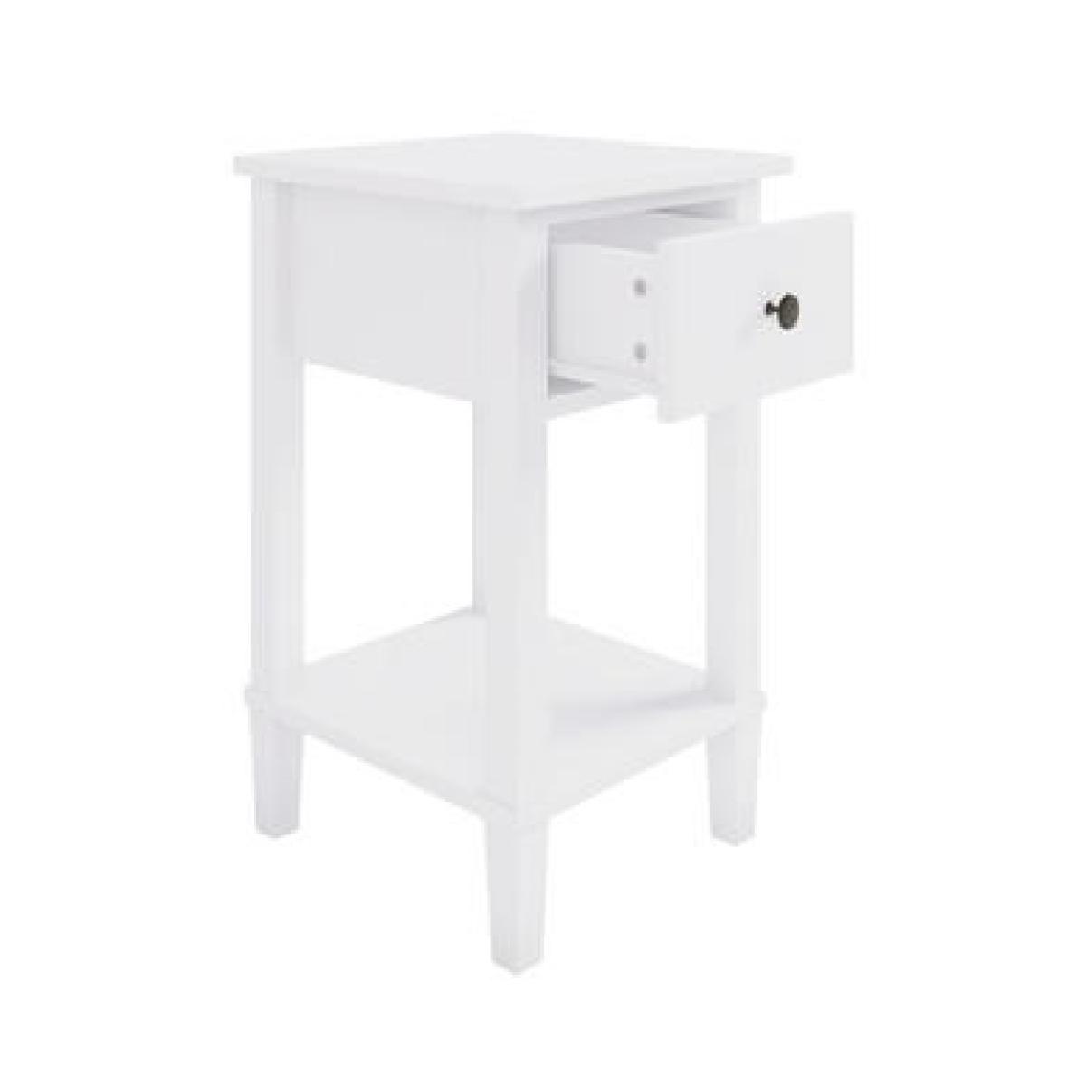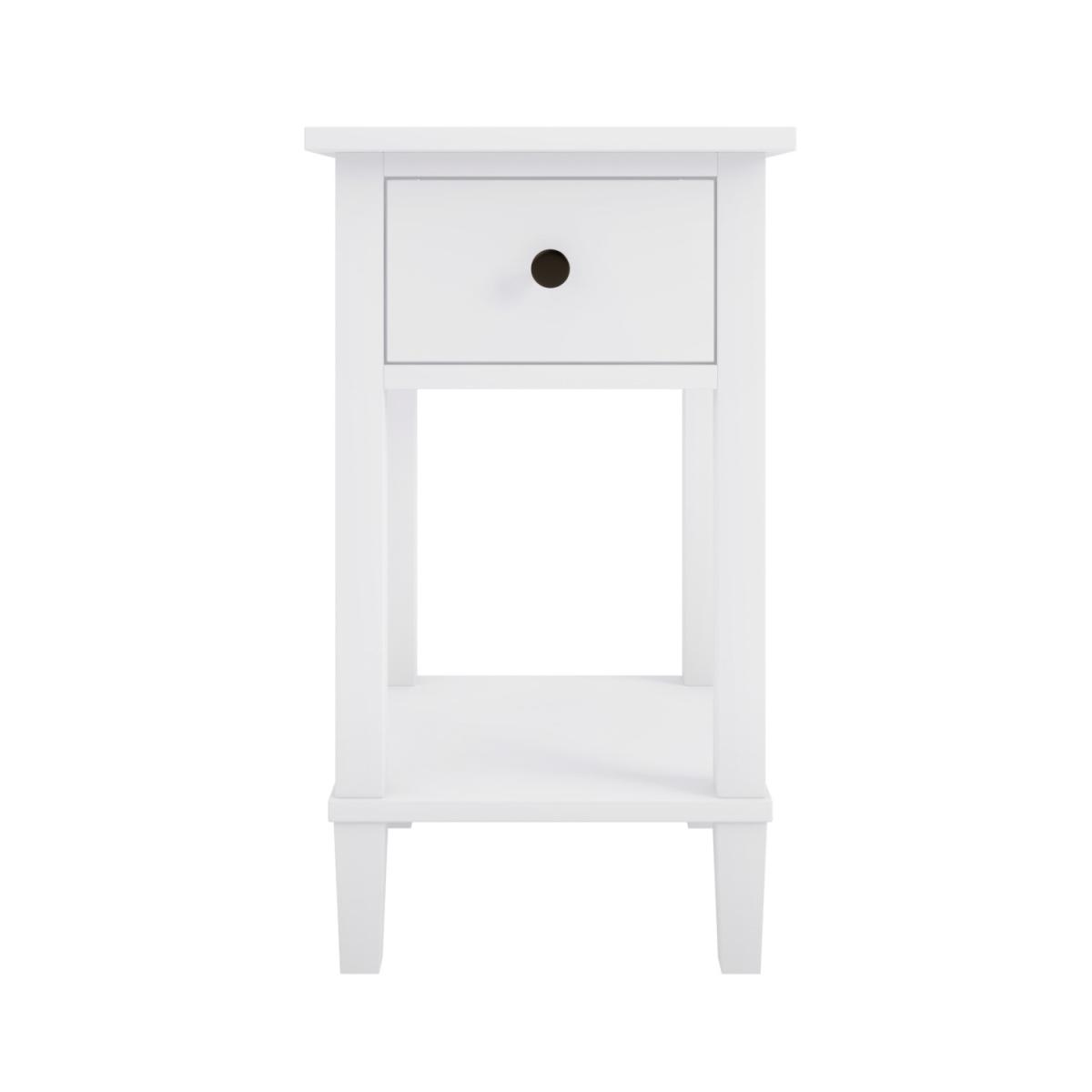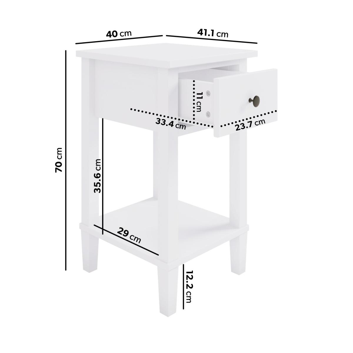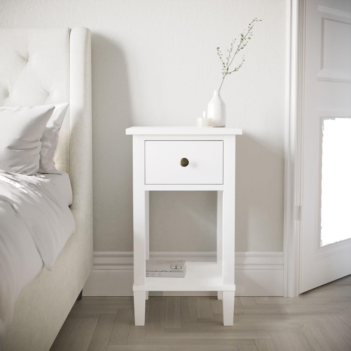 All about me Enhance your bedroom with this modern 1-drawer bedside table. With its clean Scandi lines and white painted finish, it's sure to complement any decor. Style it with the other pieces from the Marlowe bedroom furniture to complete the look. Need to know Product dimensions: W40 x D41.4 x H70 cm Base to floor height: 12.2cm Inner drawer dimensions:W23.7 x D33.4 x H11 cm Open shelf dimensions: W29 x D40 x H35.6 cm Product weight: 6.7kg Number of drawers: 1 Colour: White Finish: Painted and antique brass (handles) Material: Solid pine wood (front, sides, top), MDF (back, drawer bases) and metal (handles and runners) Assembly required: Yes Packaging dimensions:W62.5 x D53 x H90 cm Packaging weights: 7.8kg