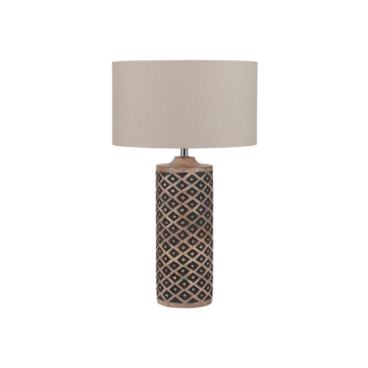 This cylindrical wooden base has been hand carved with diamond shapes to create a unique design. Paired with a taupe slubby cotton cylinder shade, this lamp makes a charming addition to any living area.